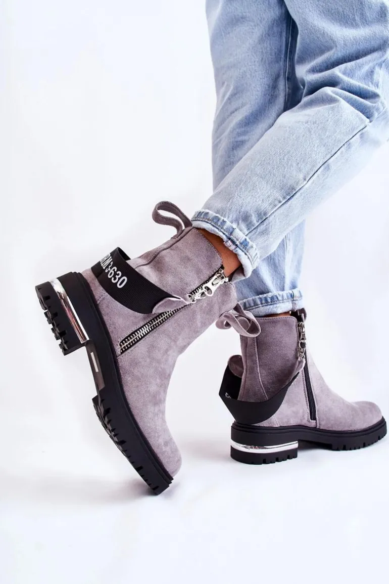 Botki damskie zostały wykonane z eko zamszu. Wnętrze ocieplone jest miłym w dotyku kocem obuwniczym. Dołączony do butów pasek jest odpinany. Botki posiadają dwa zamki, gdzie jeden z nich jest nieodpinany. Buty te osadzono na płaskim obcasie z lustrzaną wstawką i podeszwie z bieżnikiem. Świetny model do wielu jesiennych stylizacji! Przy wyborze rozmiaru prosimy sugerować się tabelą rozmiarów.