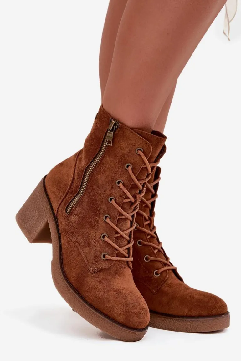 Botki damskie wykonane z eko zamszu. Osadzone na stabilnym obcasie typu słupek, subtelnie podkreślają sylwetkę, a dzięki sznurowaniu można je idealnie dopasować do stopy. Posiadają zapięcie na zamek, co ułatwia zakładanie oraz dodatkowy ozdobny suwak, który nadaje całości modnego charakteru. Wnętrze butów zostało ocieplone kocem obuwniczym, co gwarantuje komfort termiczny w chłodniejsze dni. To idealny wybór do codziennych i casualowych stylizacji.