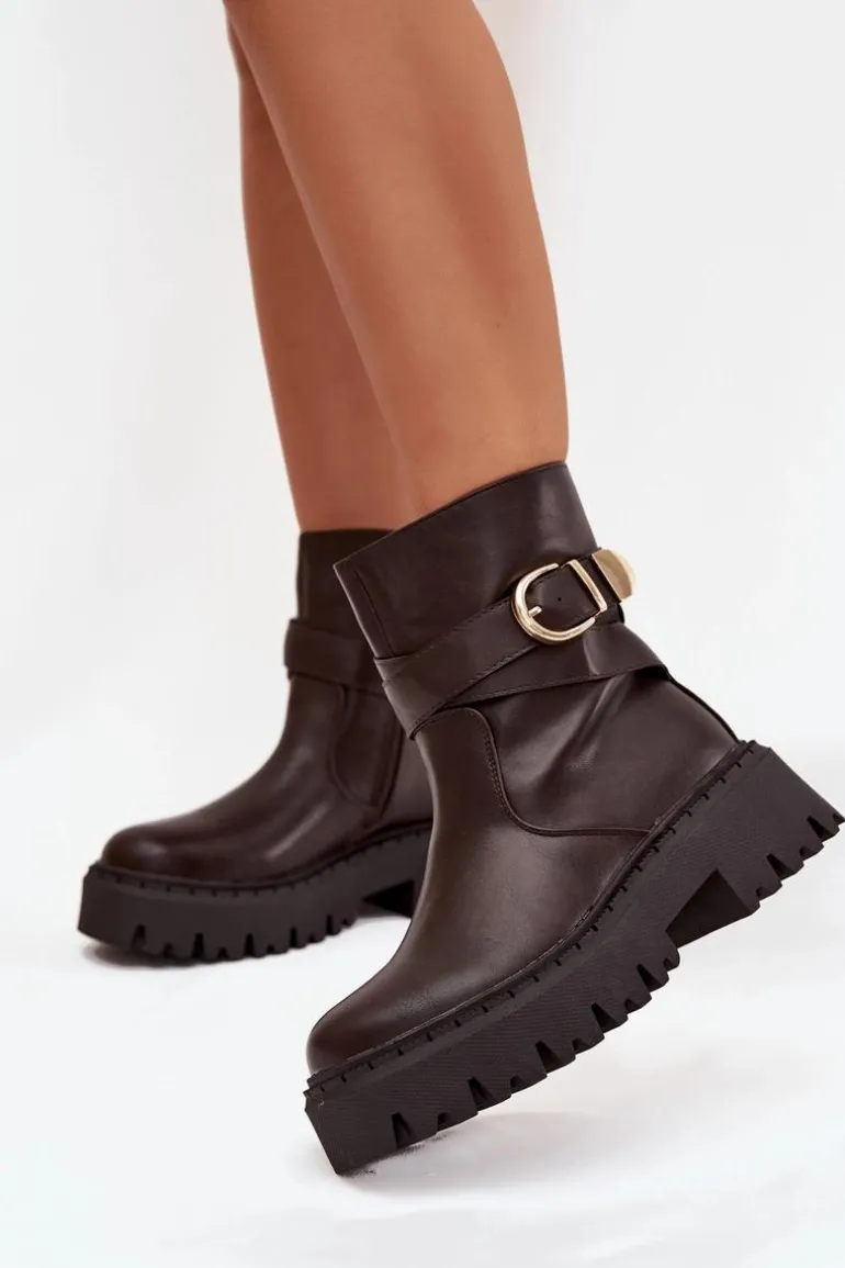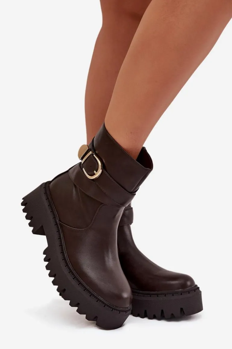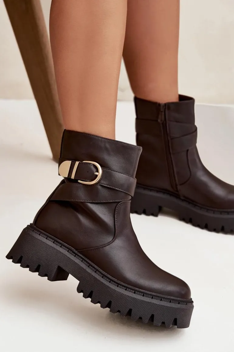 Damskie botki wykonane z eko skóry. Osadzone na platformie z płaskim obcasem zapewniają wygodę i stabilność podczas chodzenia. Wnętrze ocieplane miękkim kocem obuwniczym gwarantuje komfort oraz ciepło, nawet w zimniejsze dni. Botki zapinane są na praktyczny zamek, dzięki czemu łatwo się je zakłada i zdejmuje. Dodatkowym akcentem jest stylowy pasek z klamrą na cholewce, który nadaje całości modnego, nieco rockowego charakteru. Świetnie sprawdzą się w casualowych stylizacjach z jeansami, jak i w zestawieniach z sukienką czy spódnicą. Przy wyborze rozmiaru prosimy sugerować się tabelą rozmiarów.