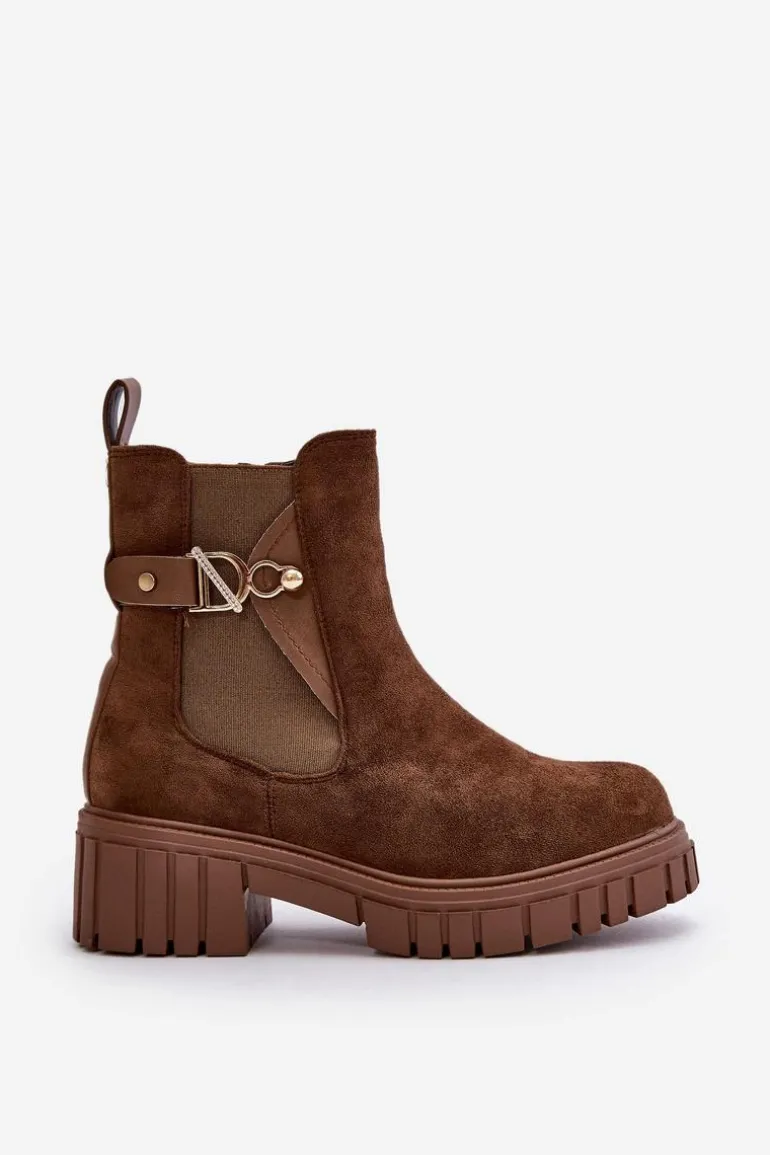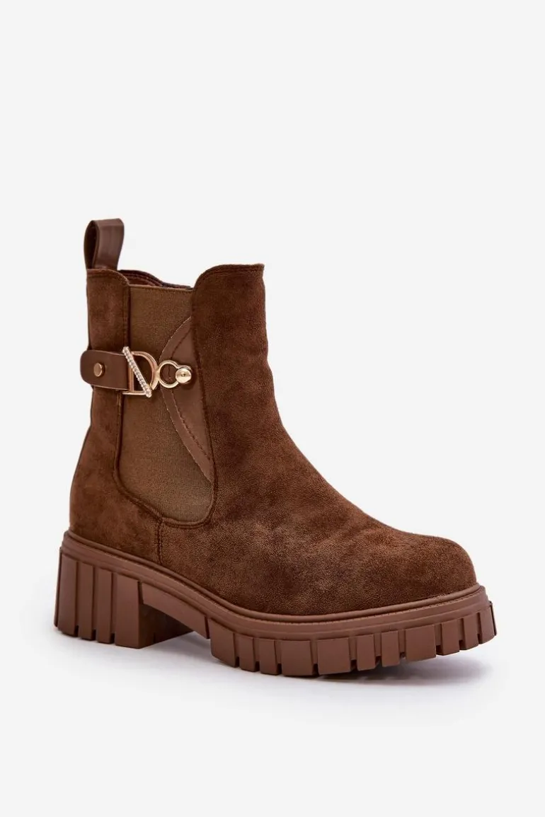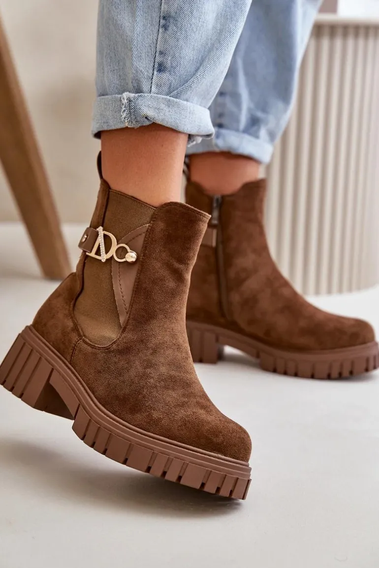 Botki damskie wykonane z miękkiego eko zamszu. Wnętrze ocieplone kocem obuwniczym sprawia, że są one doskonałym rozwiązaniem na chłodne dni. Wyróżniającym się elementem tego modelu jest złoty detal, który dodaje im wyjątkowego uroku i elegancji. Zapinanie na zamek ułatwia zakładanie i zdejmowanie obuwia. Doskonale sprawdzą się w połączeniu z różnymi elementami garderoby, od jeansów po eleganckie sukienki, podkreślając unikalny styl każdej kobiety. Przy wyborze rozmiaru prosimy sugerować się tabelą rozmiarów.