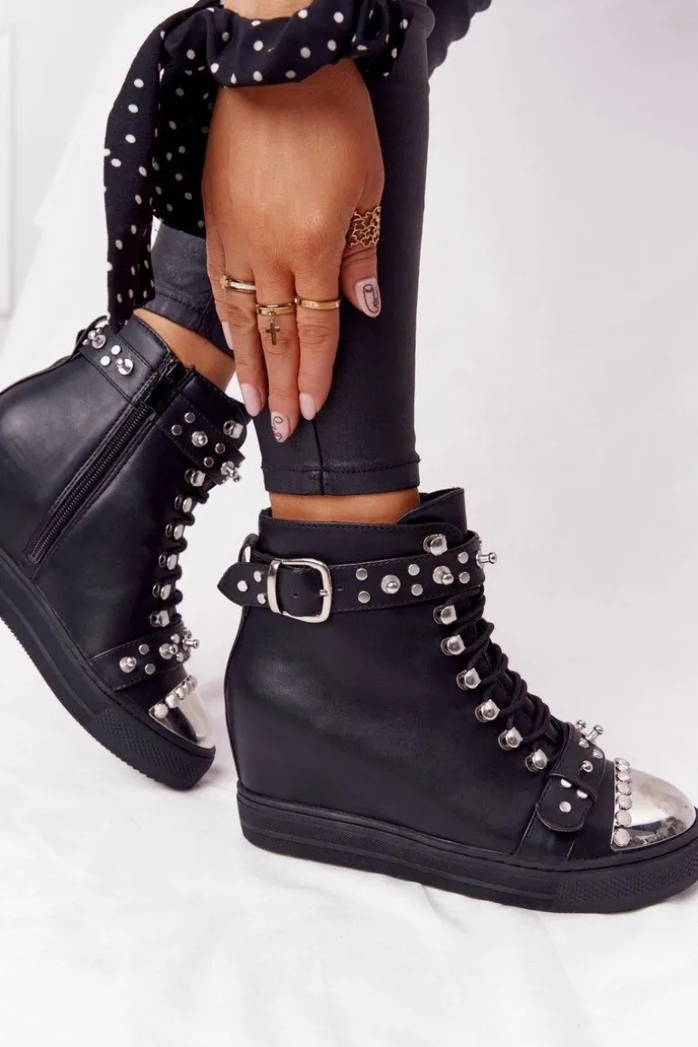 Wyjątkowe botki na koturnie z dżetami i klamrami. Buty wykonane są z eko skóry, posiadają ocieplenie w postaci koca obuwniczego. Botki świetnie wpiszą się w stylizacje glam rock lub grunge. Koniecznie sprawdź całą naszą kolekcje damskich botków! Przy wyborze rozmiaru prosimy sugerować się tabelą rozmiarów.