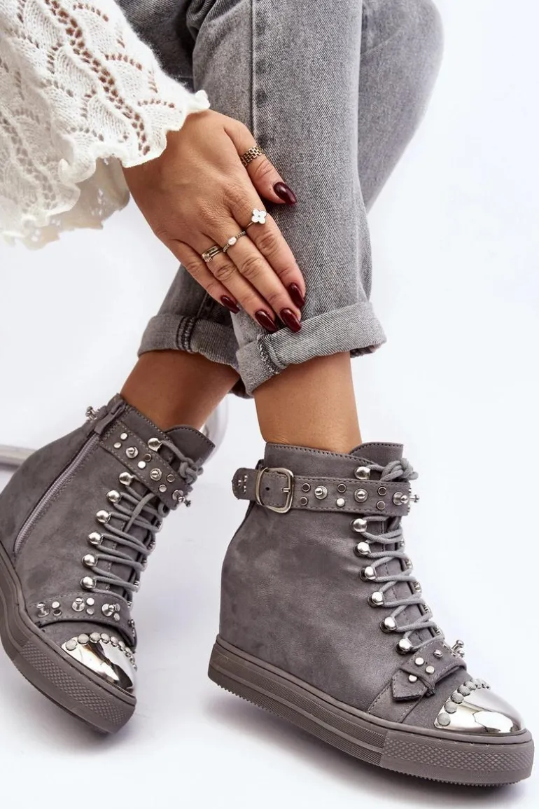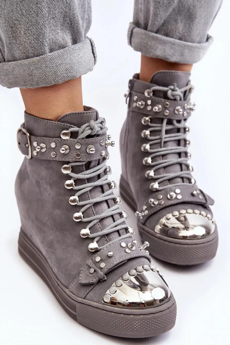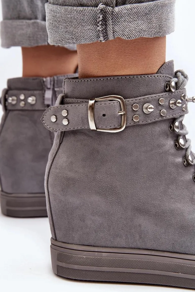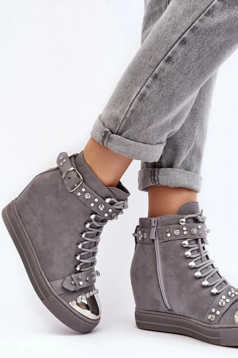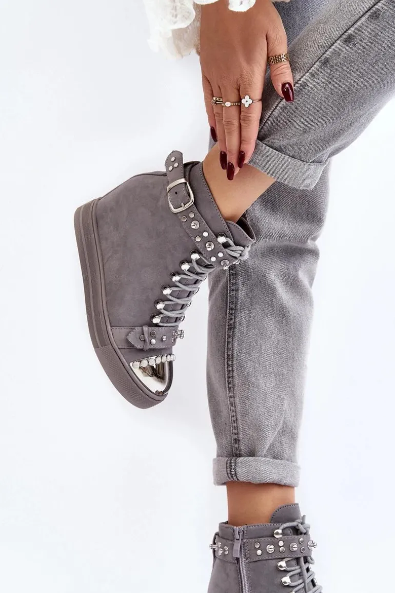 Wyjątkowe botki na koturnie z dżetami i klamrami. Buty wykonane są z eko zamszu, posiadają ocieplenie w postaci koca obuwniczego. Botki świetnie wpiszą się w stylizacje glam rock lub grunge. Koniecznie sprawdź całą naszą kolekcje damskich botków! Przy wyborze rozmiaru prosimy sugerować się tabelą rozmiarów.