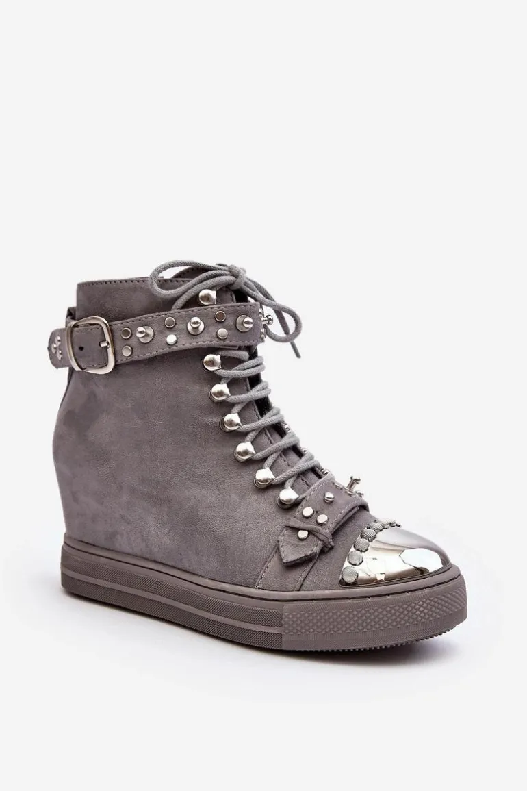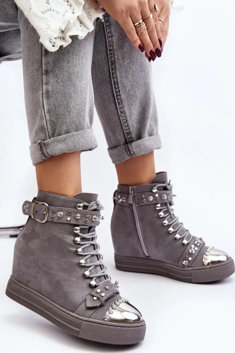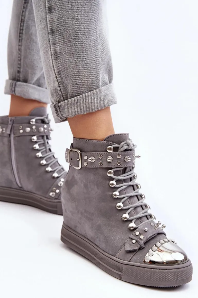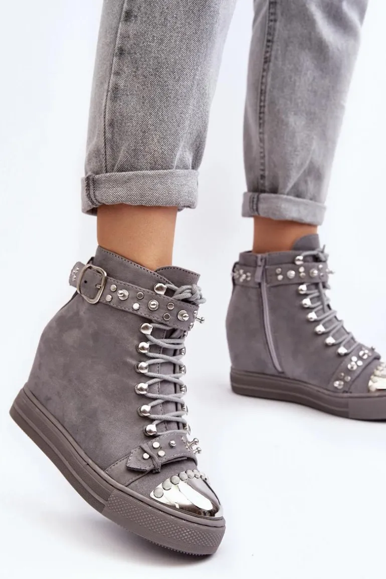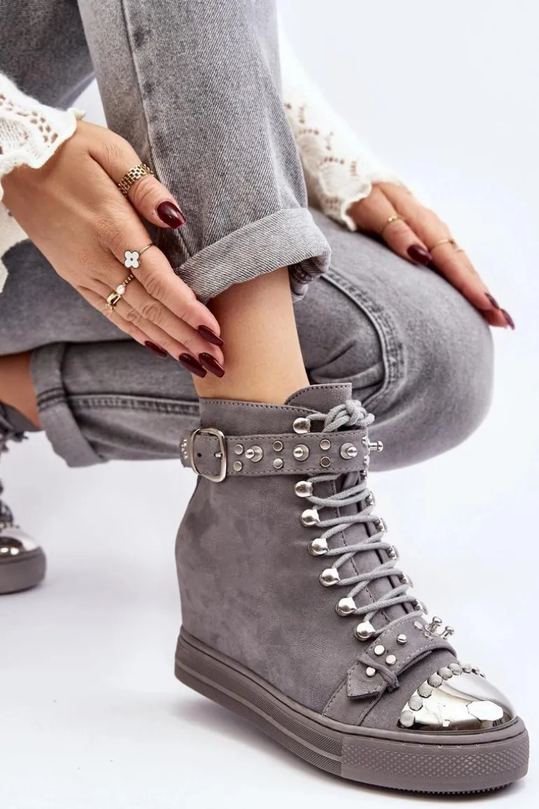 Wyjątkowe botki na koturnie z dżetami i klamrami. Buty wykonane są z eko zamszu, posiadają ocieplenie w postaci koca obuwniczego. Botki świetnie wpiszą się w stylizacje glam rock lub grunge. Koniecznie sprawdź całą naszą kolekcje damskich botków! Przy wyborze rozmiaru prosimy sugerować się tabelą rozmiarów.