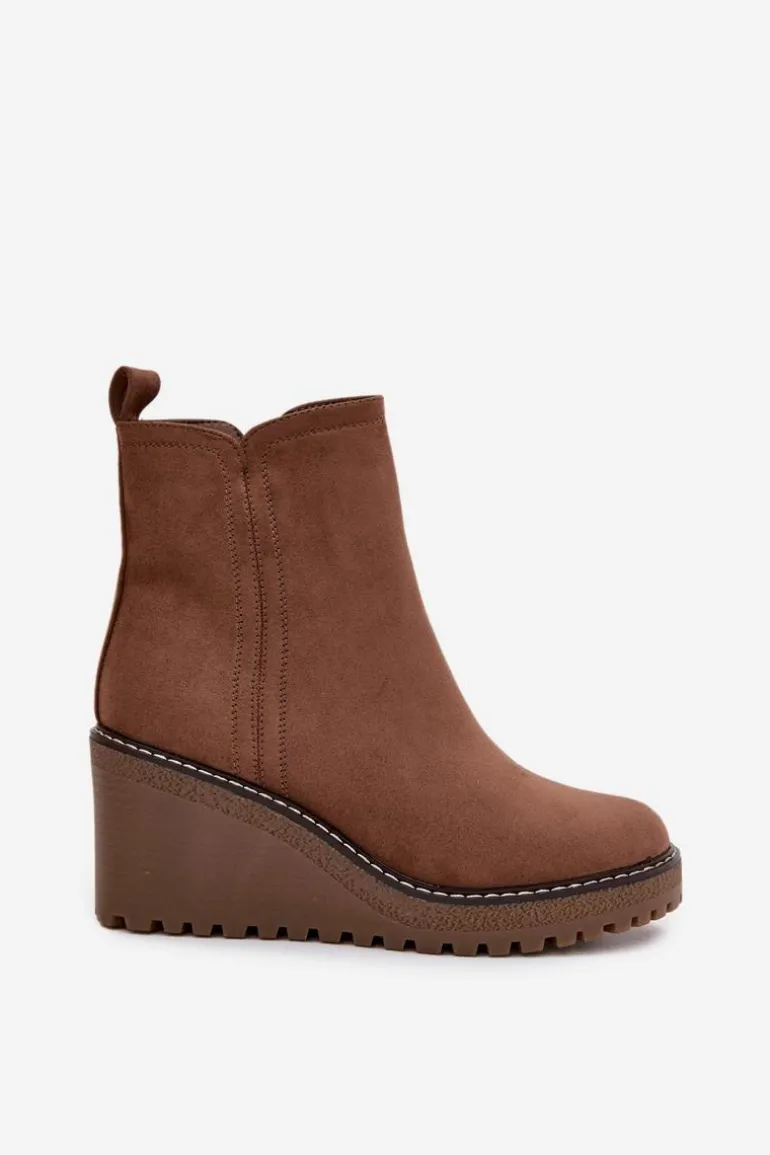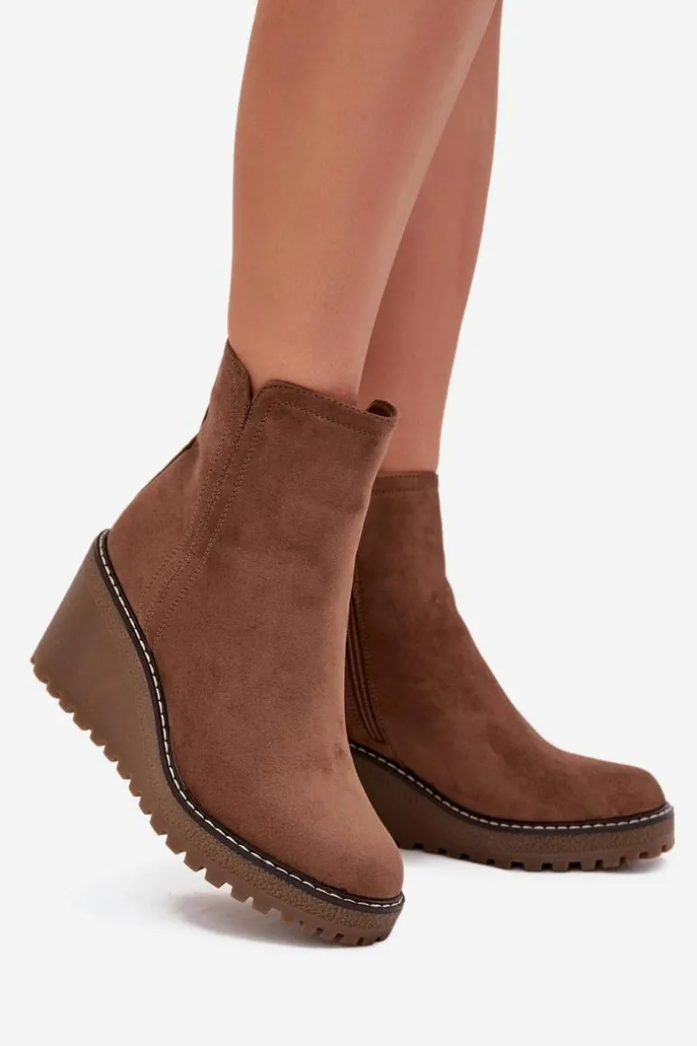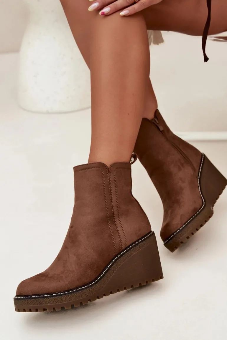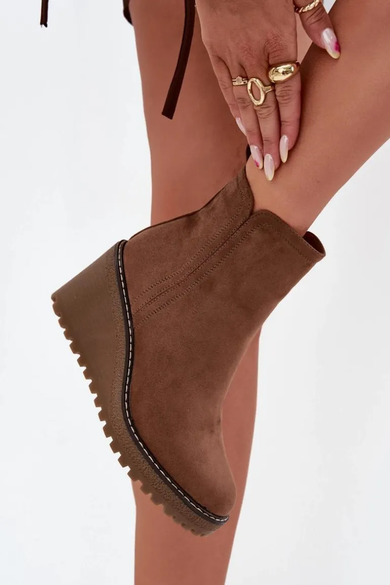 Botki damskie z eko zamszu na koturnie to elegancka i wygodna opcja na chłodniejsze dni. Ocieplane kocem obuwniczym, zapewniają ciepło, a zapinane na zamek ułatwiają zakładanie. Koturna dodaje kilku centymetrów wzrostu. Idealne na co dzień, te botki będą doskonałym uzupełnieniem zimowych stylizacji. Przy wyborze rozmiaru prosimy sugerować się tabelą rozmiarów.