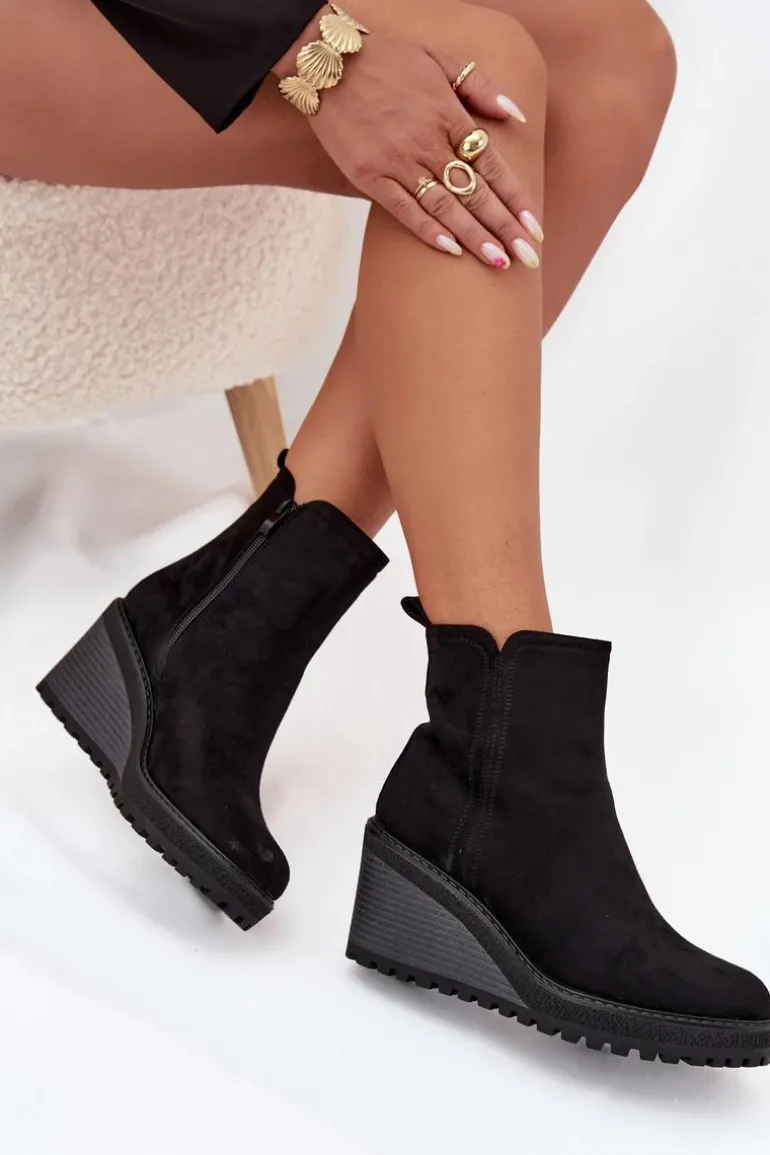Botki damskie z eko zamszu na koturnie to elegancka i wygodna opcja na chłodniejsze dni. Ocieplane kocem obuwniczym, zapewniają ciepło, a zapinane na zamek ułatwiają zakładanie. Koturna dodaje kilku centymetrów wzrostu. Idealne na co dzień, te botki będą doskonałym uzupełnieniem zimowych stylizacji. Przy wyborze rozmiaru prosimy sugerować się tabelą rozmiarów.