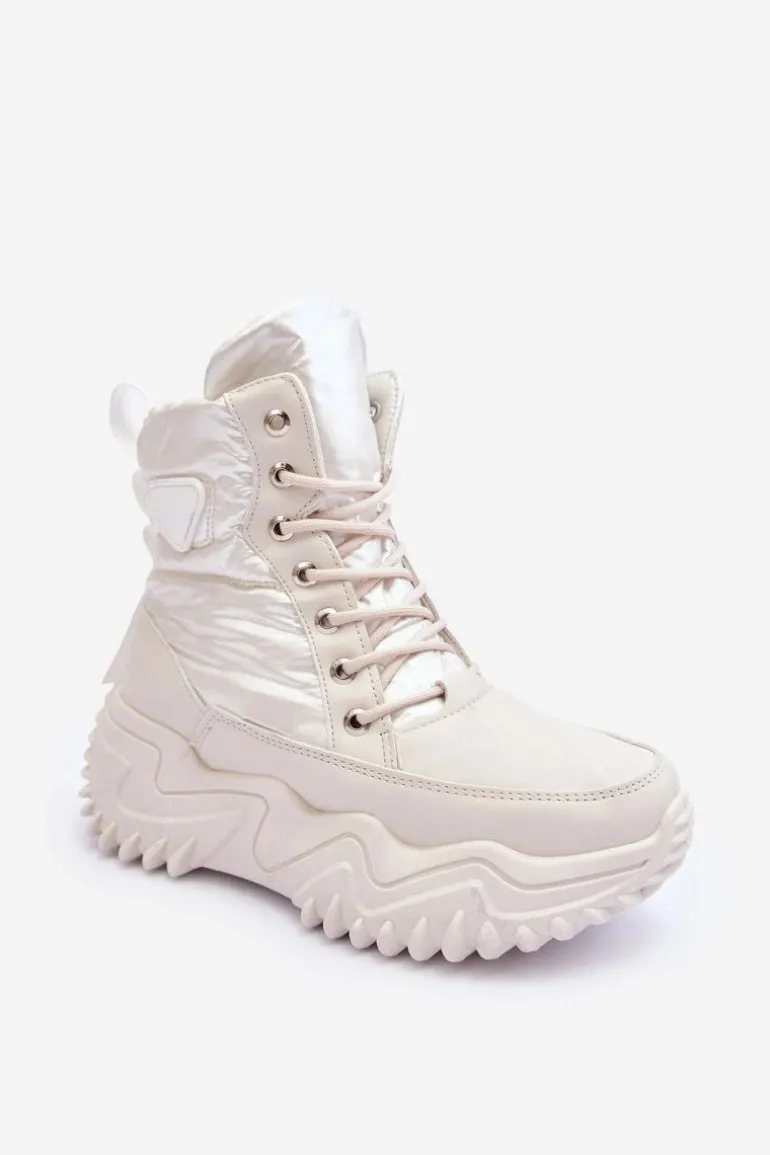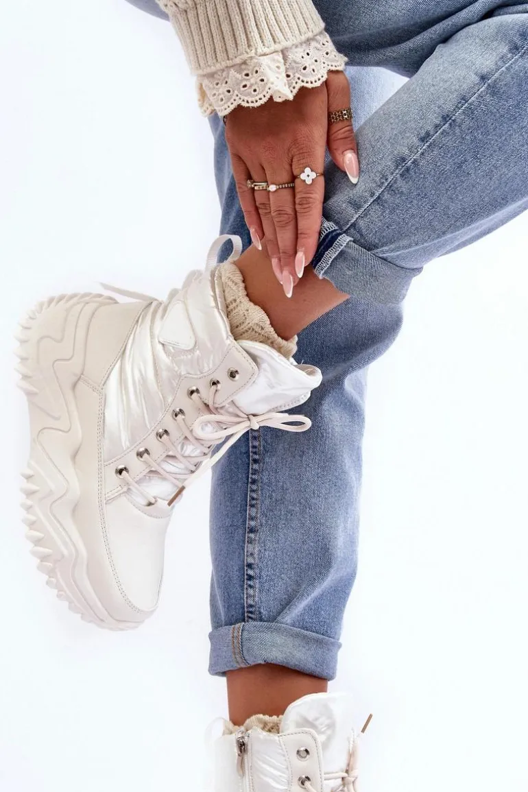 Botki damskie w sportowym stylu. Osadzone na masywnej platformie. Wewnątrz znajduje się ciepłe i miłe w dotyku futerko. Zapinane na suwak po wewnętrznej stronie cholewki oraz dodatkowo sznurowane. Buty idealnie sprawdzą się w zimowe dni! Przy wyborze rozmiaru prosimy sugerować się tabelą rozmiarów.