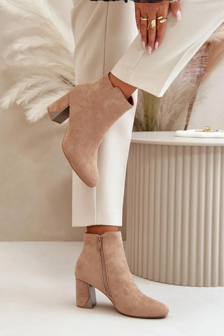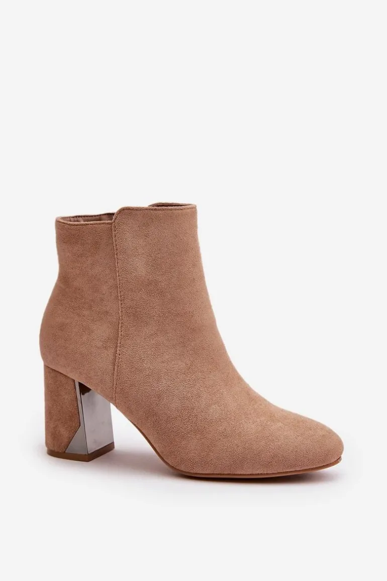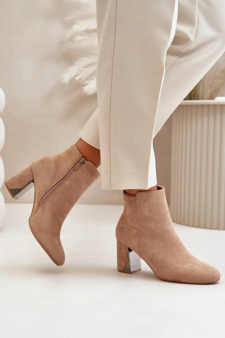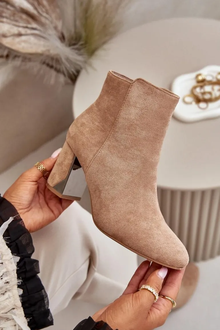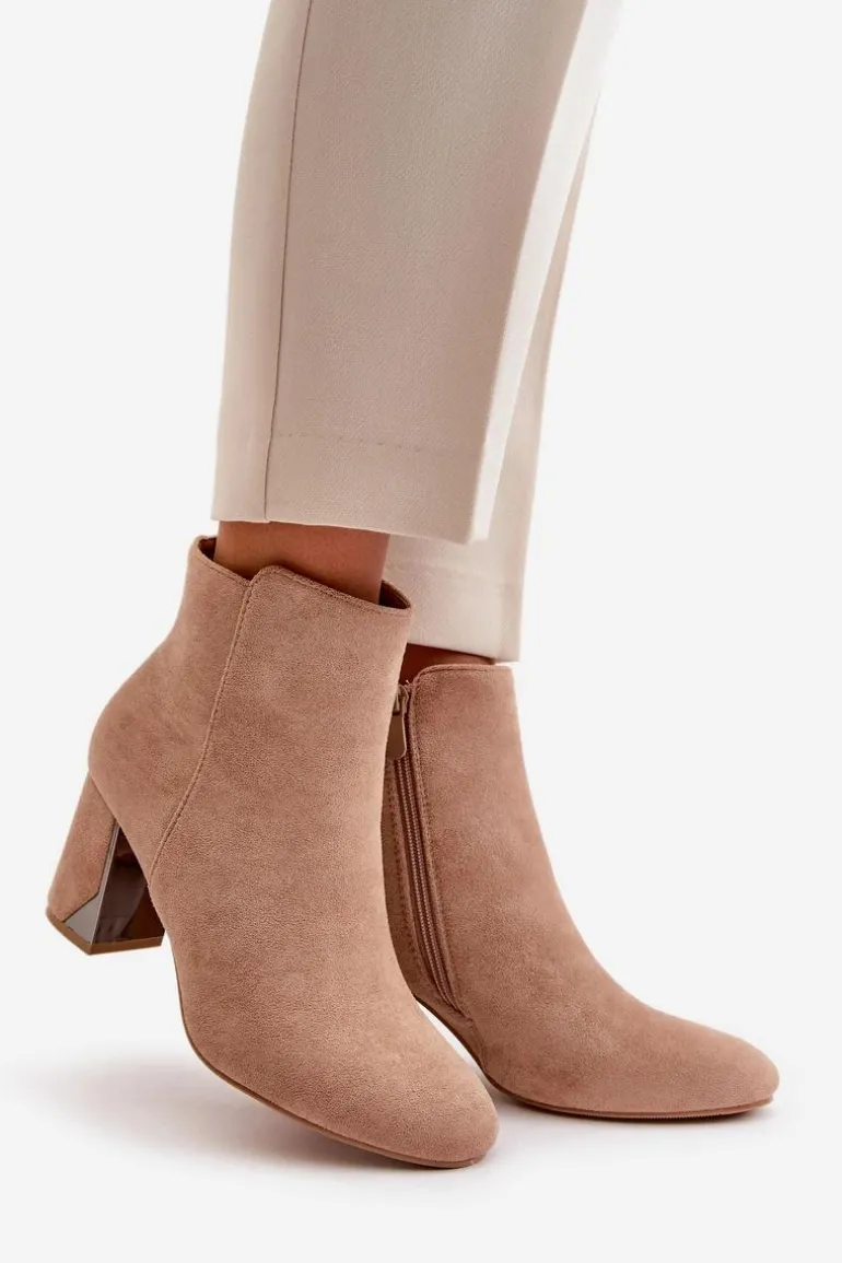Botki damskie wykonane z eko zamszu. Osadzone na obcasie typu słupek wraz z lustrzanym elementem. Wnętrze ocieplone jest kocem obuwniczym, co zapewni ciepło w chłodniejsze dni. Zapinane na zamek. Noski zaokrąglone. Usztywniony zapiętek zwiększy stabilizację stopy. Przy wyborze rozmiaru prosimy sugerować się tabelą rozmiarów.
