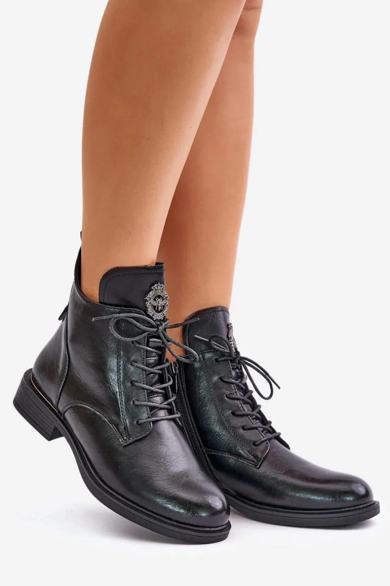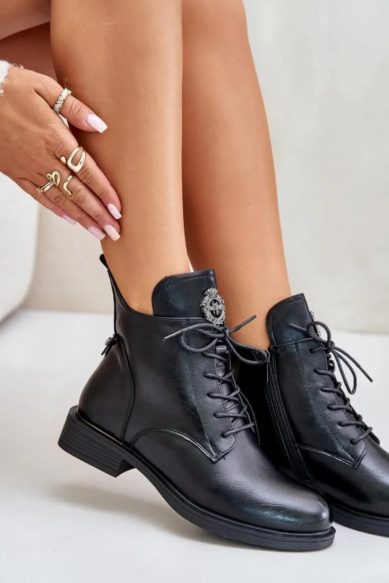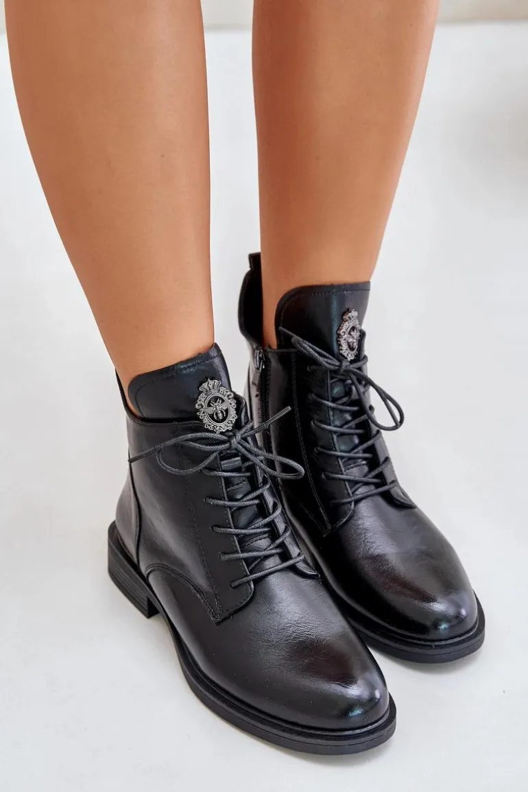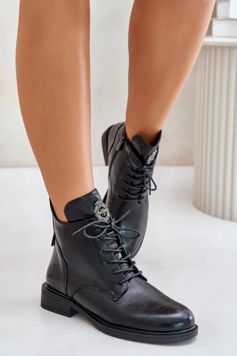 Ocieplane Botki Na Płaskim Obcasie Z Ozdobą Czarne Leonise