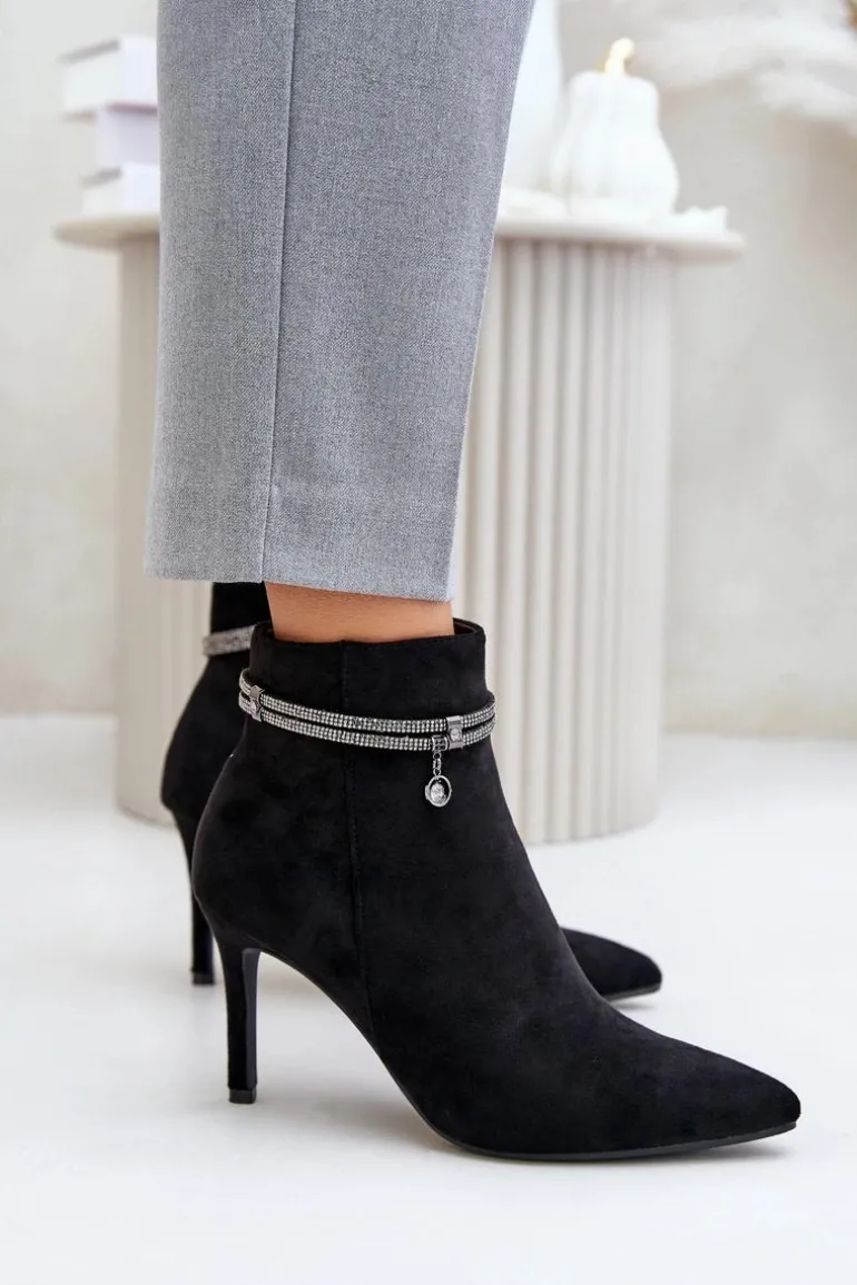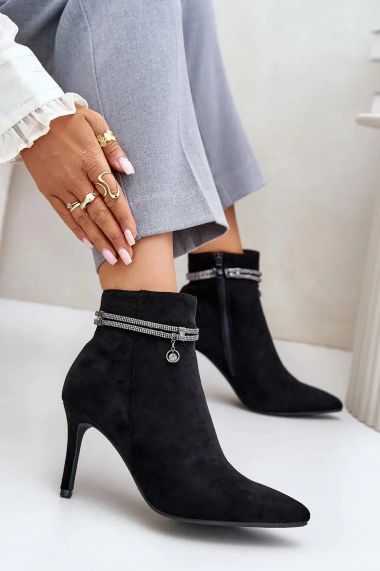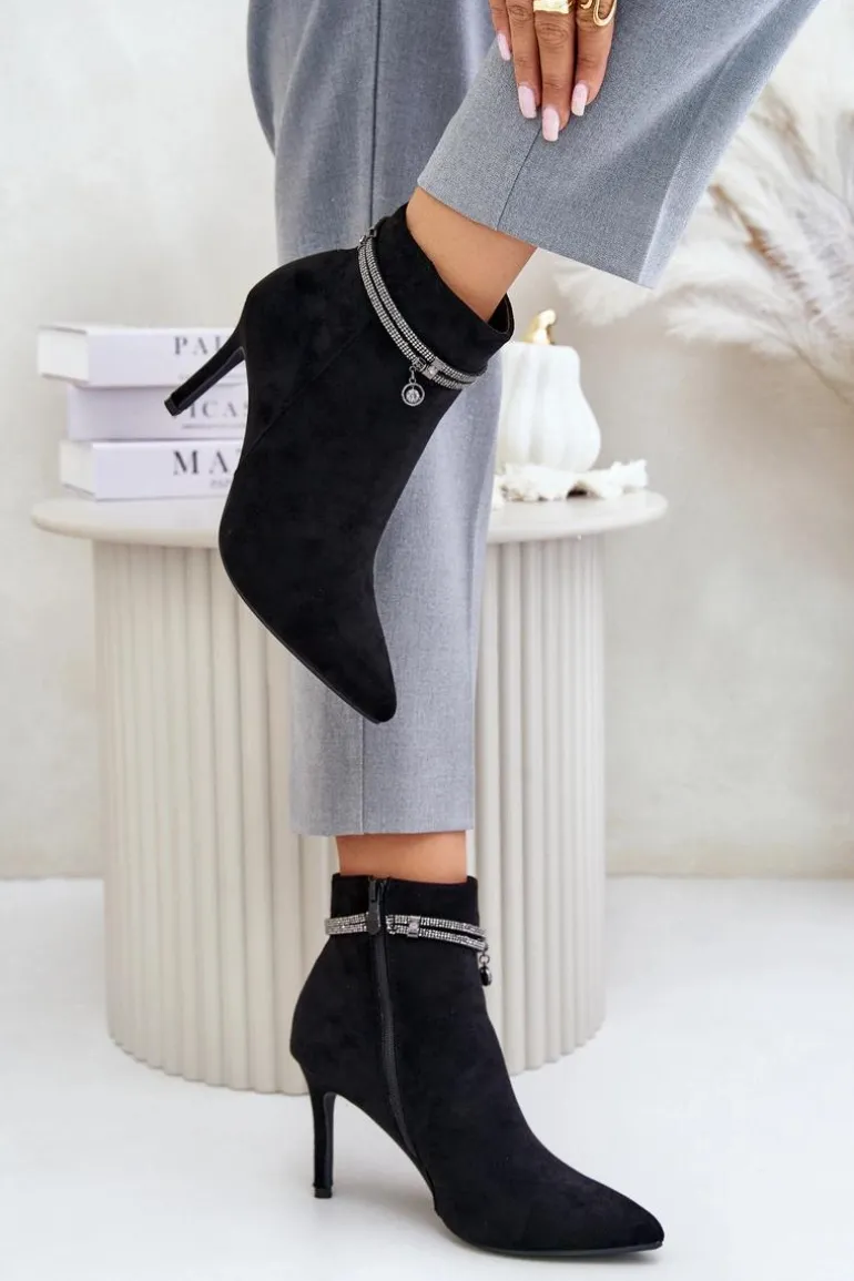 Eleganckie botki damskie wykonane z eko zamszu. Osadzone na obcasie w postaci szpilki. Na cholewce dwa zdobione paski, które nadają wyjątkowego uroku. Model zapinany na suwak z boku. Noski w szpic optycznie wysmuklą nogi. Dodatkowo zapiętek jest usztywniony. Idealnie sprawdzą się na wieczorne wyjścia! Przy wyborze rozmiaru prosimy sugerować się tabelą rozmiarów.