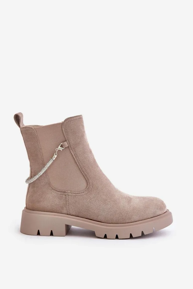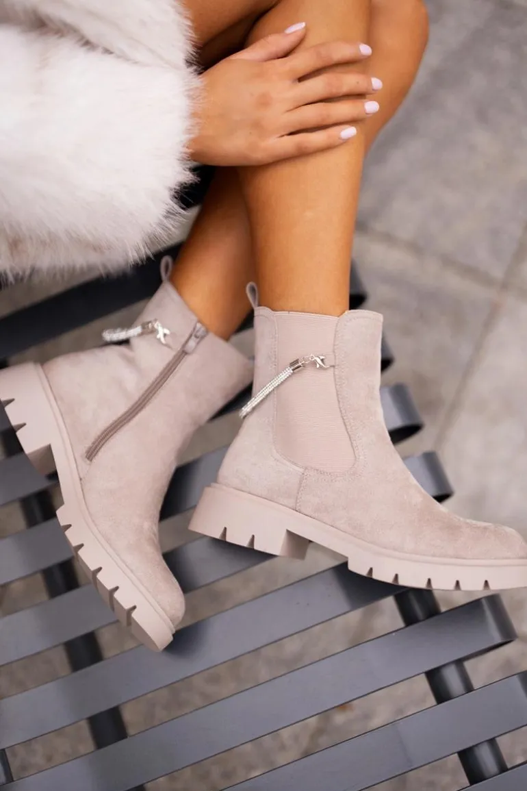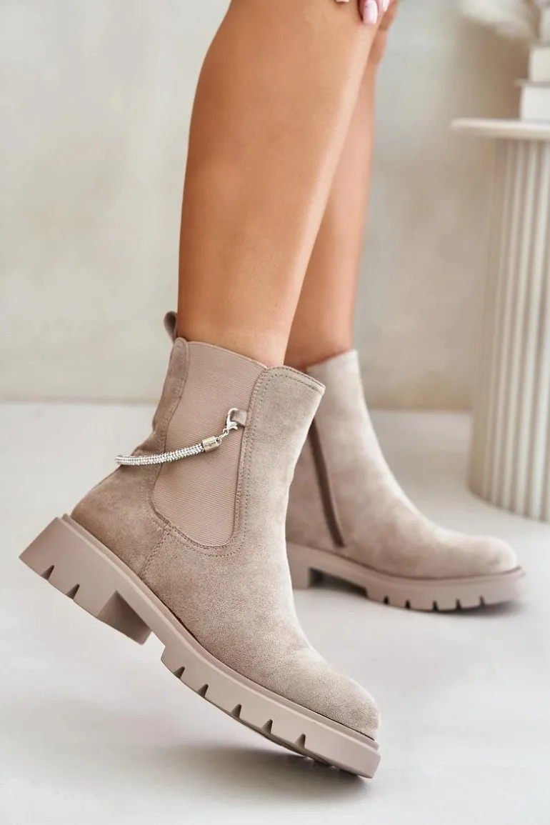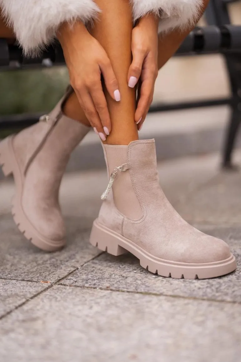Botki damskie wykonane z eko zamszu. Model ten wyróżnia się ozdobnym, błyszczącym, odpinanym paseczkiem, który nadaje wyjątkowego uroku. Środek ocieplany kocem obuwniczym, co zapewni ciepło i komfort w chłodniejsze dni. Przy wyborze rozmiaru prosimy sugerować się tabelą rozmiarów.