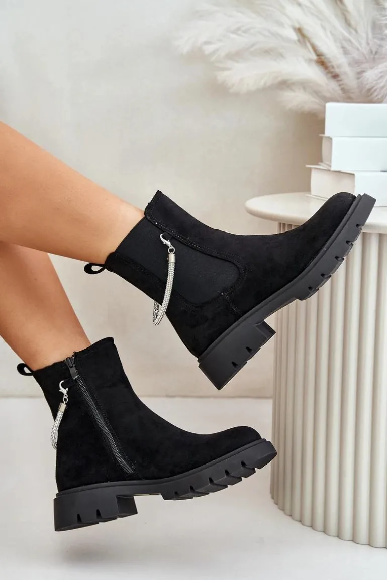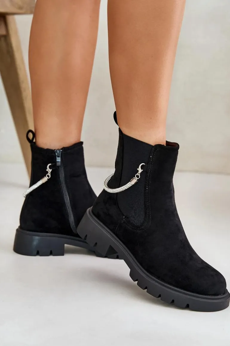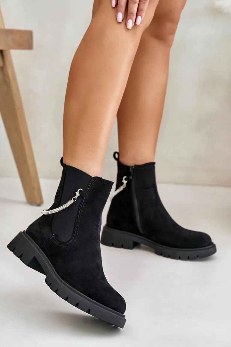 Botki damskie wykonane z eko zamszu. Model ten wyróżnia się ozdobnym, błyszczącym, odpinanym paseczkiem, który nadaje wyjątkowego uroku. Środek ocieplany kocem obuwniczym, co zapewni ciepło i komfort w chłodniejsze dni. Przy wyborze rozmiaru prosimy sugerować się tabelą rozmiarów.