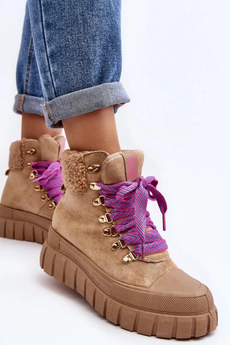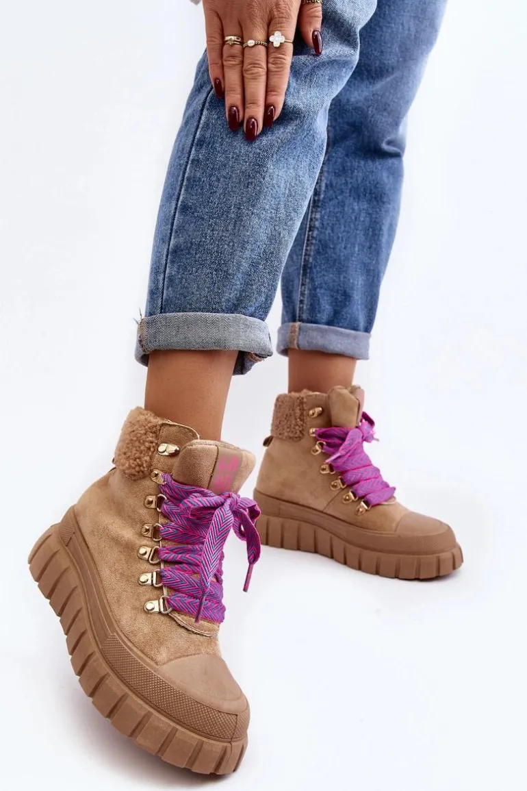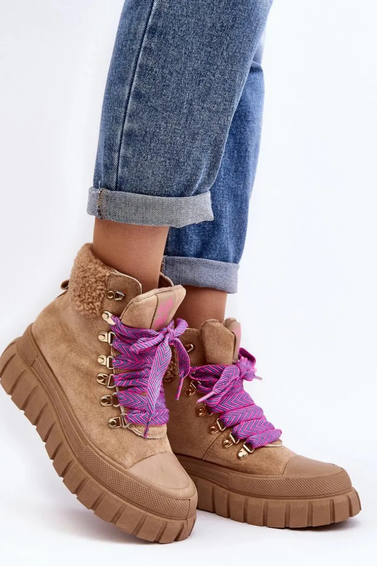 Damskie trapery zostały wykonane z eko zamszu. Osadzone na masywnej platformie z gumowego tworzywa. Wnętrze zostało ocieplone kocem obuwniczym, co zapewnia komfort i ciepło podczas chłodniejszych dni. Noski są zaokrąglone, co dodaje butom subtelnego uroku. Model klasycznie sznurowany. Modne obuwie stanowi doskonały dodatek do Twojej szafy! Przy wyborze rozmiaru prosimy sugerować się tabelą rozmiarów.