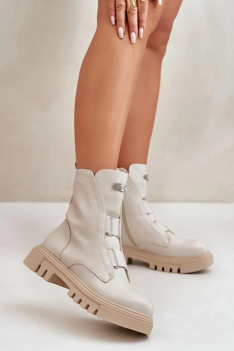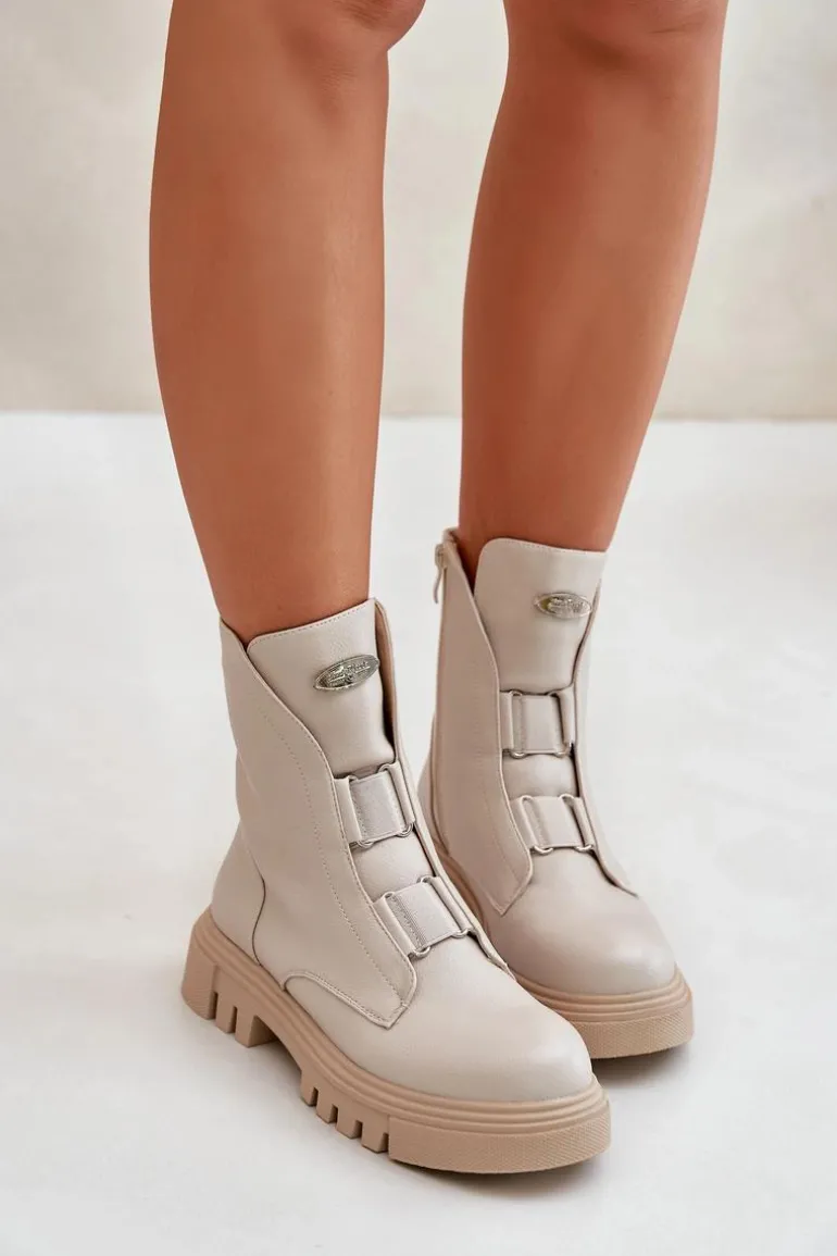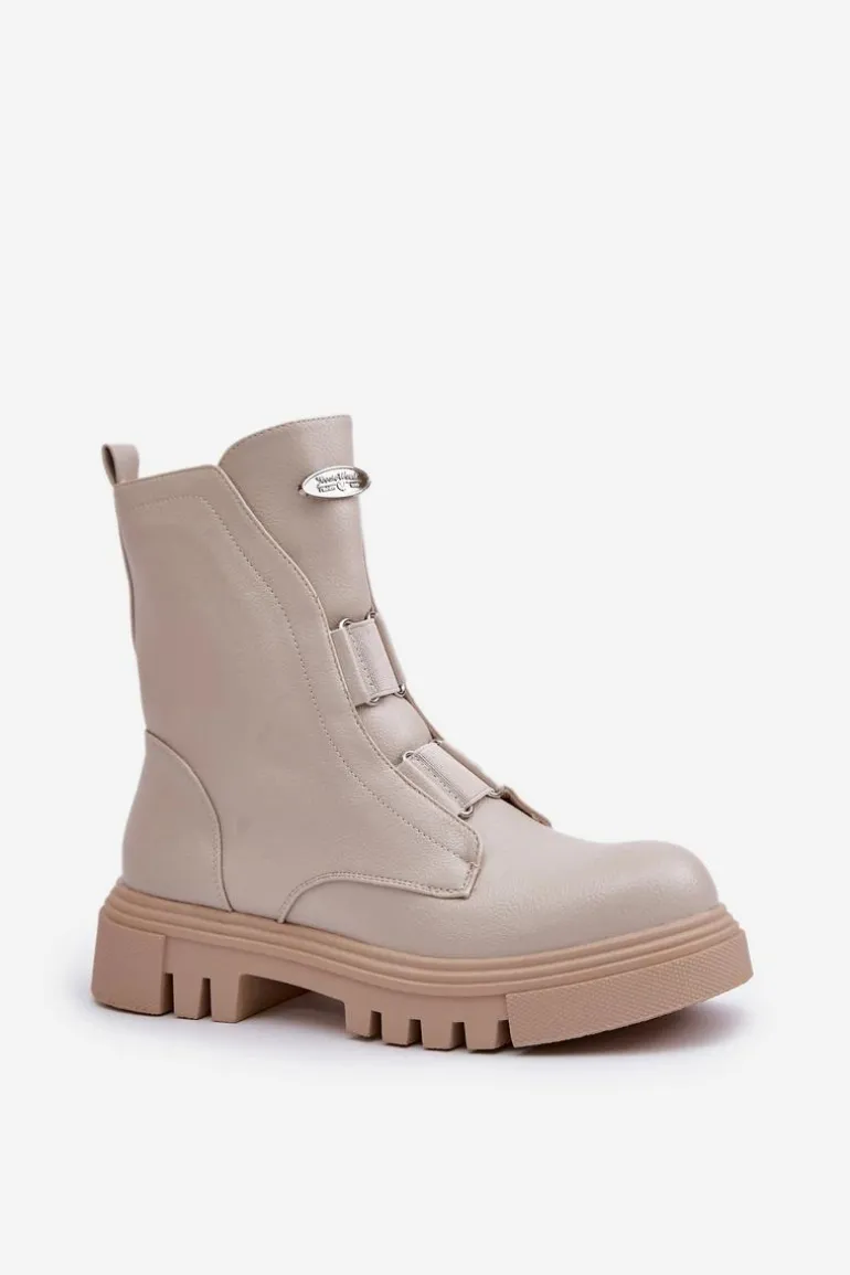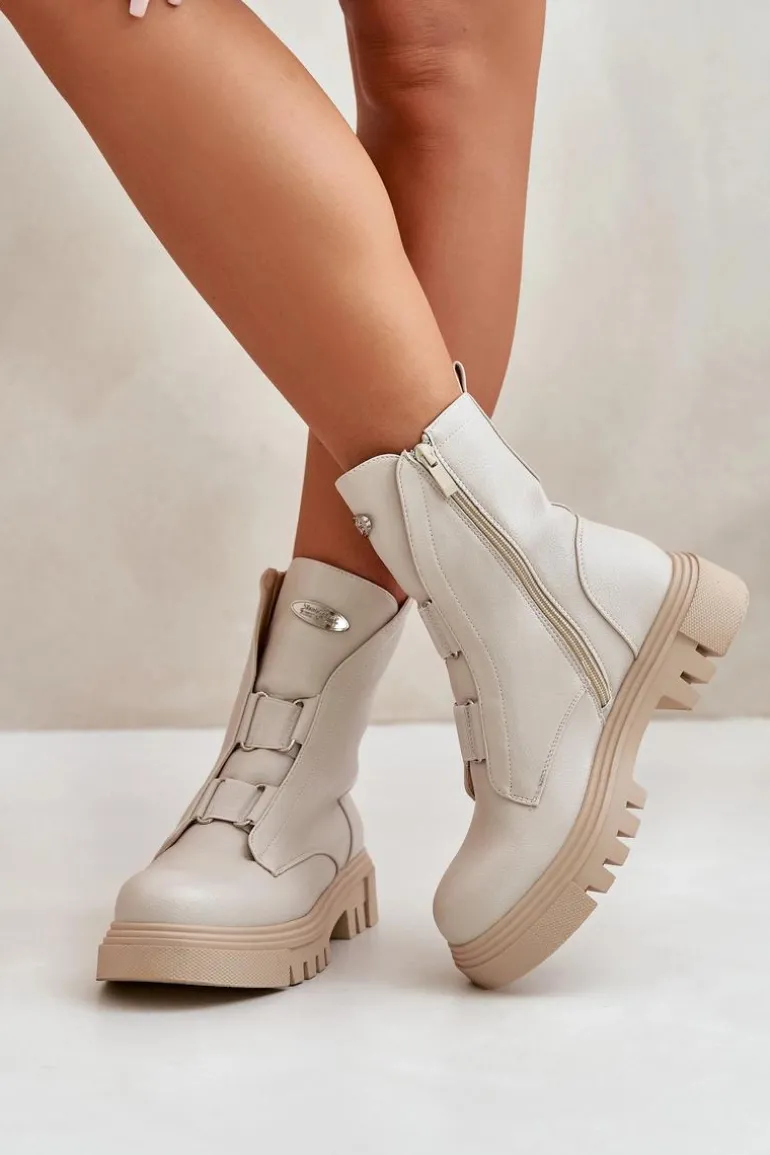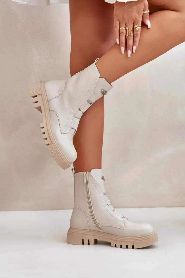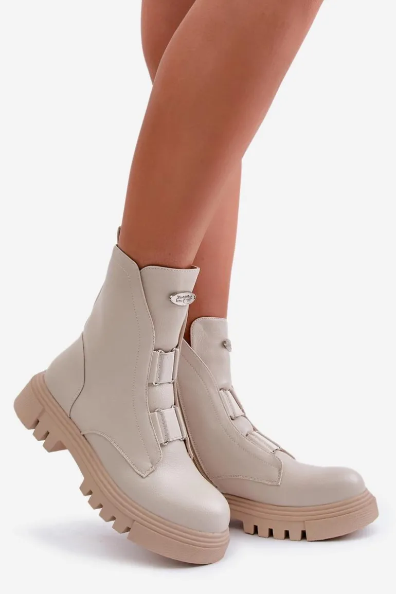 Ocieplane Botki Workery Damskie Na Zamek Eko Skórzane Jasnobeżowe Mailyra