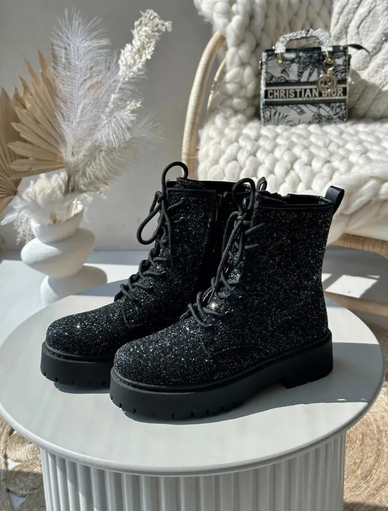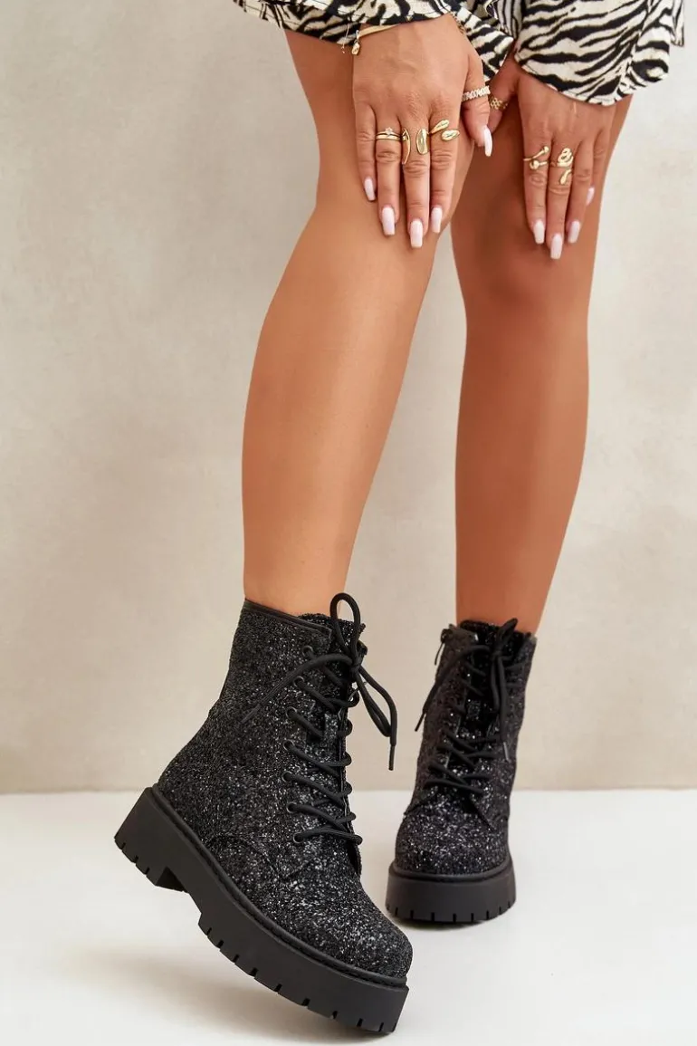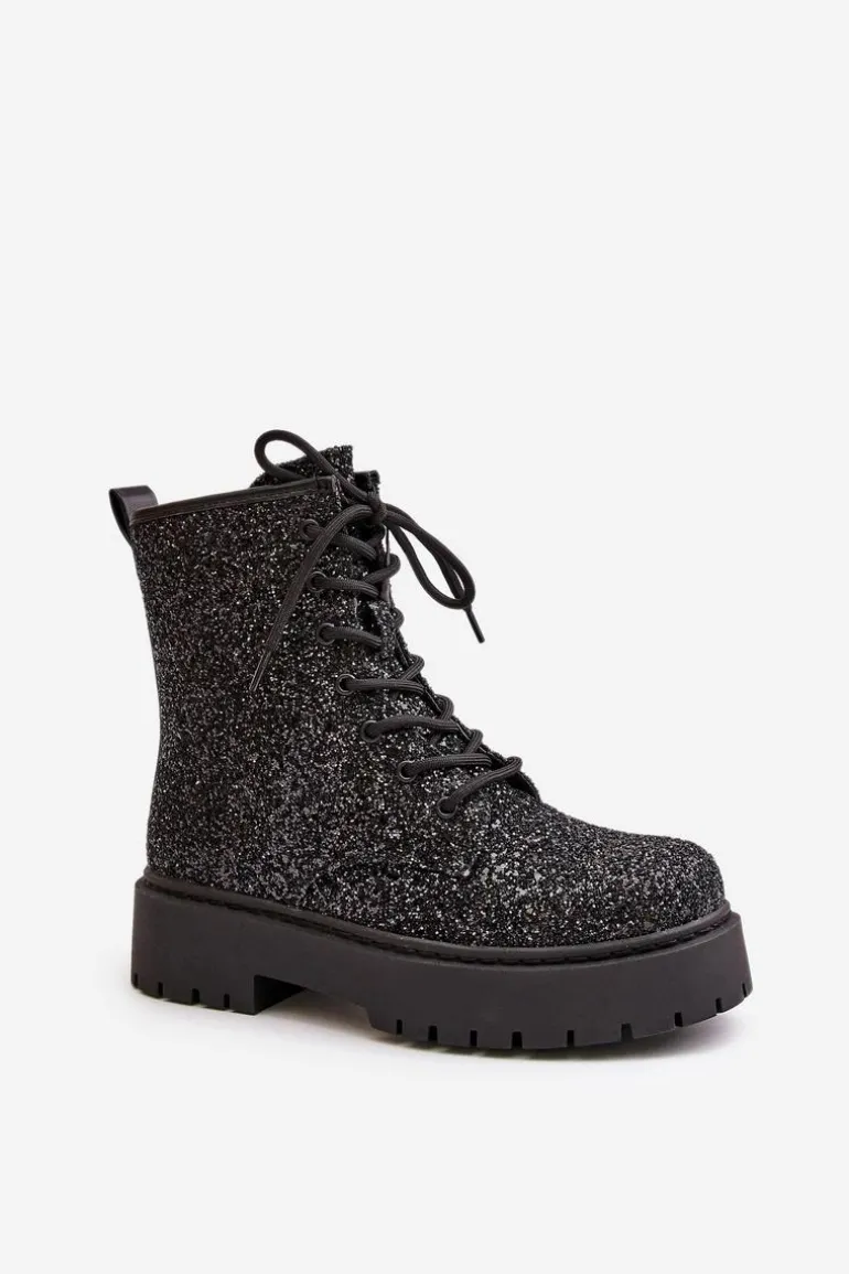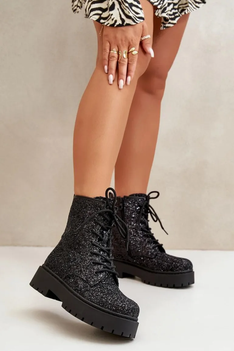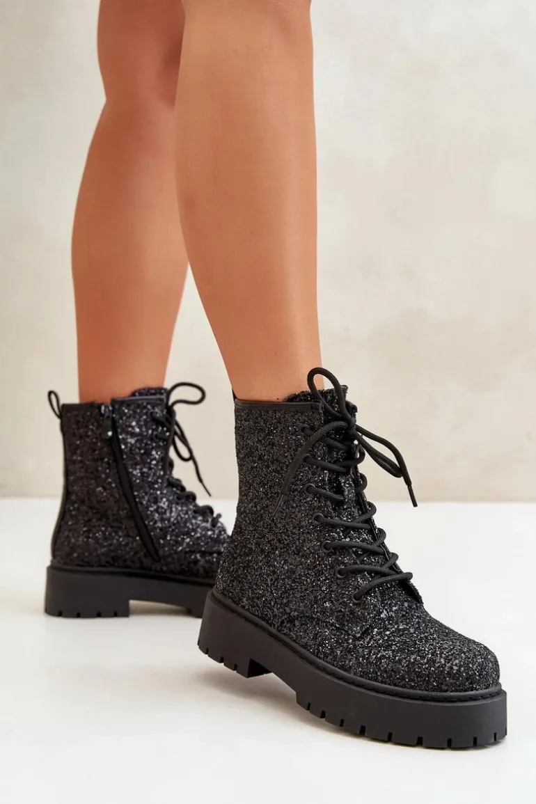 Ocieplane Botki Workery Damskie Ozdobione Cekinami Czarne Liatheine