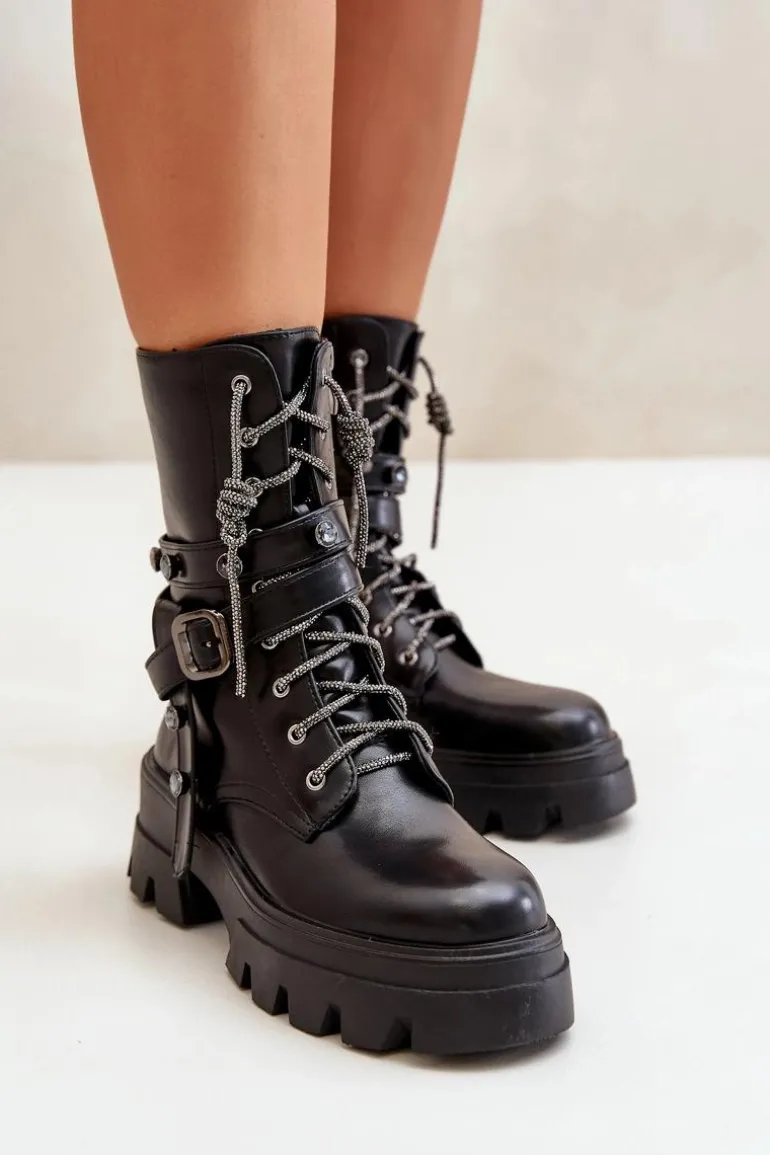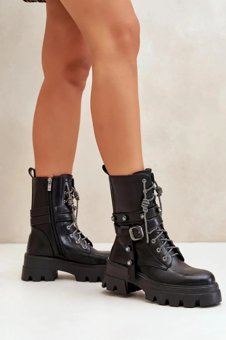 Damskie botki wykonane z ekologicznej skóry. Osadzone na płaskim, masywnym obcasie i platformie. Noski zaokrąglone. Środek ocieplony kocem obuwniczym. Zapinane na zamek oraz dodatkowo posiadają ozdobne sznurowanie. Na cholewce dwa paski z klamrą. Model ten doskonale uzupełni Twoje outfity w chłodniejsze dni! Przy wyborze rozmiaru prosimy sugerować się tabelą rozmiarów.