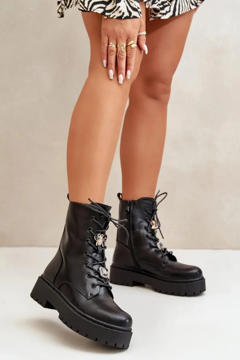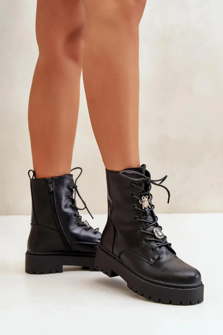Damskie botki wykonane z ekologicznej skóry. Posiadają płaski obcas i zaokrąglone noski, co zapewnia komfort noszenia. Dzięki bocznemu suwakowi zakładanie jest szybkie i proste, a dodatkowe sznurowanie z ozdobnymi przypinkami dodaje unikalnego charakteru. Środek ocieplony kocem obuwniczym. Doskonale uzupełnią Twoje outfity w chłodniejsze dni.Przy wyborze rozmiaru prosimy sugerować się tabelą rozmiarów.