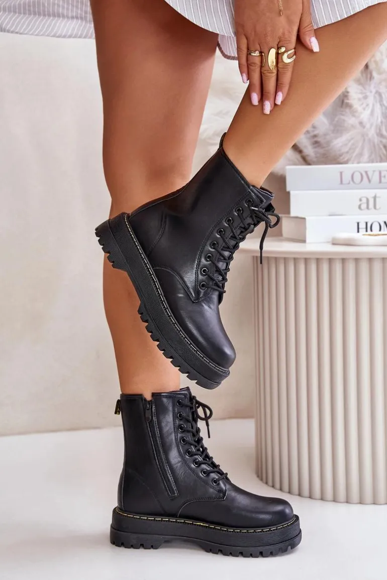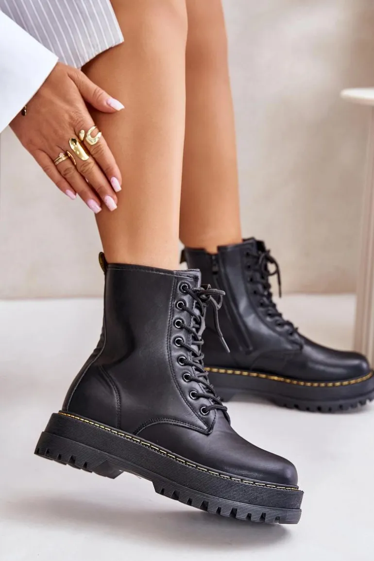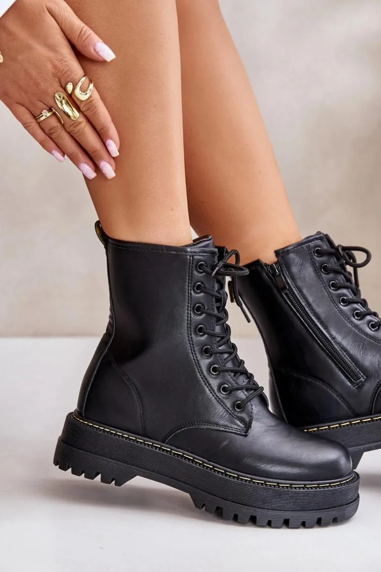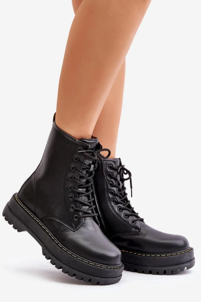 Botki damskie wykonane z eko skóry. Posiadają suwak z boku cholewki oraz sznurowanie. Osadzone na platformie. Posiadają w środku ocieplenie w postaci koca obuwniczego. Dodatkowo zapiętek jest usztywniany. Te botki powinny znaleźć się w Twojej szafie! Przy wyborze rozmiaru prosimy sugerować się tabelą rozmiarów.