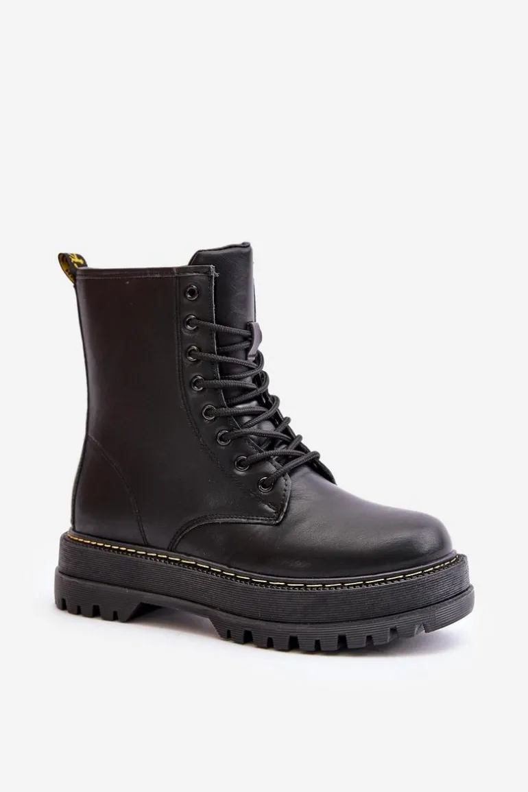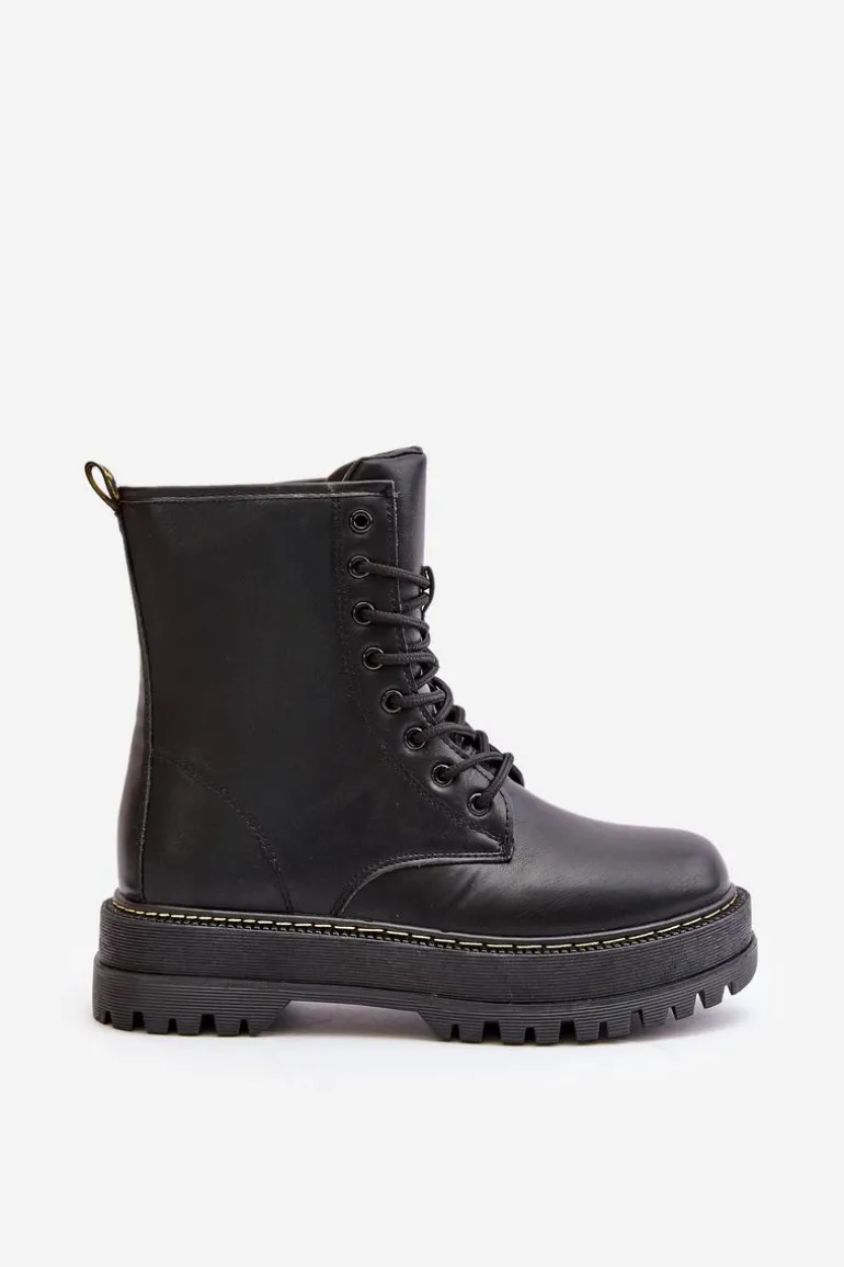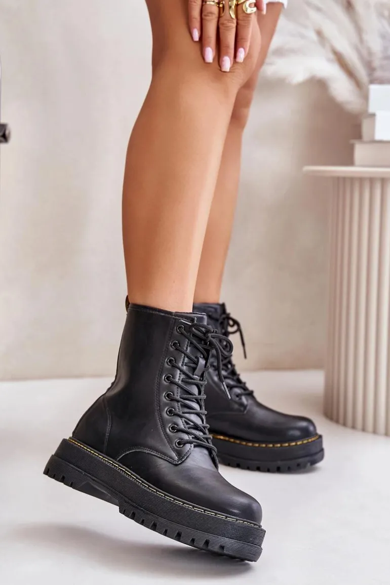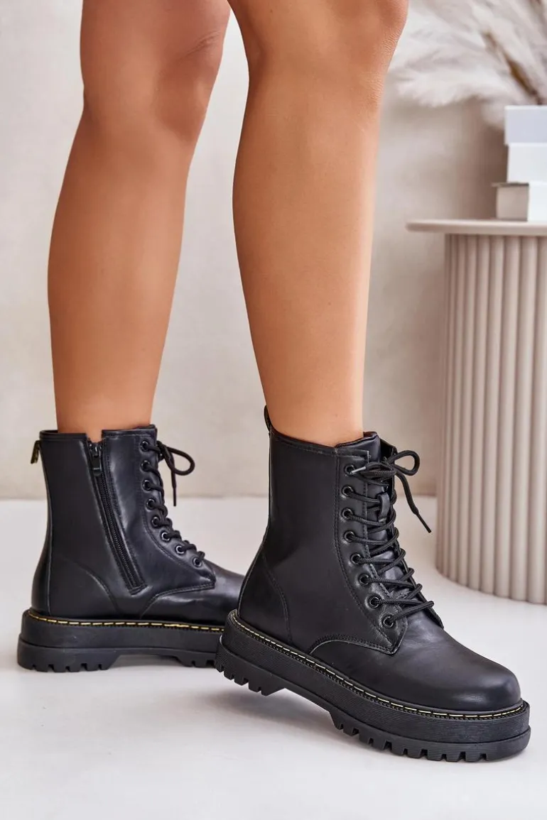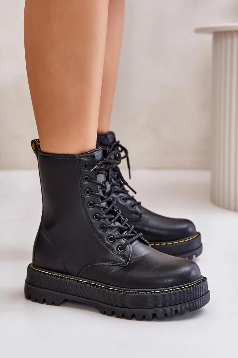 Botki damskie wykonane z eko skóry. Posiadają suwak z boku cholewki oraz sznurowanie. Osadzone na platformie. Posiadają w środku ocieplenie w postaci koca obuwniczego. Dodatkowo zapiętek jest usztywniany. Te botki powinny znaleźć się w Twojej szafie! Przy wyborze rozmiaru prosimy sugerować się tabelą rozmiarów.