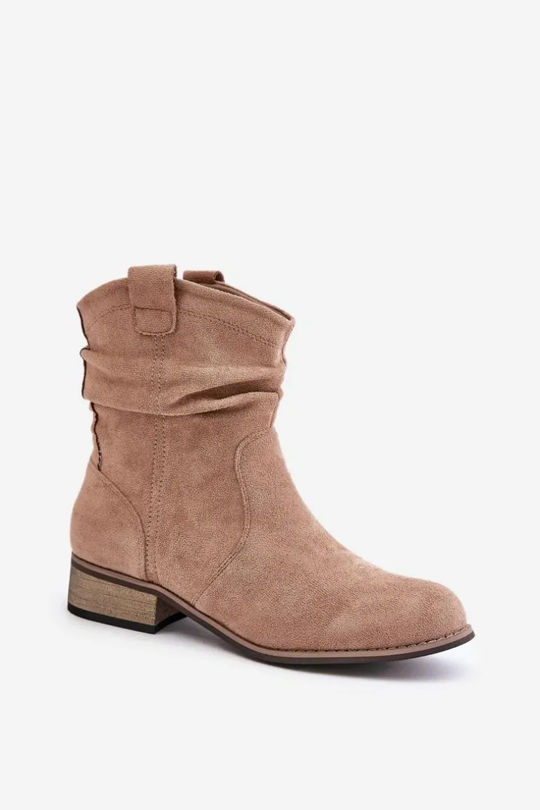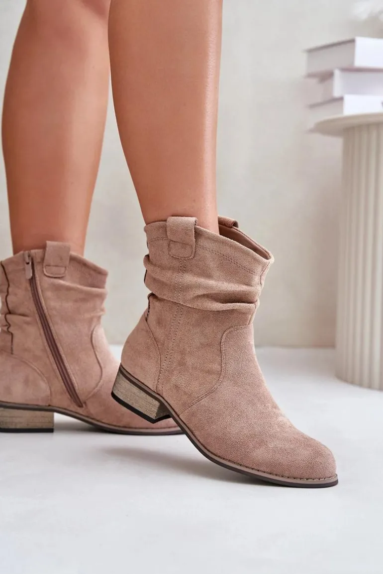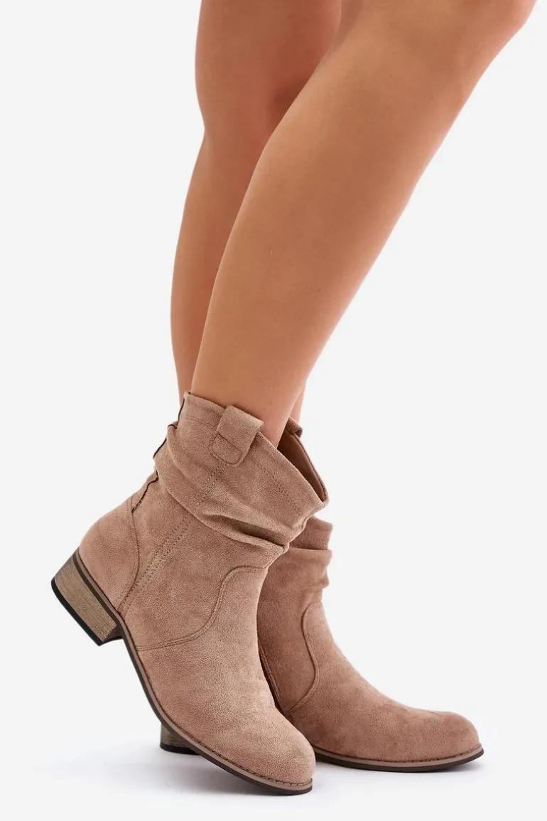 Damskie botki wykonane z ekologicznego zamszu. Osadzone są na niskim obcasie typu klocek. Posiadają zaokrąglone noski. Zapinane na zamek. Środek ocieplany kocem obuwniczym. Jest to klasyczny model, który można z łatwością dopasować do różnorodnych jesiennych stylizacji. Przy wyborze rozmiaru prosimy sugerować się tabelą rozmiarów.