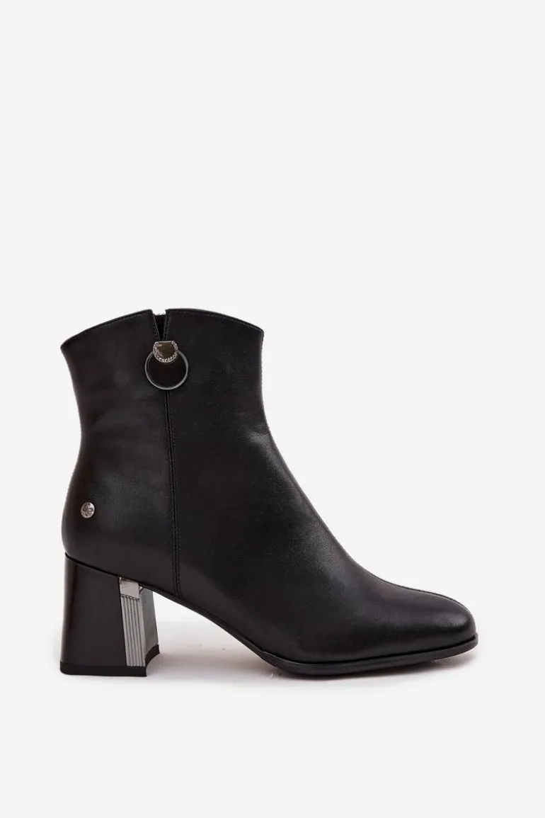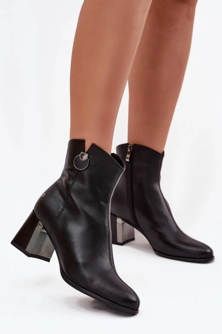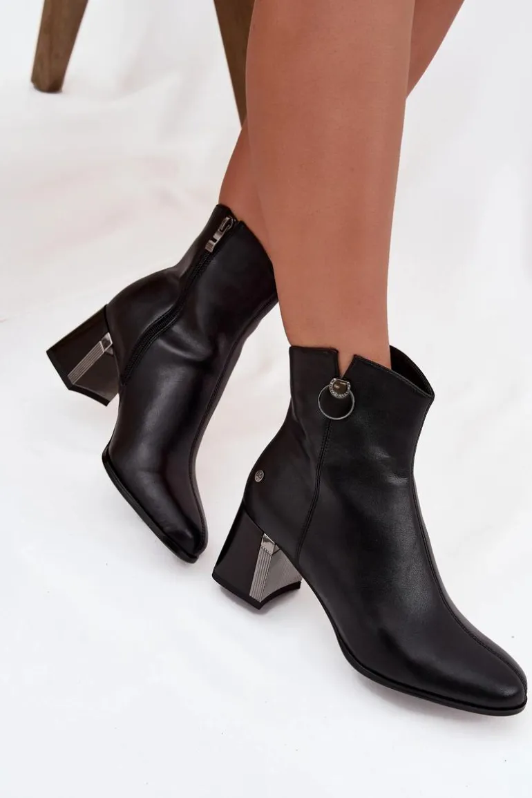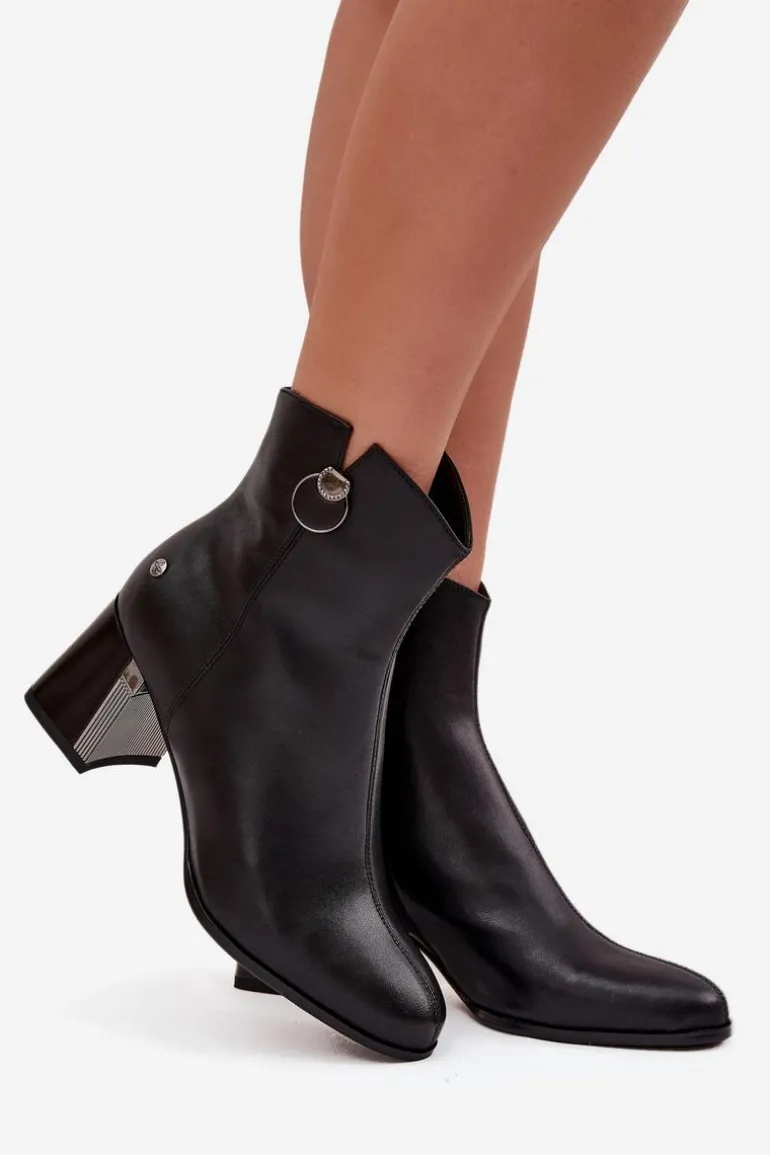 Eleganckie botki damskie marki Maciejka to propozycja dla kobiet ceniących klasykę w nowoczesnym wydaniu. Wykonane z wysokiej jakości naturalnej skóry, prezentują się szykownie i ponadczasowo. Model osadzony został na stabilnym obcasie typu słupek, który dodaje sylwetce smukłości, jednocześnie zapewniając wygodę podczas noszenia. Zaokrąglone noski. Praktyczne zapięcie na zamek ułatwia zakładanie. Wnętrze zostało ocieplone, dzięki czemu buty świetnie sprawdzą się w chłodniejsze dni. Subtelny, ozdobny detal umieszczony z boku cholewki dodaje całości uroku. To idealne botki na sezon jesienno-zimowy – eleganckie i stylowe. Przy wyborze rozmiaru prosimy sugerować się tabelą rozmiarów.