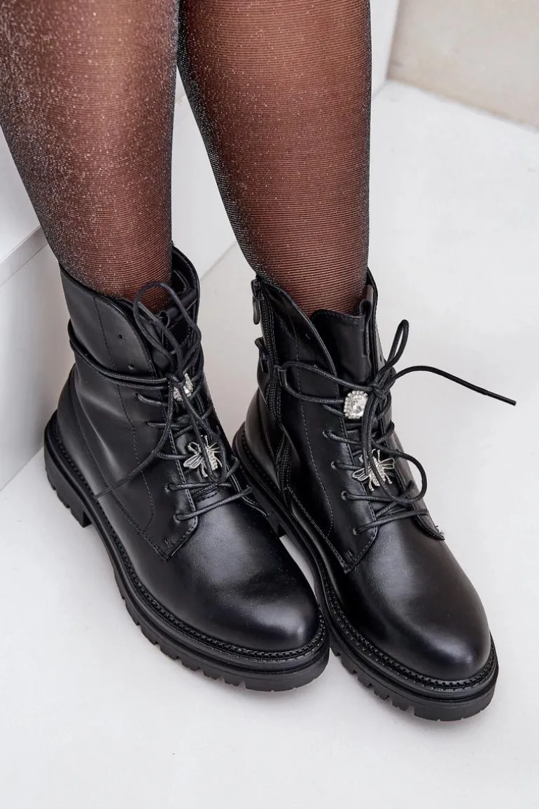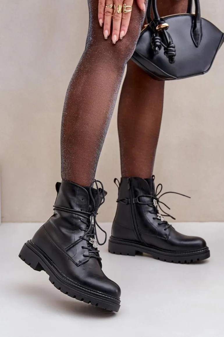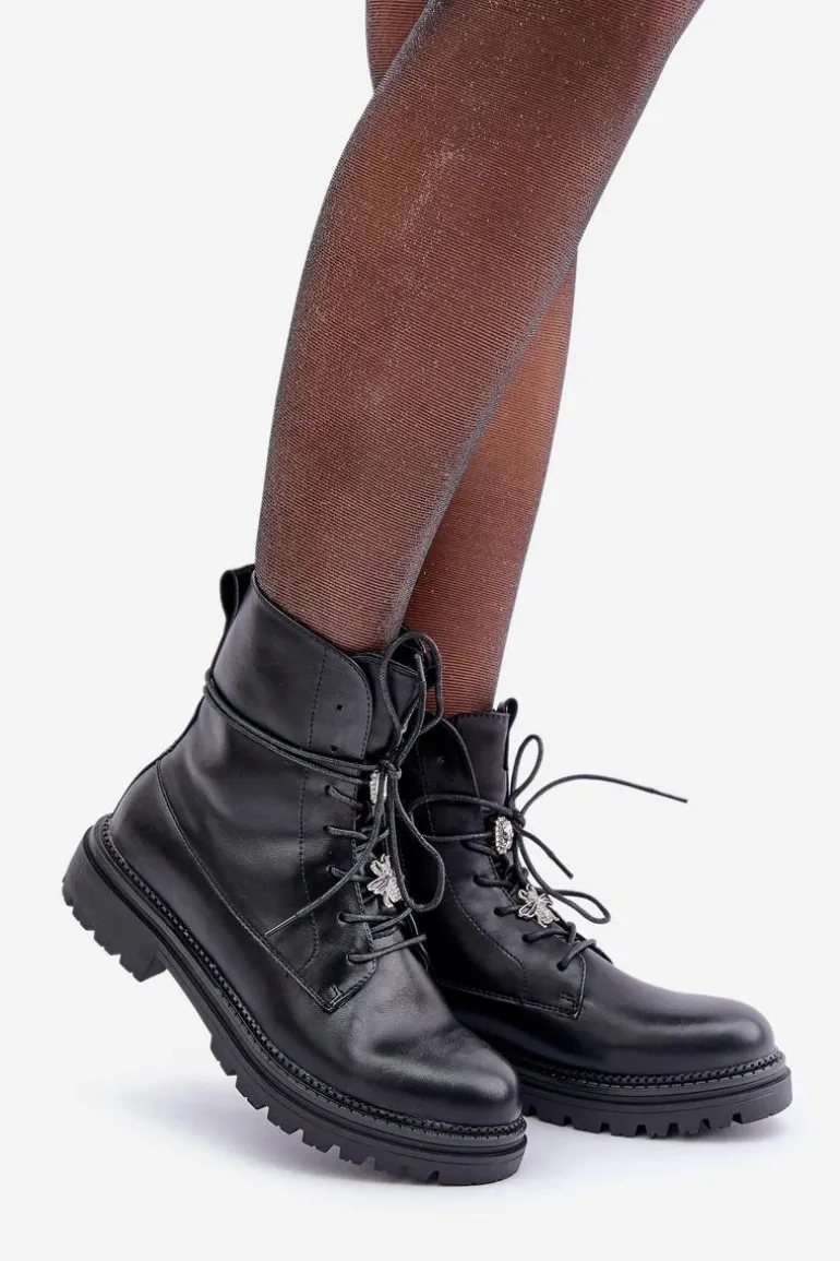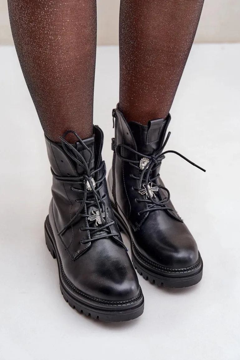 Botki z eko skóry na płaskim obcasie to doskonały wybór na chłodniejsze dni. Model wyróżnia się zaokrąglonymi noskami i sznurowaniem, ozdobionym efektownymi przypinkami, które dodają wyjątkowego uroku. Wnętrze ocieplane kocem obuwniczym zapewnia ciepło i komfort podczas noszenia. Praktyczne i modne, idealne do codziennych stylizacji! Przy wyborze rozmiaru prosimy sugerować się tabelą rozmiarów.