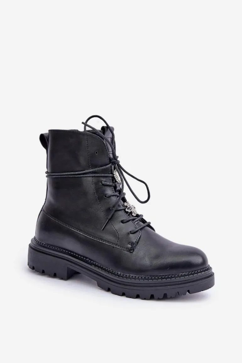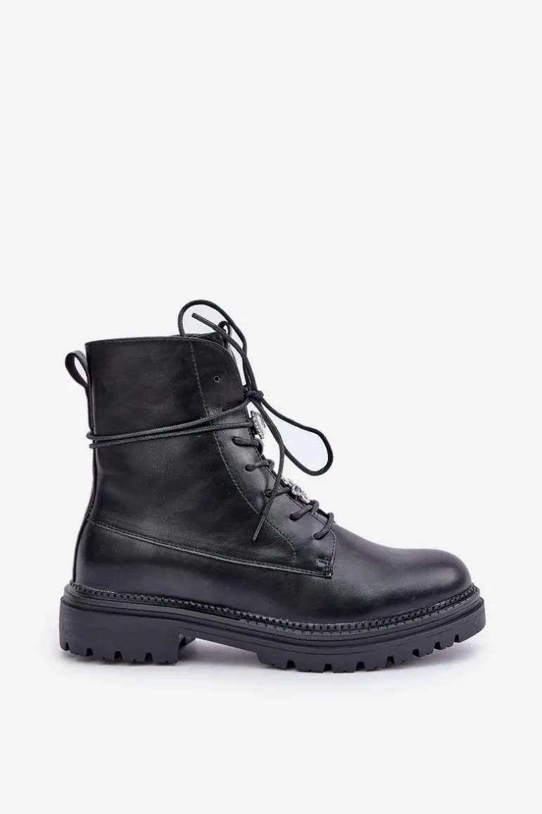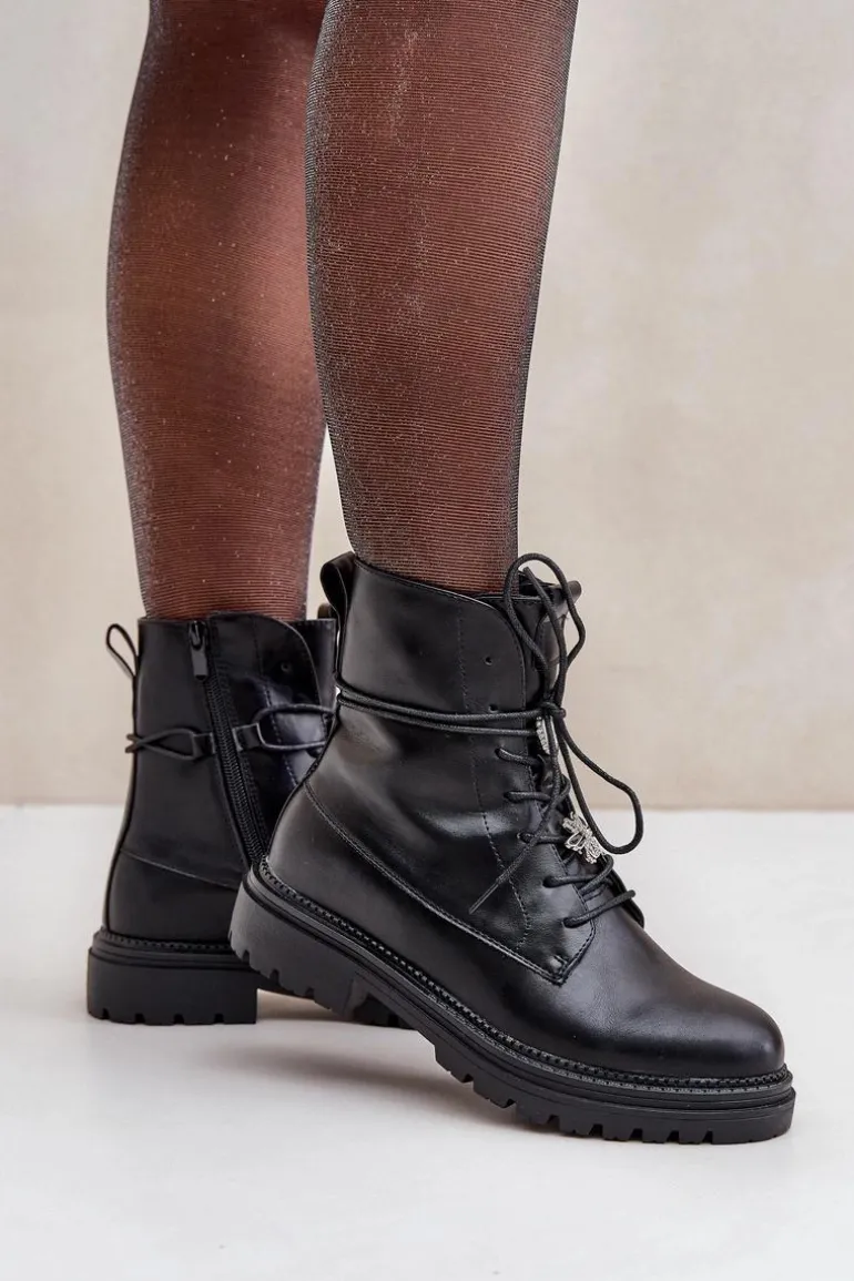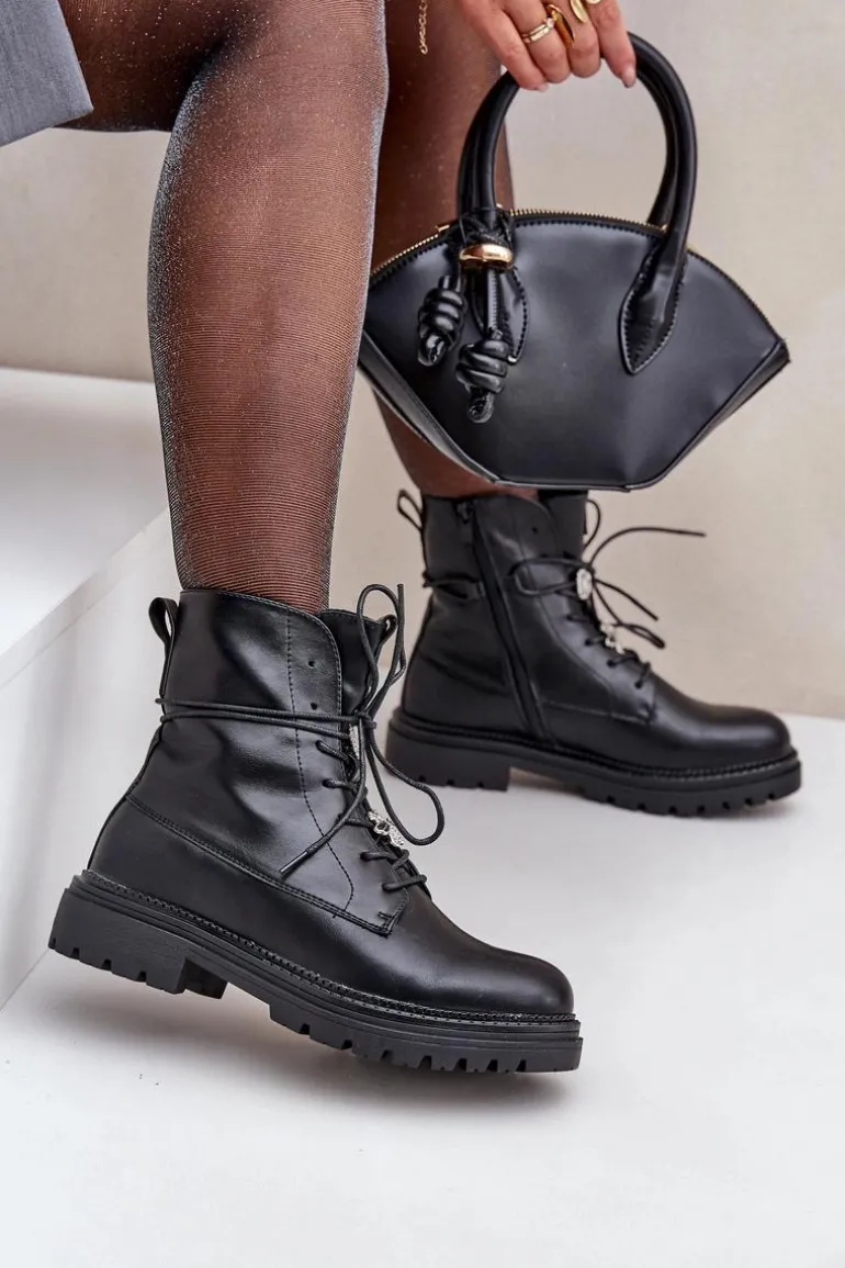 Botki z eko skóry na płaskim obcasie to doskonały wybór na chłodniejsze dni. Model wyróżnia się zaokrąglonymi noskami i sznurowaniem, ozdobionym efektownymi przypinkami, które dodają wyjątkowego uroku. Wnętrze ocieplane kocem obuwniczym zapewnia ciepło i komfort podczas noszenia. Praktyczne i modne, idealne do codziennych stylizacji! Przy wyborze rozmiaru prosimy sugerować się tabelą rozmiarów.