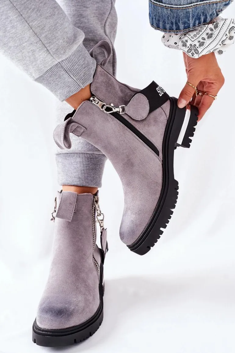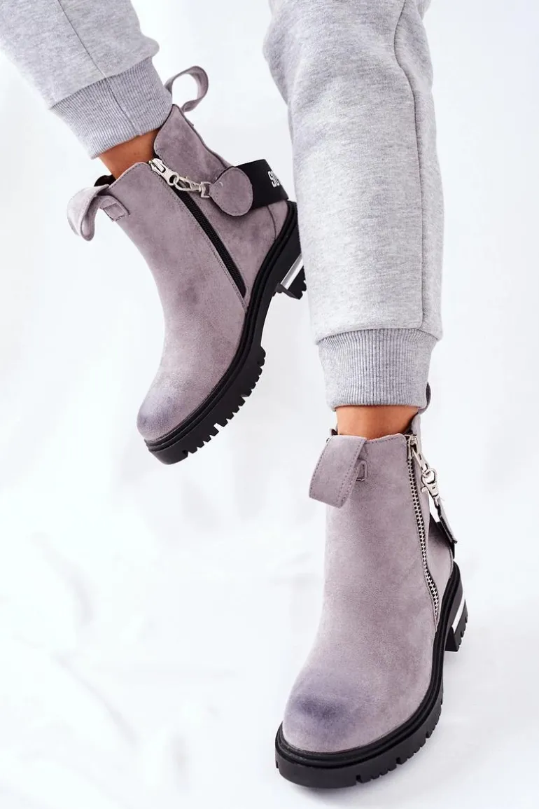 Botki damskie wykonane z eko zamszu. Wnętrze ocieplone jest miłym w dotyku kocem obuwniczym. Przy wyborze rozmiaru prosimy sugerować się tabelą rozmiarów.