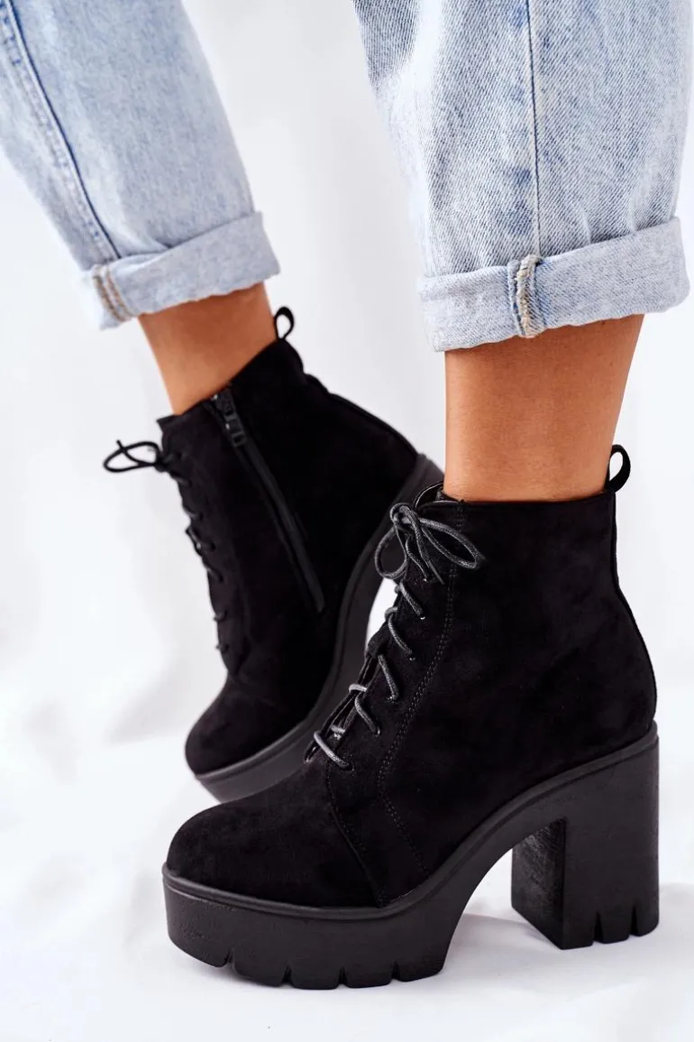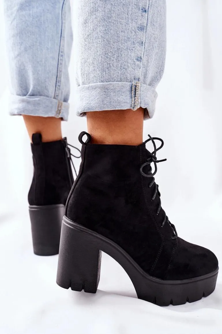 Botki damskie wykonane z eko zamszu. Wnętrze botków ocieplone jest miłym w dotyku kocem obuwniczym. Przy wyborze rozmiaru prosimy sugerować się tabelą rozmiarów.