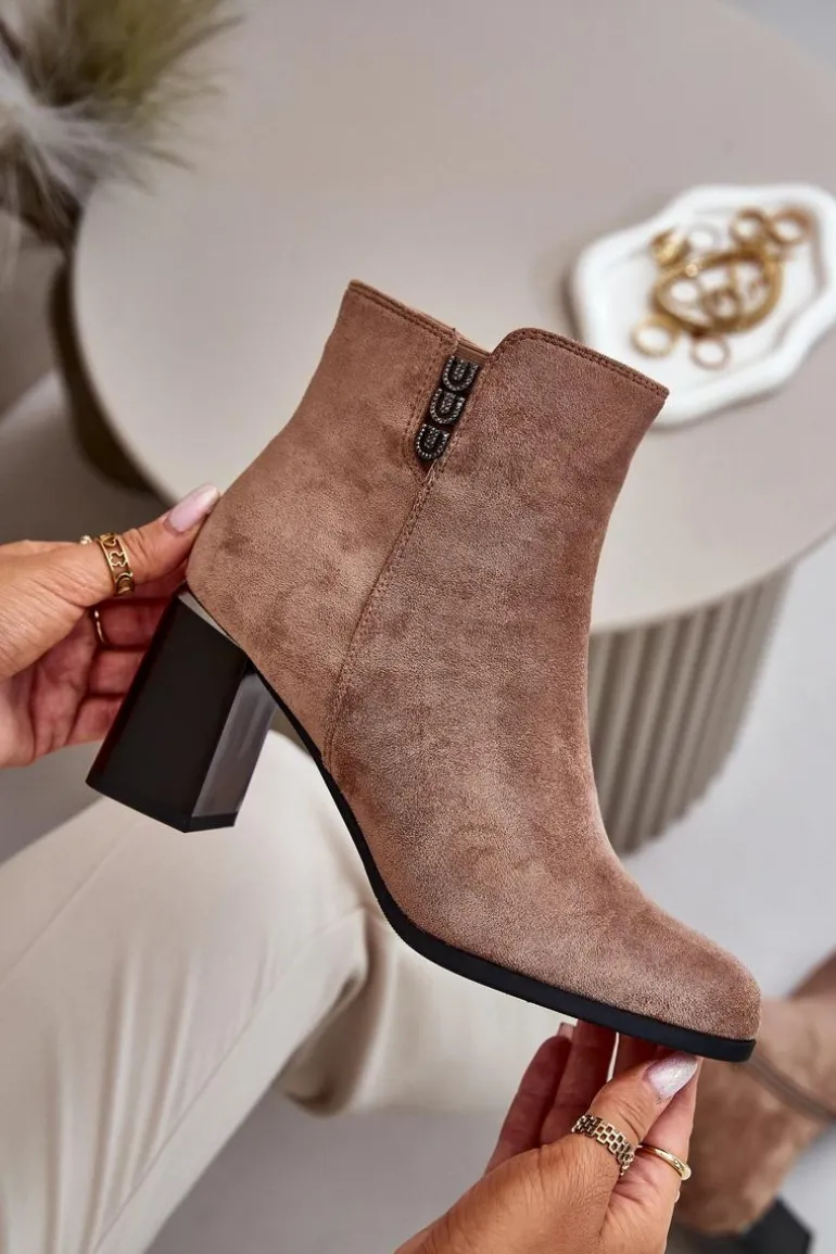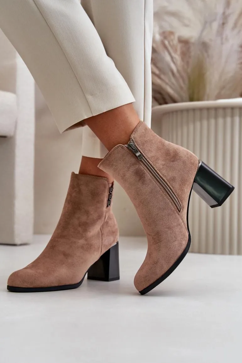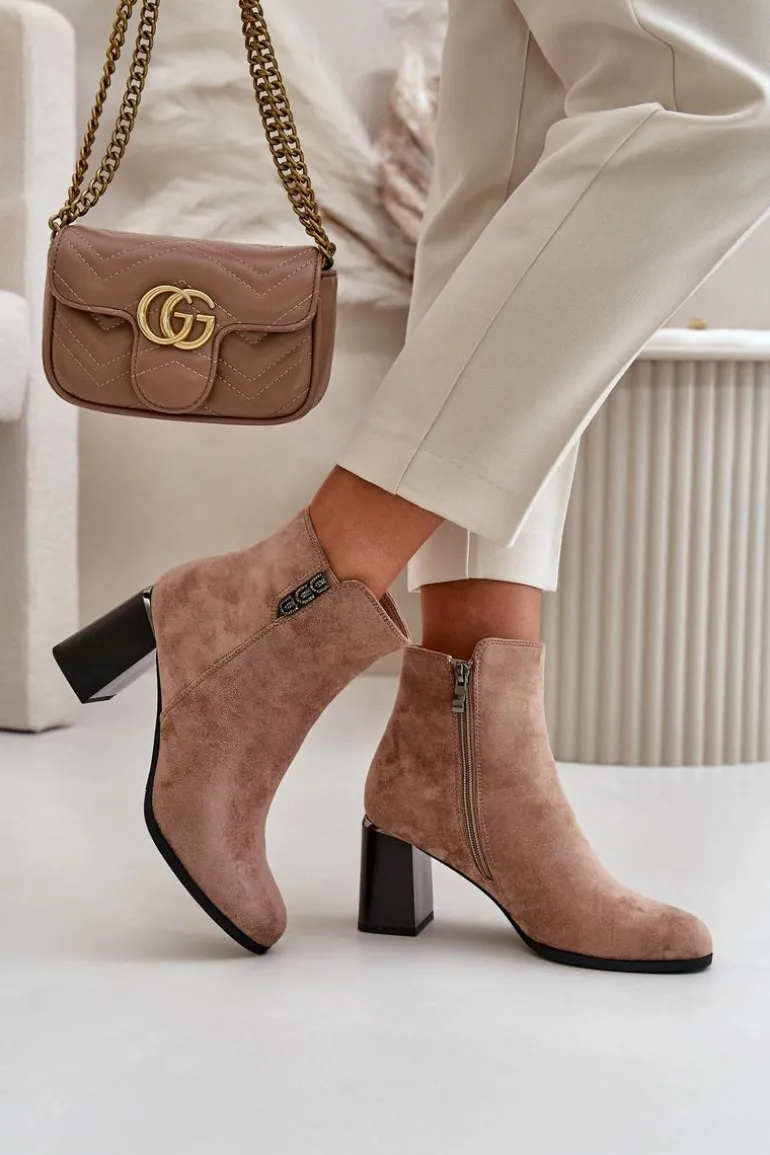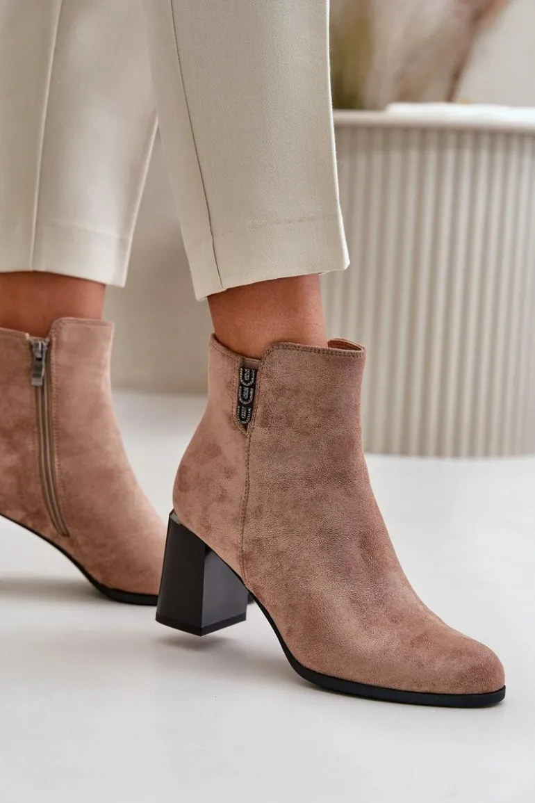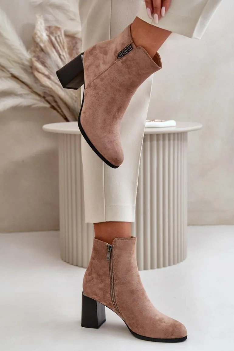 Damskie botki wykonane z miłego w dotyku eko zamszu. Wnętrze ocieplone jest kocem obuwniczym, co zapewnia ciepło i komfort w chłodniejsze dni. Noski w migdał. Obcas w formie stabilnego słupka. Zapinanie na zamek, Koniecznie powinnaś je mieć w swojej jesienno-zimowej garderobie! Przy wyborze rozmiaru prosimy sugerować się tabelą rozmiarów.