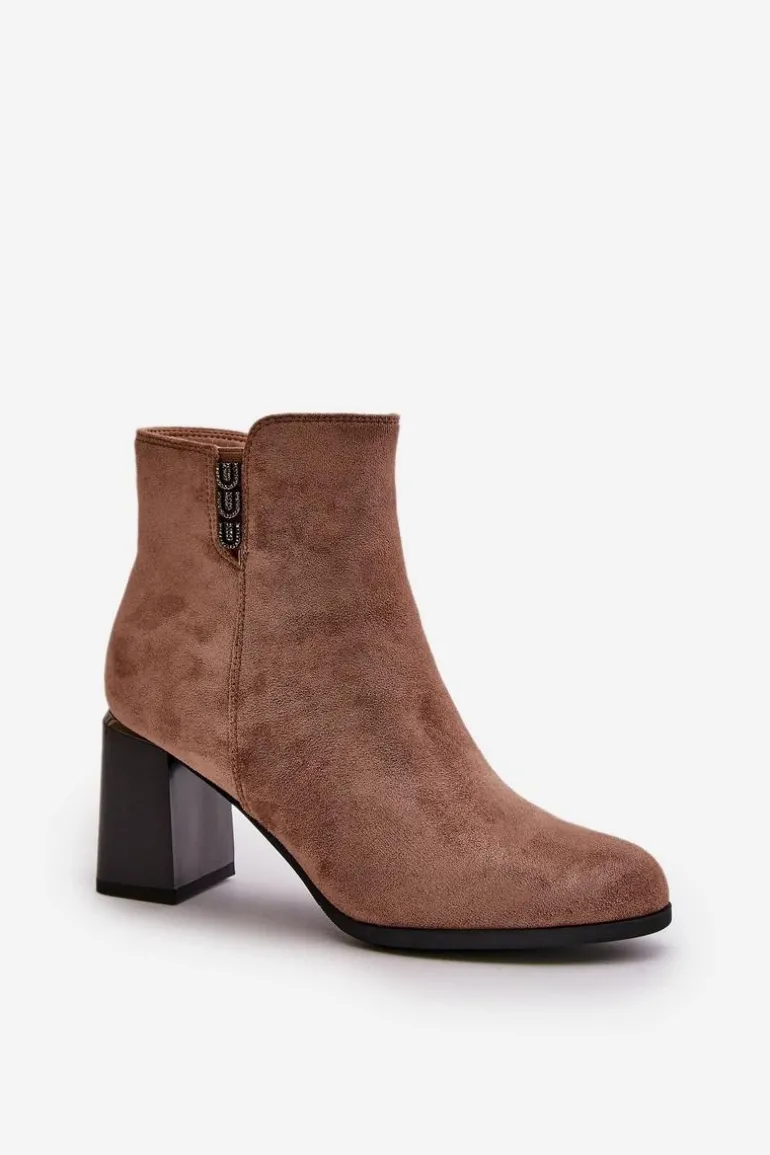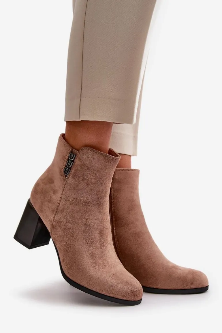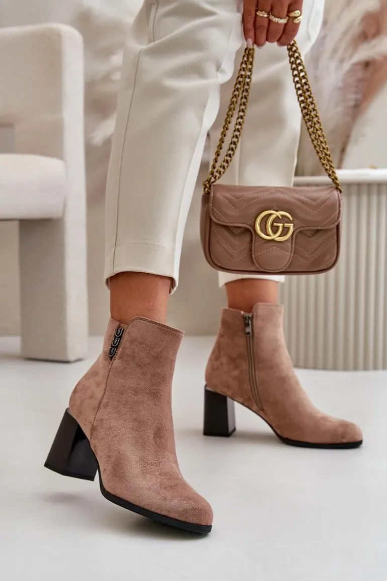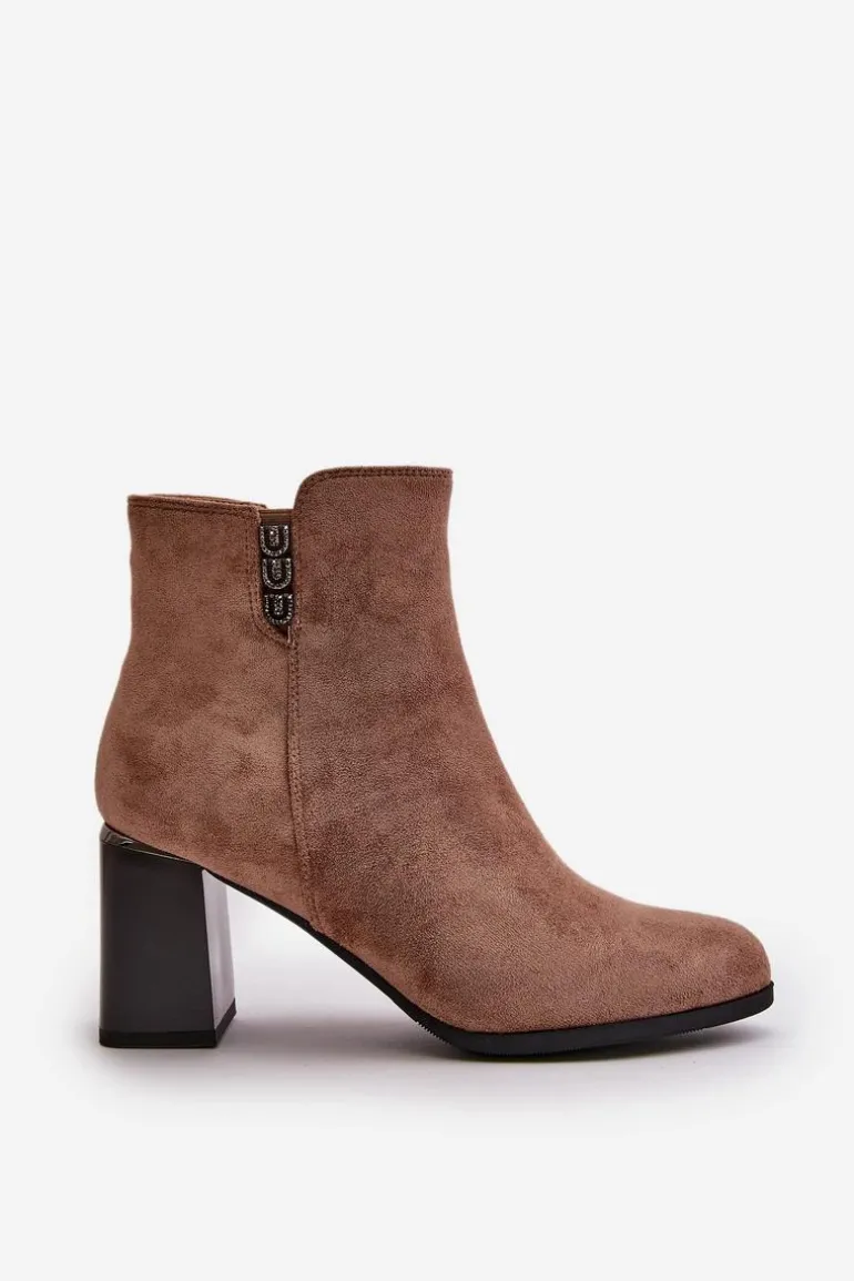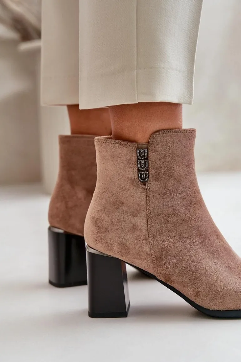 Damskie botki wykonane z miłego w dotyku eko zamszu. Wnętrze ocieplone jest kocem obuwniczym, co zapewnia ciepło i komfort w chłodniejsze dni. Noski w migdał. Obcas w formie stabilnego słupka. Zapinanie na zamek, Koniecznie powinnaś je mieć w swojej jesienno-zimowej garderobie! Przy wyborze rozmiaru prosimy sugerować się tabelą rozmiarów.