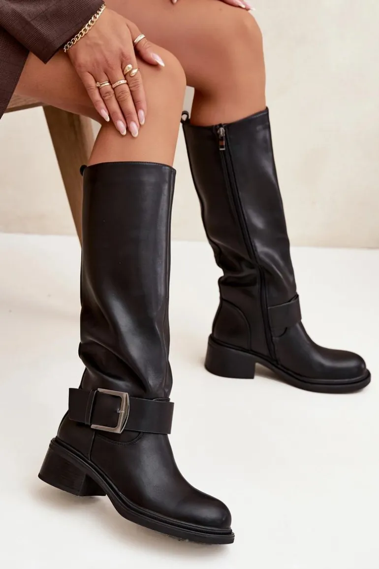 Kozaki damskie wykonane z eko skóry. Osadzone na stabilnym obcasie typu klocek zapewniają komfort noszenia i świetną stabilność, dzięki czemu sprawdzą się zarówno na co dzień, jak i podczas dłuższych wyjść. Wnętrze wykończone miękkim kocem obuwniczym gwarantuje ciepło i wygodę w chłodniejsze dni. Charakterystycznym elementem tego modelu jest dekoracyjny pasek z dużą klamrą umieszczony w dolnej części cholewki, który nadaje wyrazistego, modnego akcentu. Dzięki temu kozaki zyskują nowoczesny charakter i przyciągają uwagę, doskonale komponując się zarówno z jeansami, jak i z sukienkami czy spódnicami. To idealne obuwie dla kobiet, które chcą połączyć klasykę z nutą oryginalności. Przy wyborze rozmiaru prosimy sugerować się tabelą rozmiarów.