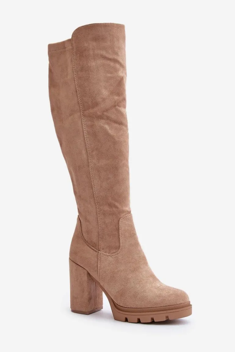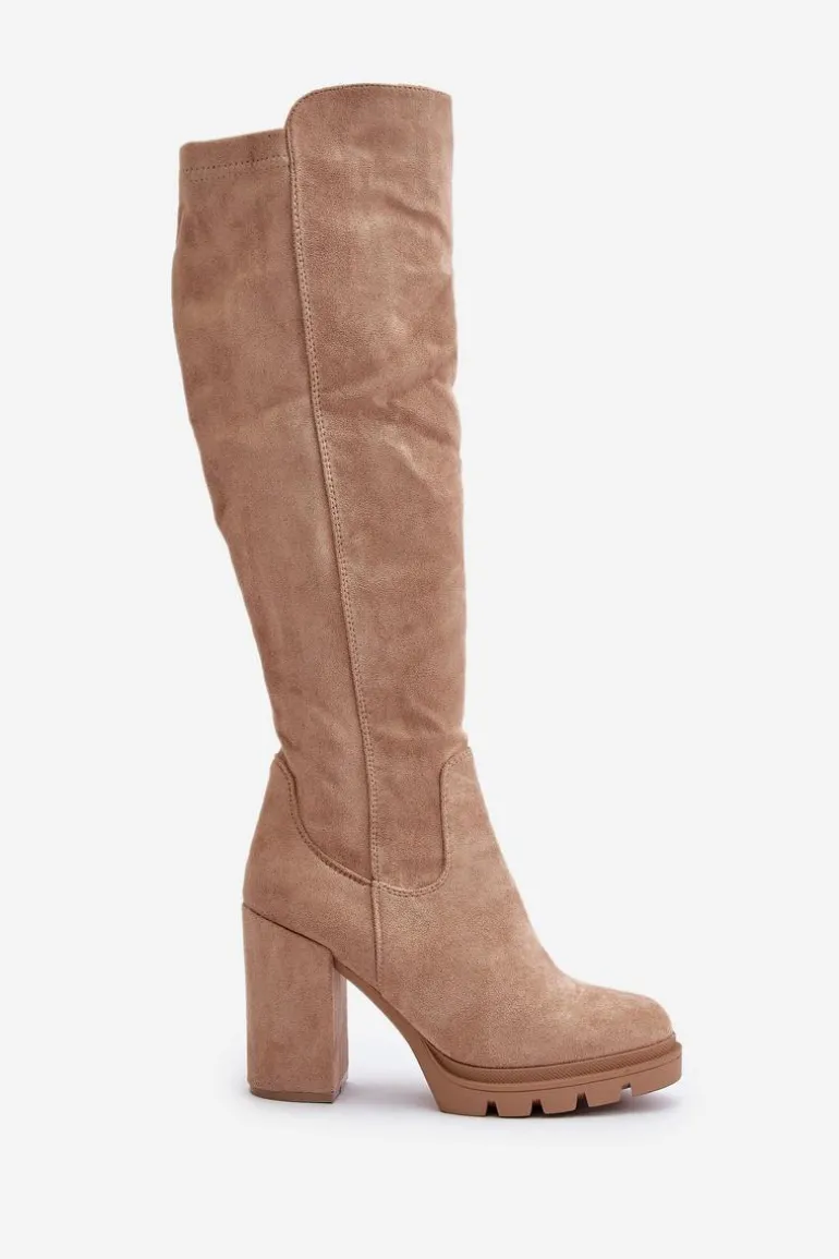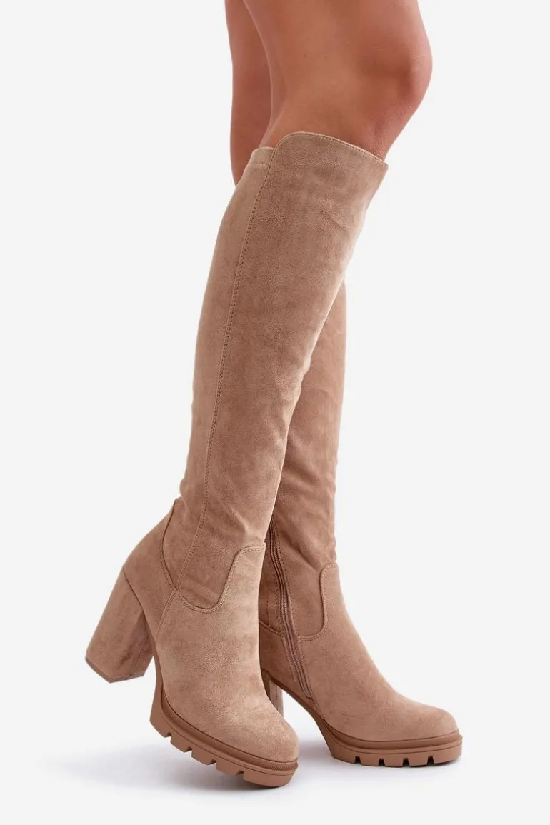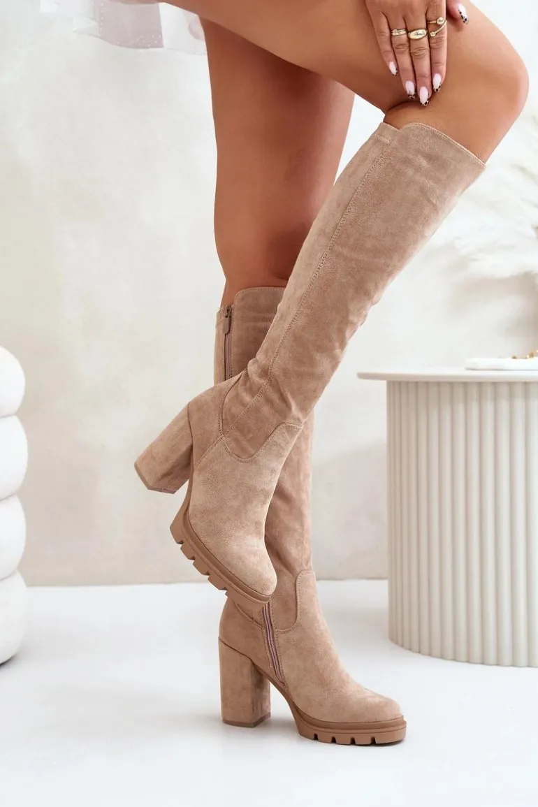 Damskie kozaki sięgające do kolana, które łączą elegancję z wygodą. Osadzone na platformie i słupkowym obcasie, zapewniają stabilność i stylowy wygląd. Model zapinany na suwak z boku, a wnętrze ocieplone jest kocem obuwniczym, co gwarantuje komfort noszenia nawet w chłodniejsze dni. Zaokrąglone noski dodają klasycznego uroku, czyniąc je idealnym wyborem do sukienek czy spódnic. Przy wyborze rozmiaru prosimy sugerować się tabelą rozmiarów.