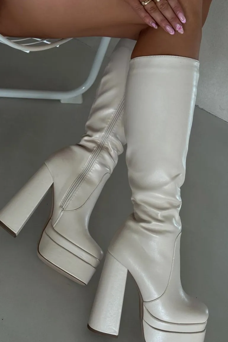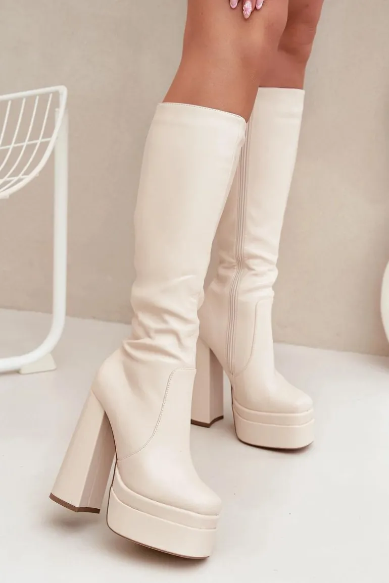 Kozaki damskie z eko skóry, osadzone na obcasie w formie słupka i platformie. Zapinane na zamek, zapewniają łatwość zakładania, a zaokrąglone noski dodają komfortu. Cholewka sięgająca do kolana, wraz z ociepleniem kocem obuwniczym, zapewnia ciepło i komfort nawet w chłodniejsze dni. Te kozaki doskonale komponują się z zimowymi stylizacjami. Przy wyborze rozmiaru prosimy sugerować się tabelą rozmiarów.