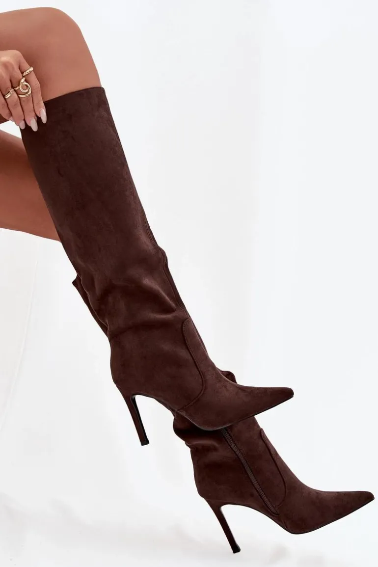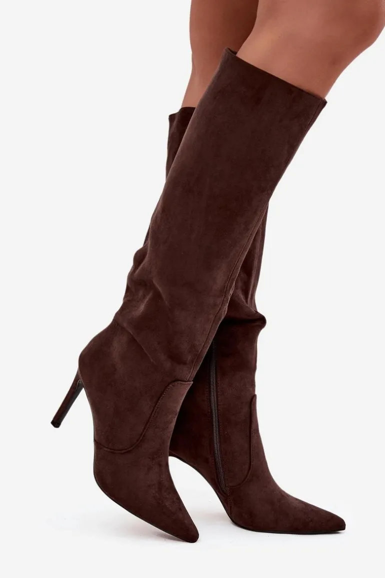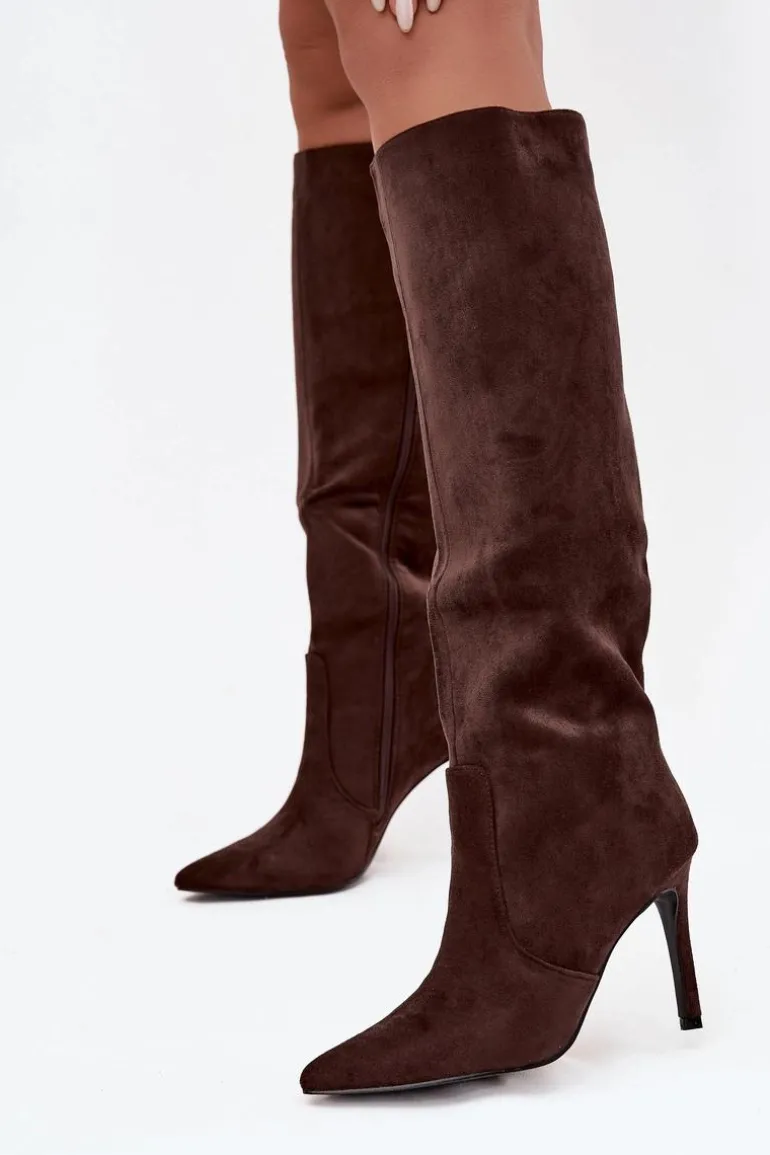 Kozaki damskie wykonane z miękkiego eko zamszu to niezwykle modna propozycja tego sezonu. Model zachwyca eleganckim fasonem i kobiecym charakterem. Osadzone na smukłej szpilce, pięknie podkreślają sylwetkę. Buty posiadają szpiczaste noski, które optycznie wysmuklają nogi, oraz zamek z boku, ułatwiający zakładanie. Ocieplane wnętrze gwarantuje komfort i ciepło w chłodniejsze dni. To idealny model dla kobiet, które lubią wyróżniać się elegancją – doskonałe zarówno na wieczorne wyjścia, jak i do modnych stylizacji w ciągu dnia. Przy wyborze rozmiaru prosimy sugerować się tabelą rozmiarów.