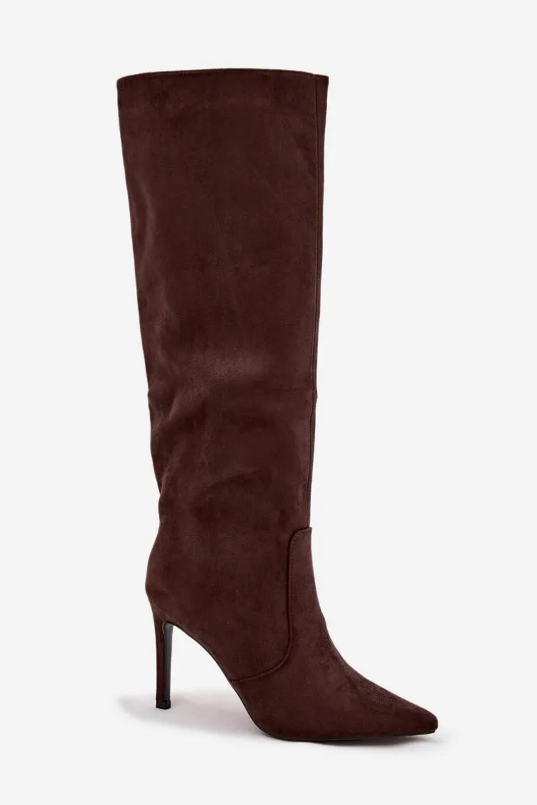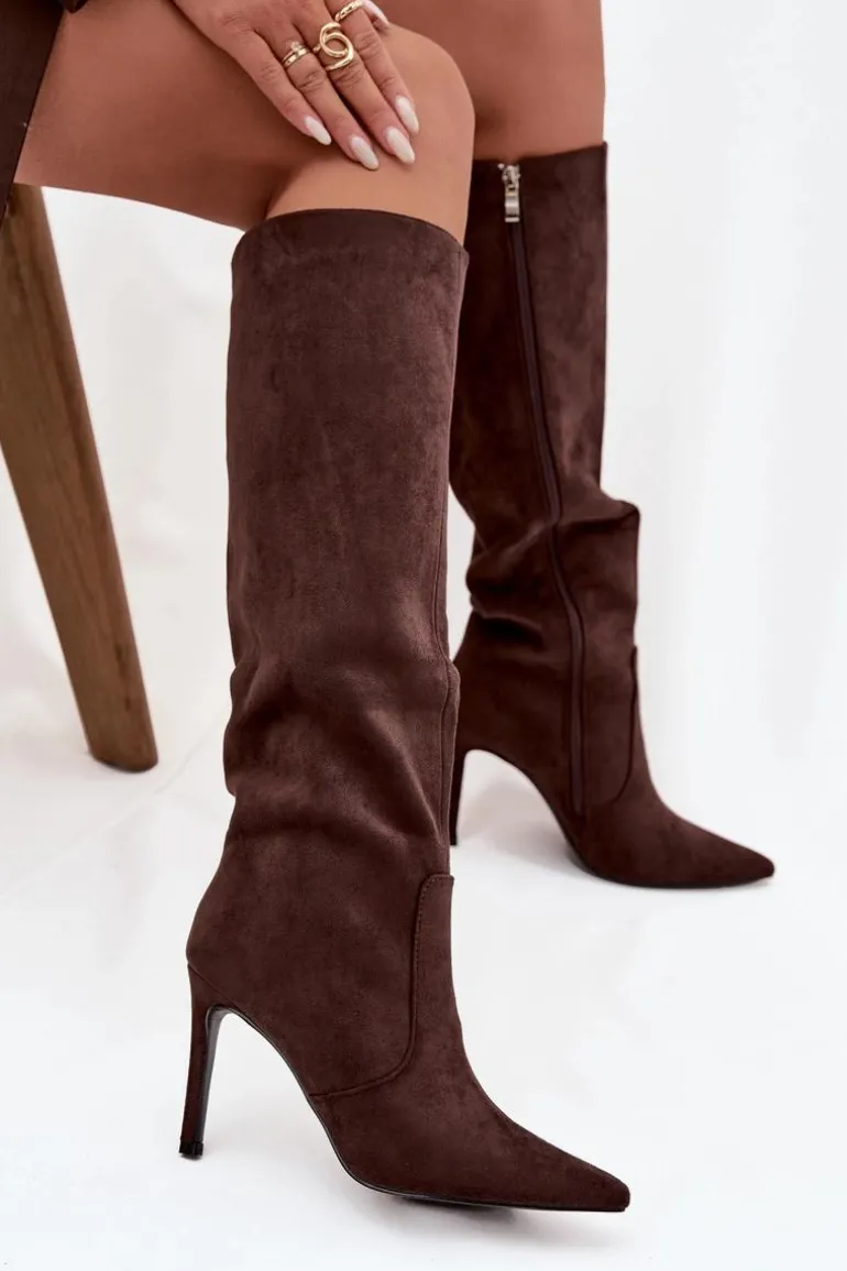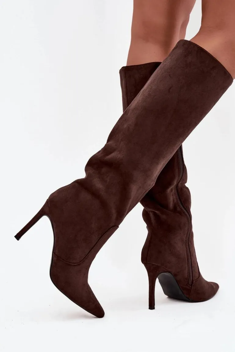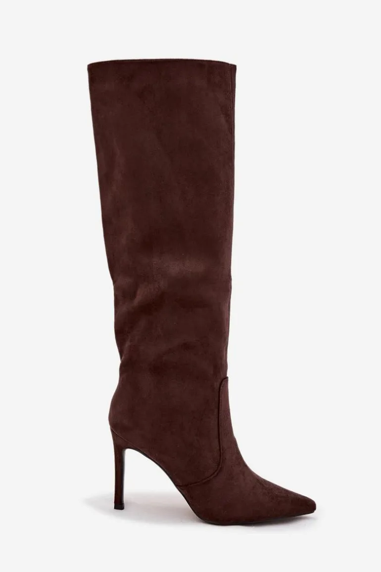 Kozaki damskie wykonane z miękkiego eko zamszu to niezwykle modna propozycja tego sezonu. Model zachwyca eleganckim fasonem i kobiecym charakterem. Osadzone na smukłej szpilce, pięknie podkreślają sylwetkę. Buty posiadają szpiczaste noski, które optycznie wysmuklają nogi, oraz zamek z boku, ułatwiający zakładanie. Ocieplane wnętrze gwarantuje komfort i ciepło w chłodniejsze dni. To idealny model dla kobiet, które lubią wyróżniać się elegancją – doskonałe zarówno na wieczorne wyjścia, jak i do modnych stylizacji w ciągu dnia. Przy wyborze rozmiaru prosimy sugerować się tabelą rozmiarów.