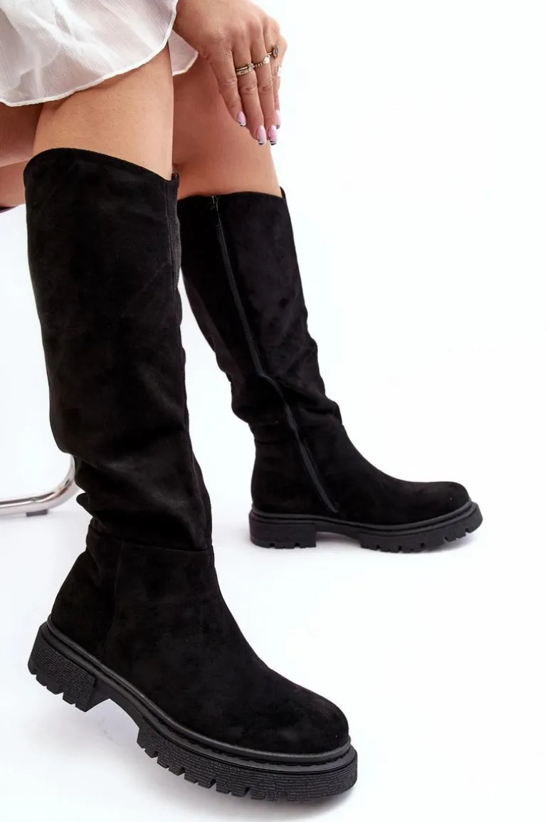 Damskie kozaki zostały wykonane z eko zamszu. Osadzone na płaskim obcasie. Cholewka przed kolano. Noski zaokrąglone. Ocieplone kocem obuwniczym w środku. Klasyczny fason sprawdzi się do wielu jesienno-zimowych stylizacji! Przy wyborze rozmiaru prosimy kierować tabelą rozmiarów.