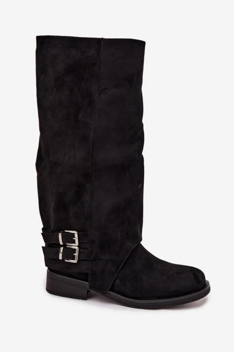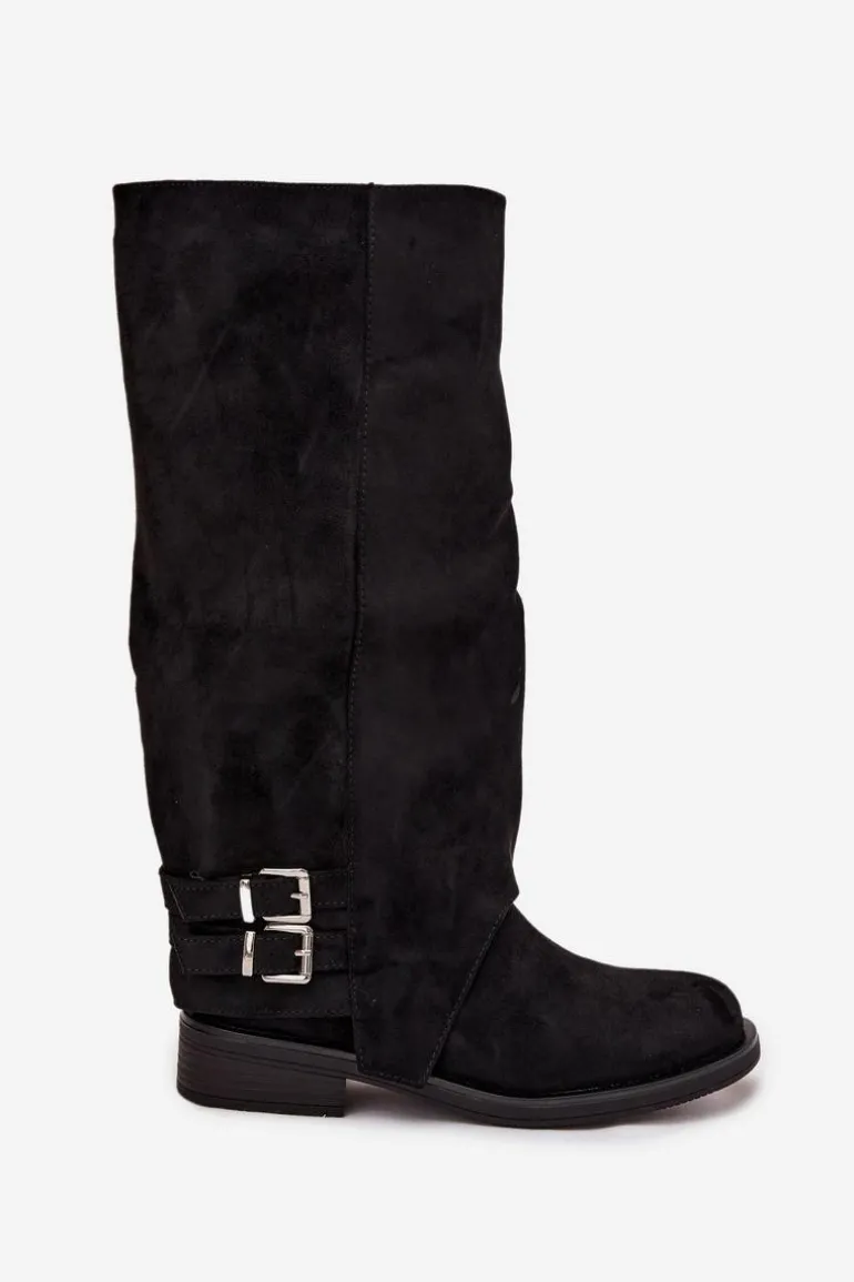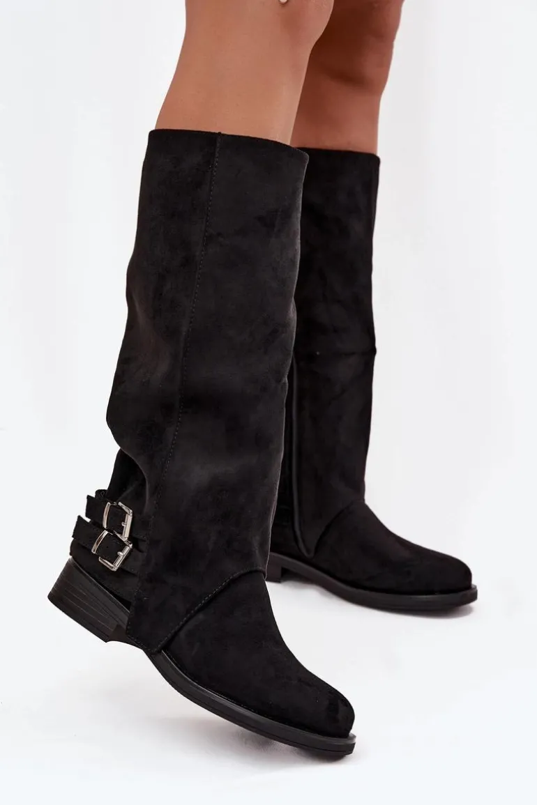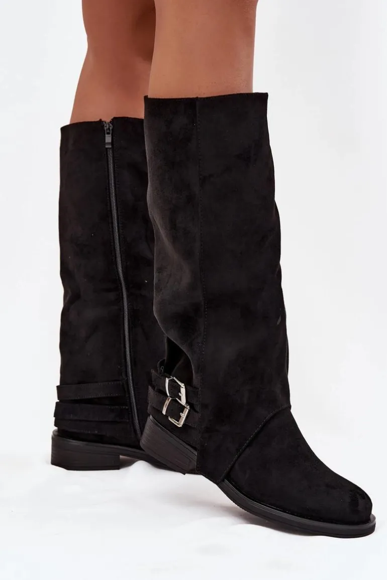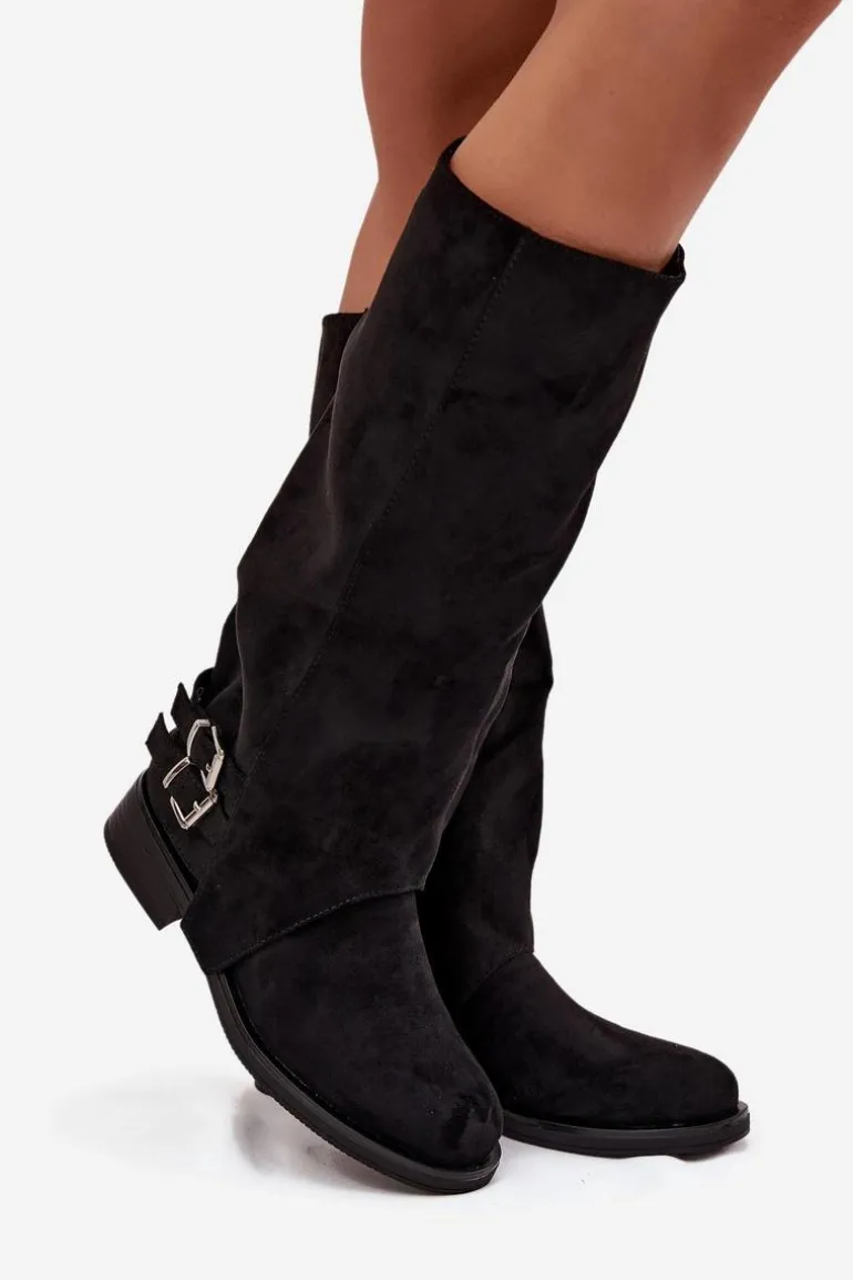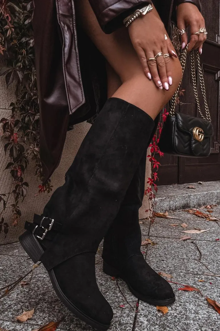 Kozaki z eko zamszu to hit sezonu! Wygodny płaski obcas i miękkie ocieplenie sprawiają, że są idealne na co dzień. Ozdobne paski z klamrami u dołu cholewki nadają im charakteru i modnego looku, a zamek z boku ułatwia szybkie zakładanie. Świetnie wyglądają zarówno z jeansami, jak i z sukienką czy spódnicą – idealne dla kobiet, które cenią styl i wygodę w jednym. Przy wyborze rozmiaru prosimy sugerować się tabelą rozmiarów.