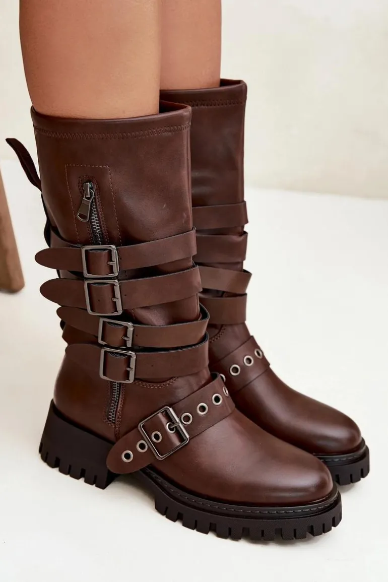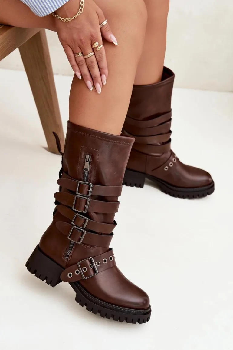 Kozaki damskie z cholewką do połowy łydki to stylowa i praktyczna propozycja na chłodniejsze dni. Model wsuwany z dodatkowym suwakiem zapewnia wygodę zakładania i dobre dopasowanie do nogi. Stabilny obcas w formie klocka gwarantuje komfort podczas chodzenia, a ozdobne paski z klamrami nadają całości charakteru i modnego, wyrazistego wyglądu. To kozaki, które doskonale sprawdzą się w codziennych stylizacjach, dodając im oryginalnego akcentu. Przy wyborze rozmiaru prosimy sugerować się tabelą rozmiarów.