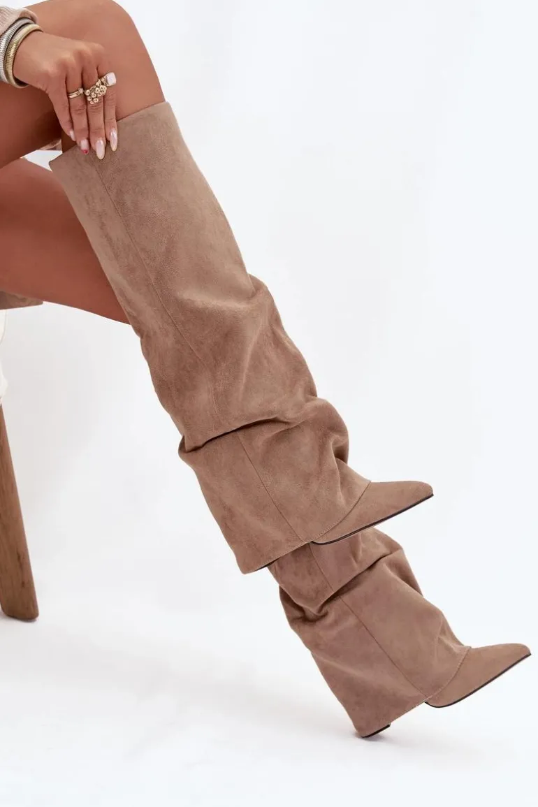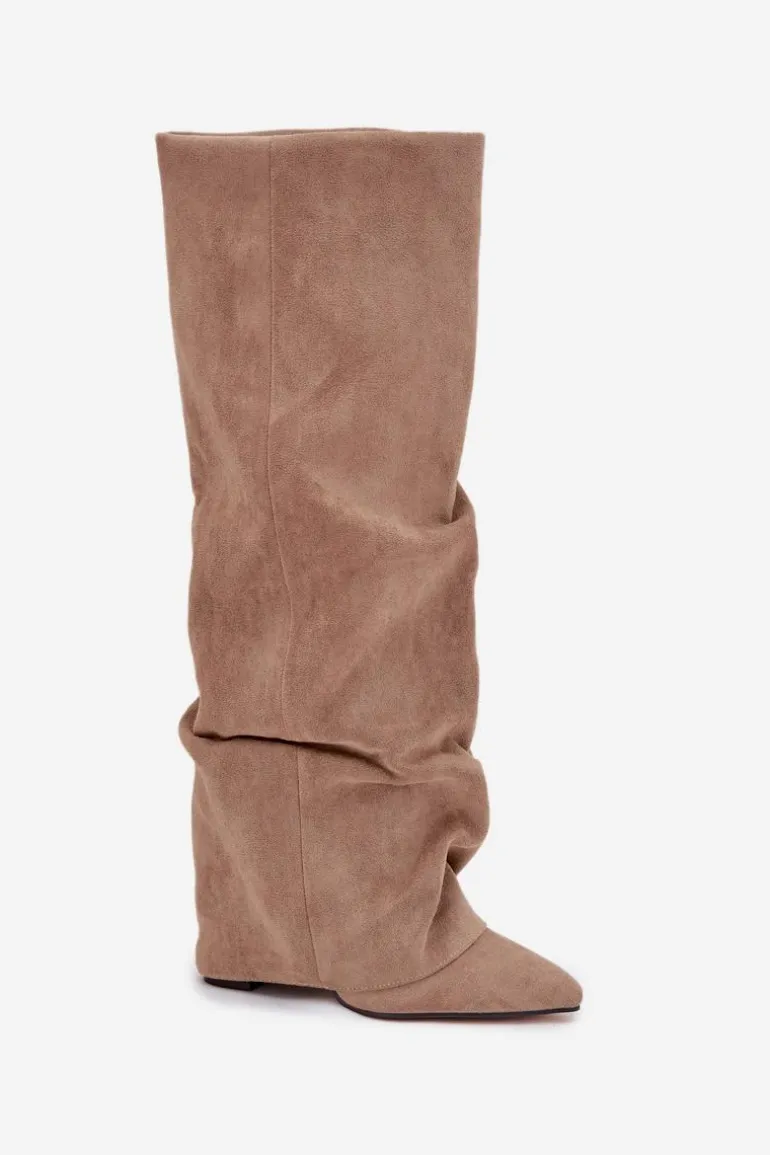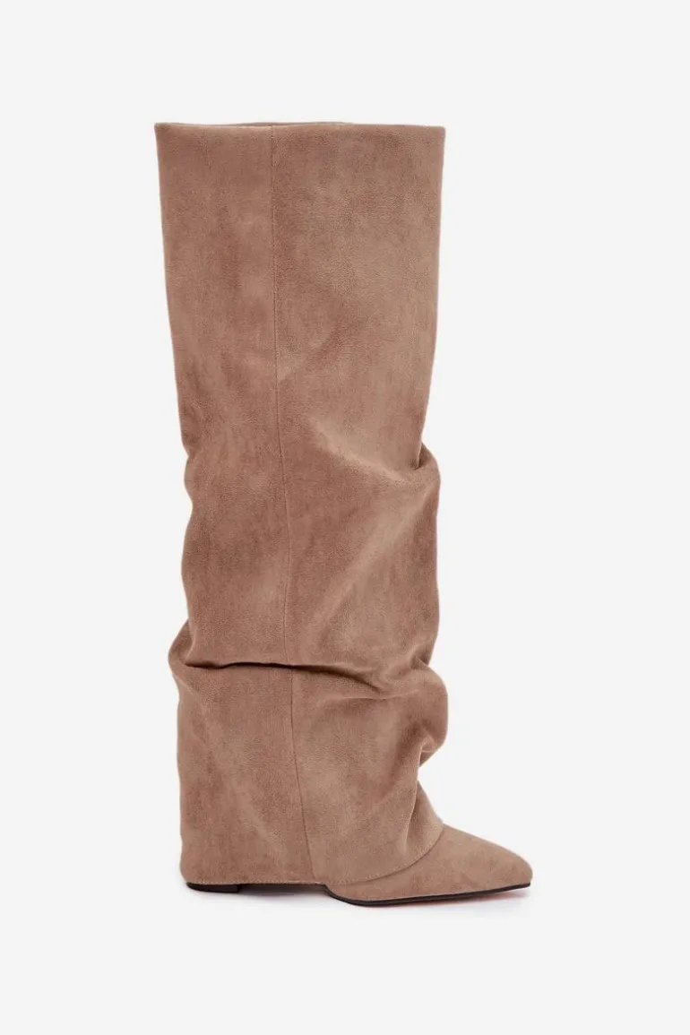 Kozaki damskie z wywiniętą cholewką to prawdziwy must-have na nadchodzący sezon jesienno-zimowy! Wsuwane i osadzone na stabilnym obcasie typu słupek, gwarantują wygodę i pewny krok. Ocieplenie zapewnia komfort w chłodniejsze dni, a wywinięta cholewka, nachodząca na obcas, dodaje im oryginalnego charakteru. Szpiczaste noski podkreślają kobiecy styl, dzięki czemu kozaki świetnie sprawdzą się w efektownych, zimowych stylizacjach. Przy wyborze rozmiaru prosimy sugerować się tabelą rozmiarów.