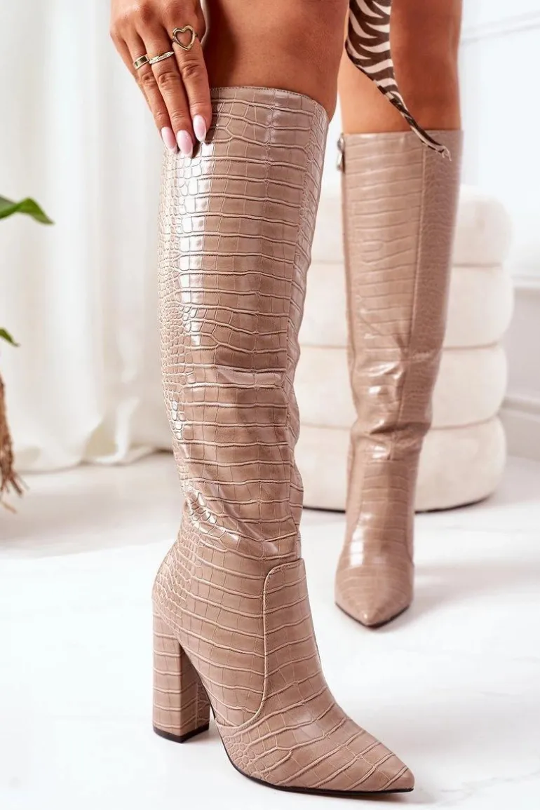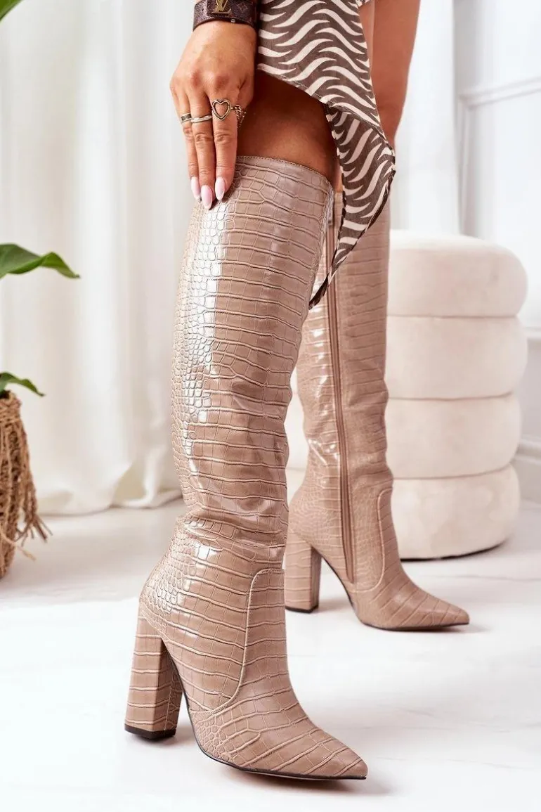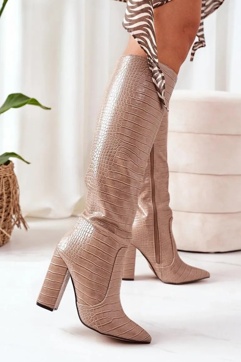 Piękne kozaki na słupku wykonane z eko skóry. Buty ocieplone są kocem obuwniczym. Przy wyborze rozmiaru prosimy sugerować się tabelą rozmiarów.