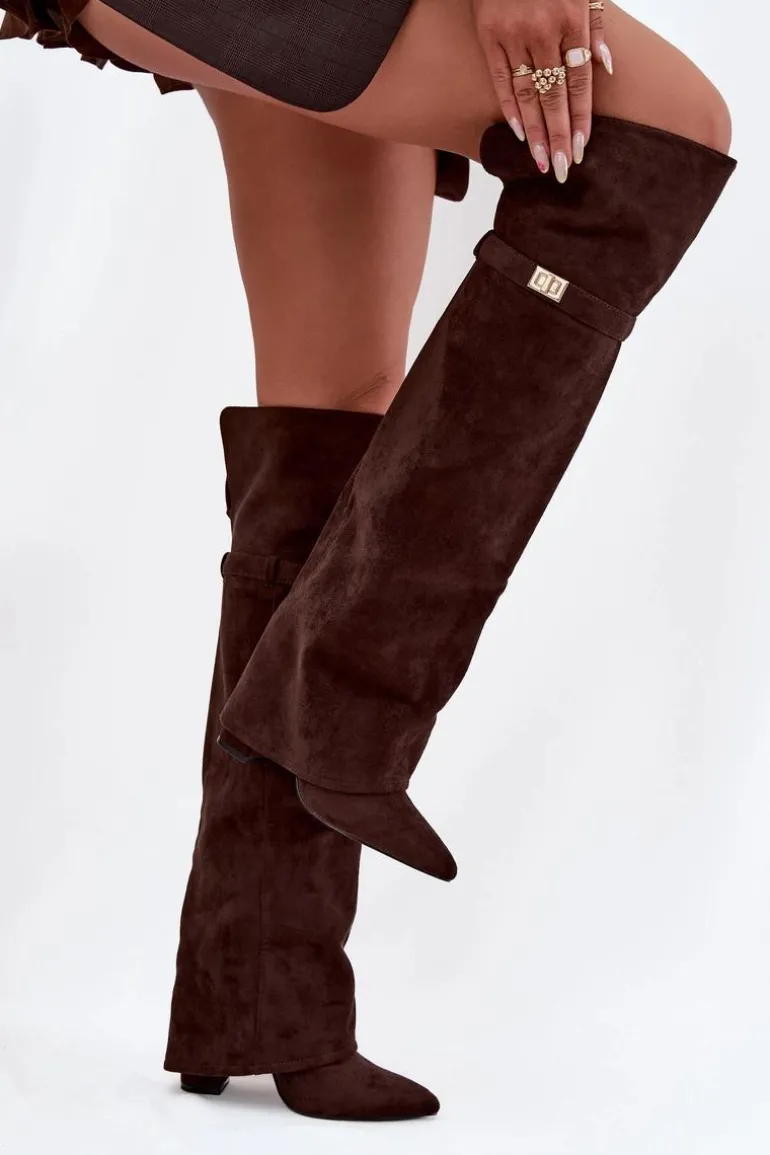 Kozaki damskie z wywiniętą cholewką to prawdziwy hit nadchodzącego sezonu jesienno-zimowego! Cholewka sięga za kolano i nachodzi na obcas dodaje im niepowtarzalnego charakteru. Osadzone na stabilnym obcasie typu słupek, zapewniają komfort i elegancję, a ocieplenie gwarantuje ciepło w chłodniejsze dni. Wsuwane i z noskami w szpic, łączą w sobie wygodę z modnym, kobiecym stylem – idealne do tworzenia efektownych, zimowych stylizacji. Przy wyborze rozmiaru prosimy sugerować się tabelą rozmiarów.