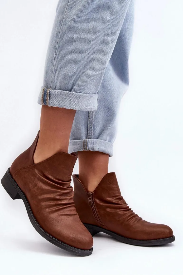 Niskie botki damskie wykonane z eko skóry. Osadzone na płaskim, stabilnym obcasie. Cholewka z wycięciami na bokach. Z przodu marszczenie. Środek ocieplony kocem obuwniczym. Noski zaokrąglone. Model ten zapinany jest na suwak z boku. Przy wyborze rozmiaru prosimy sugerować się tabelą rozmiarów.