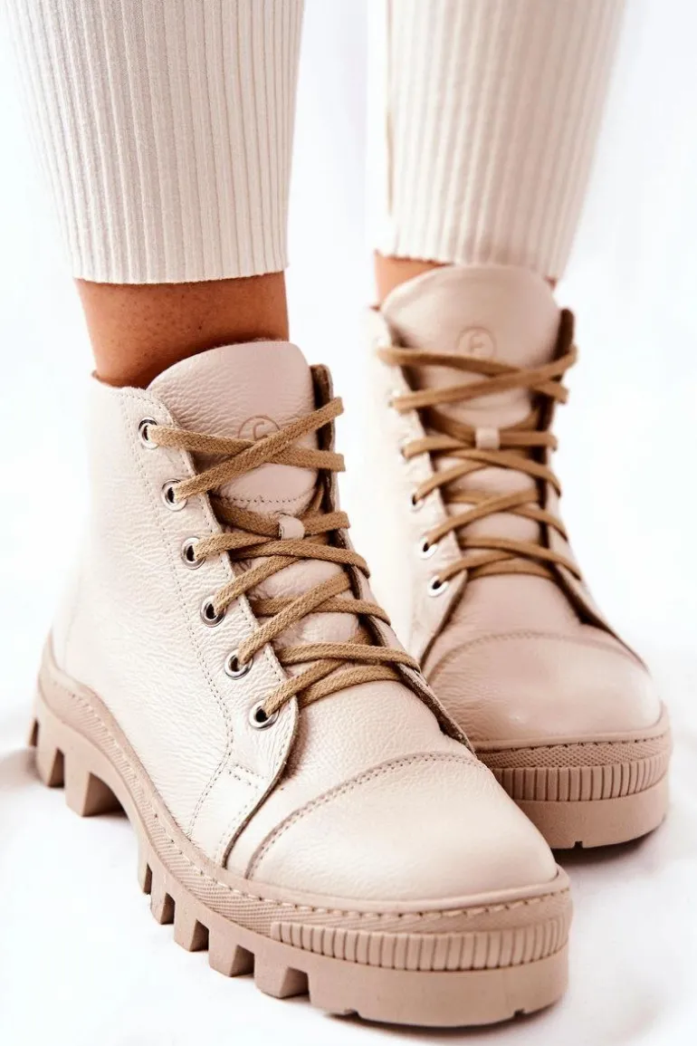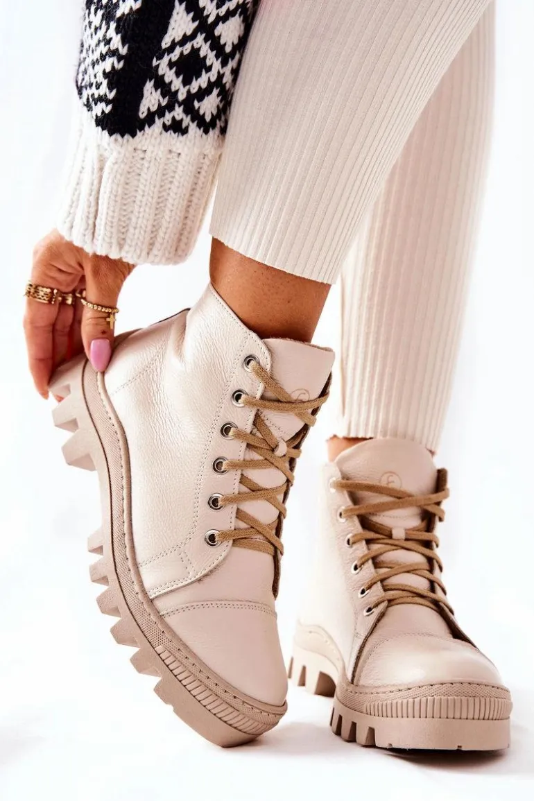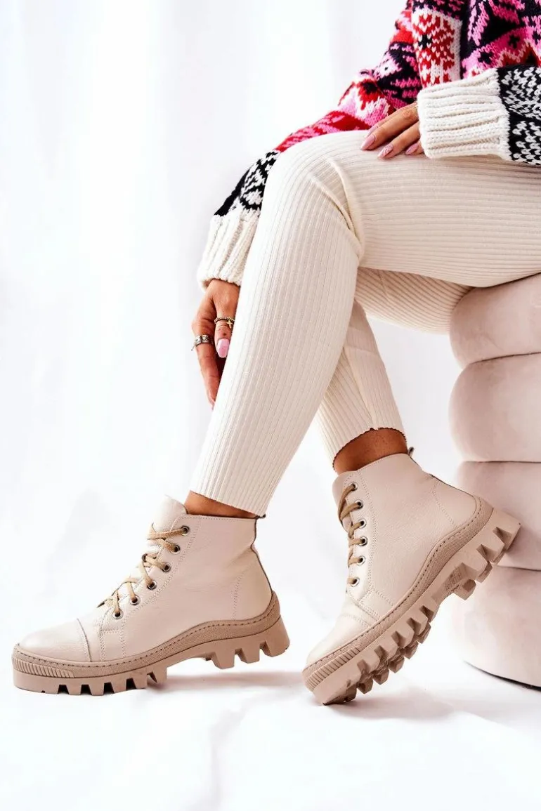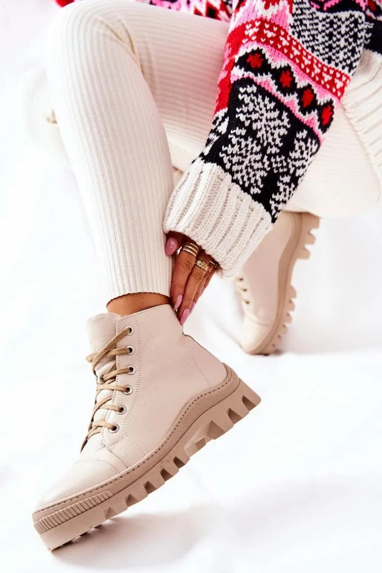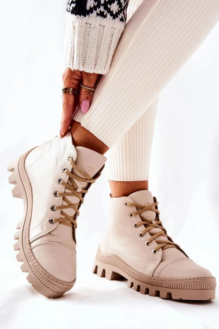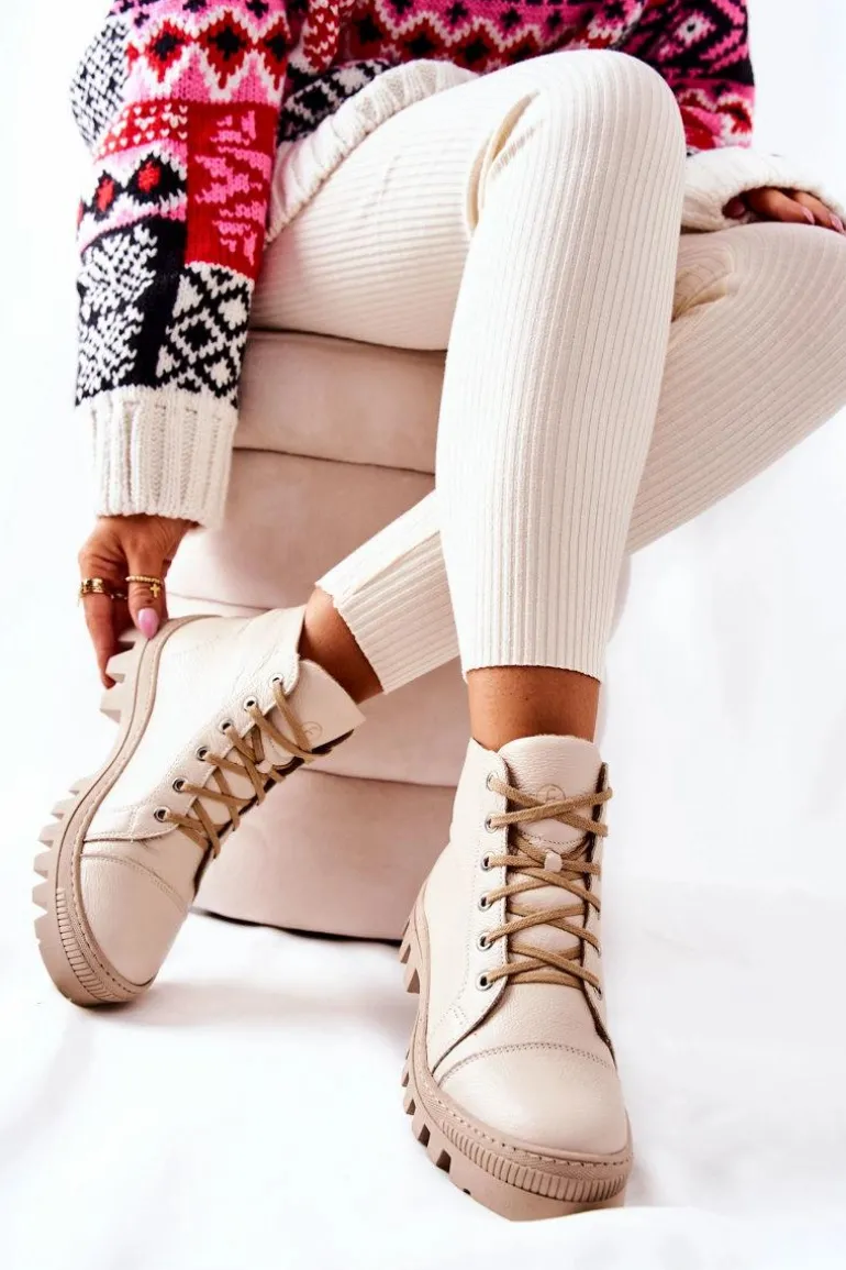 Ocieplane Skórzane Botki Trapery Beżowe Madisson