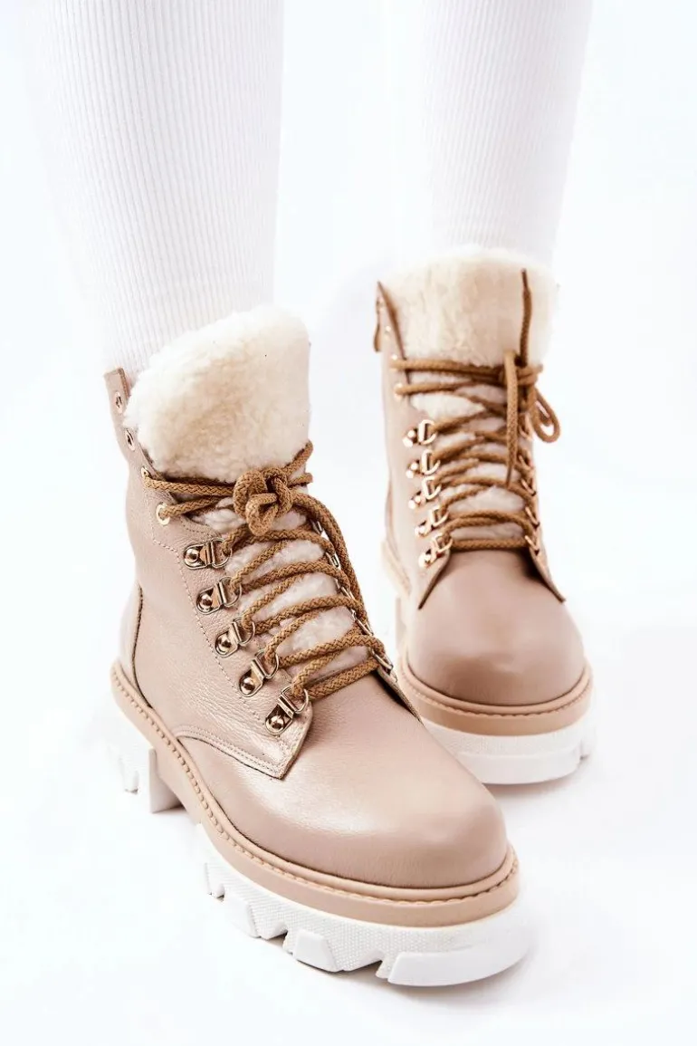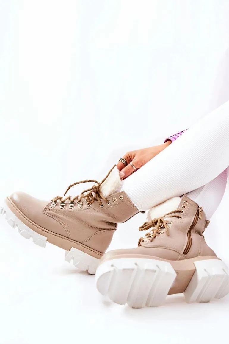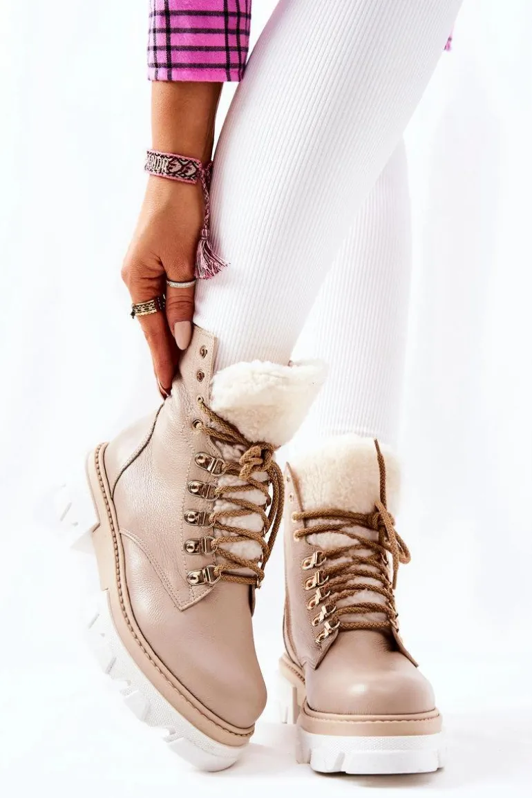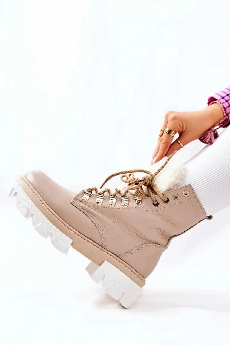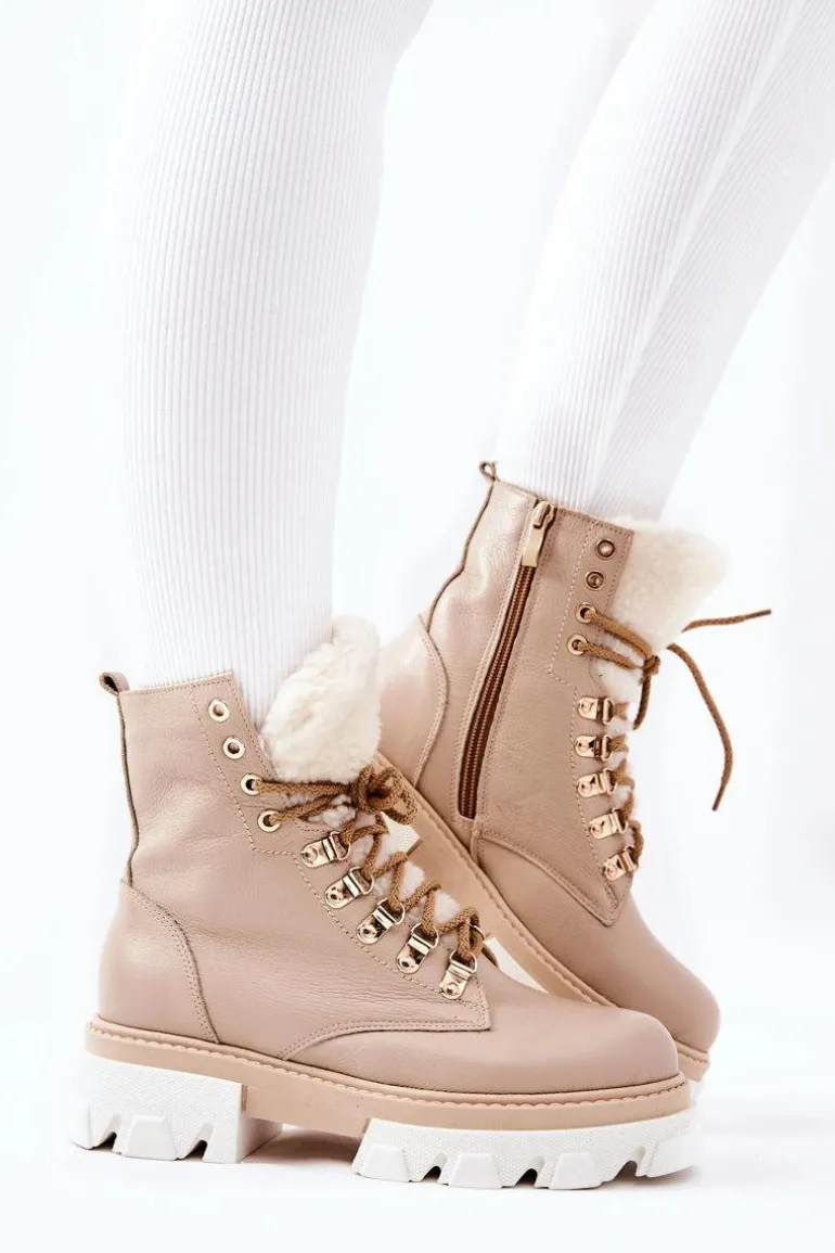 Ocieplane Skórzane Botki Workery Beżowe Lecolly