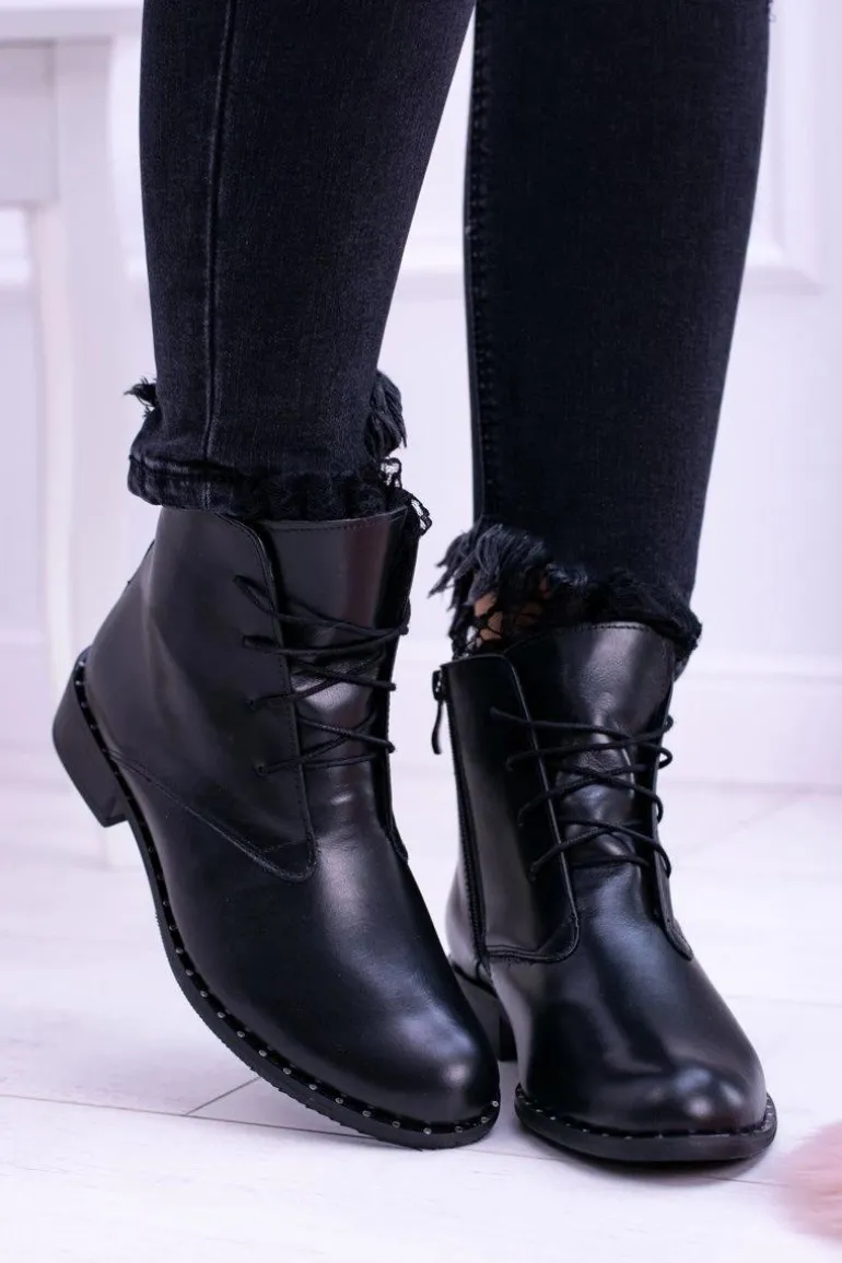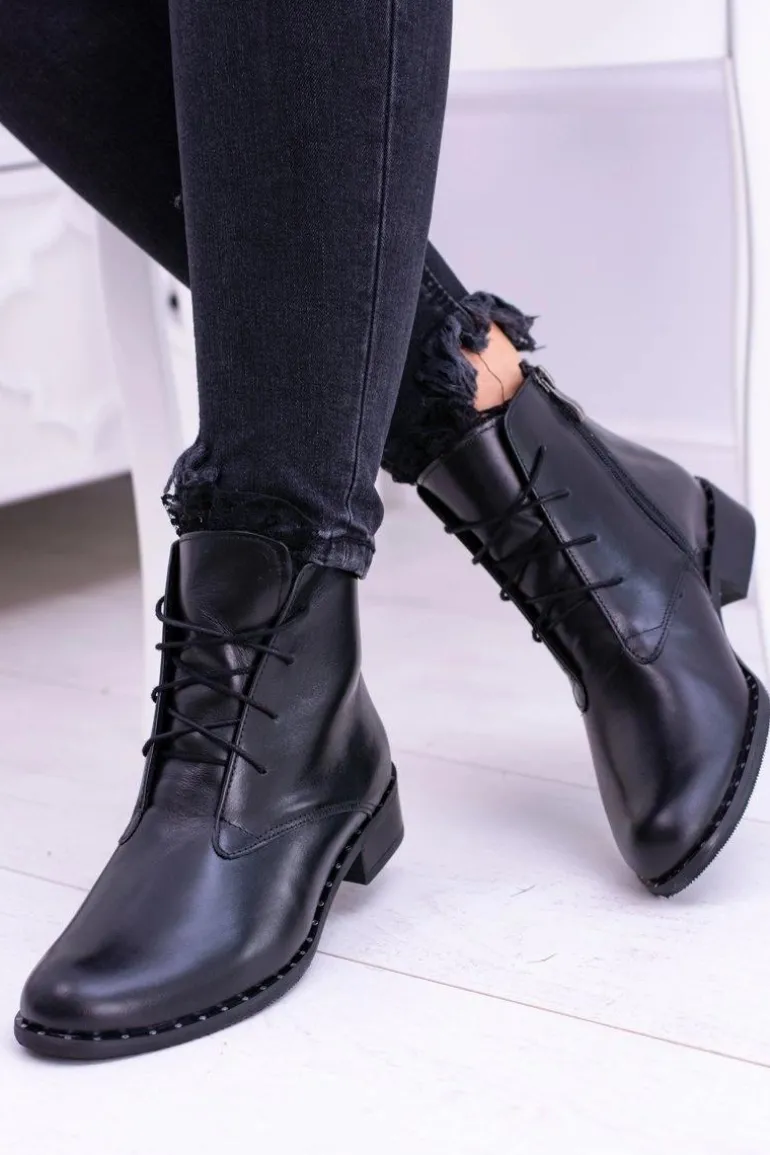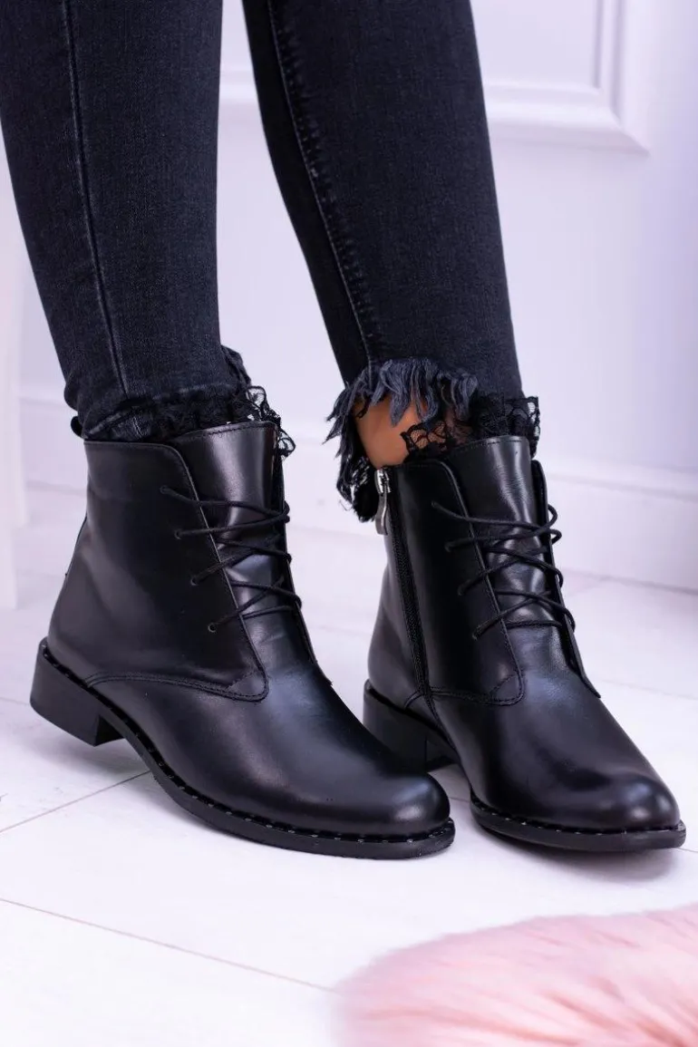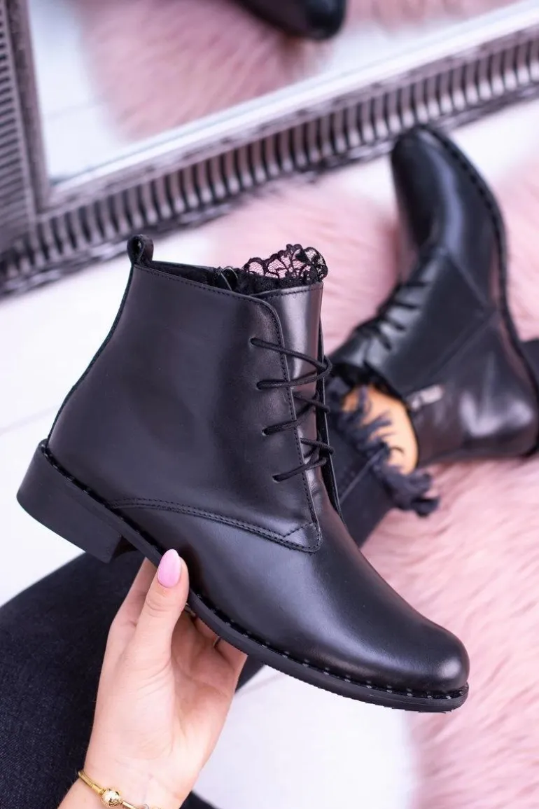Ocieplane Skórzane Czarne Damskie Botki Z Koronką Millano