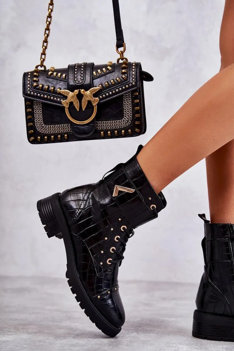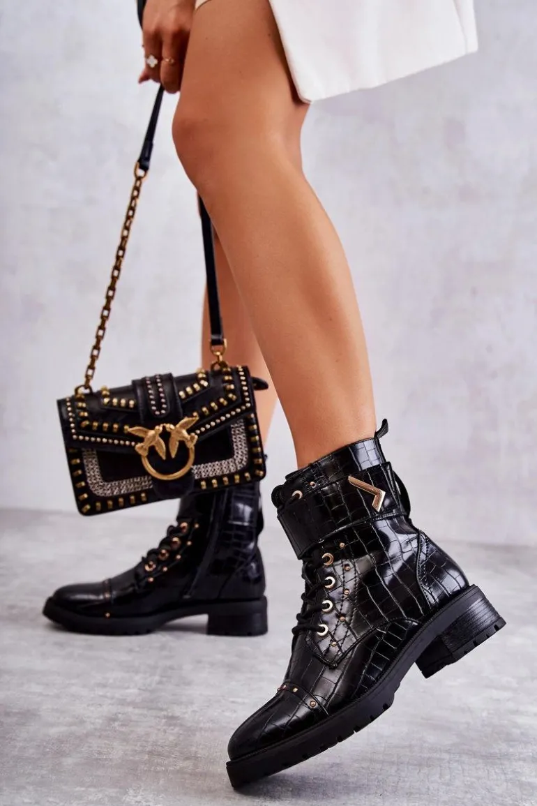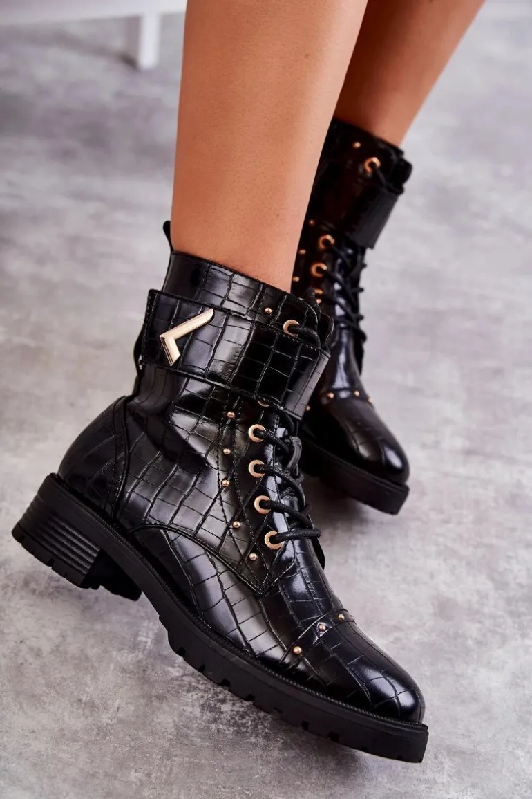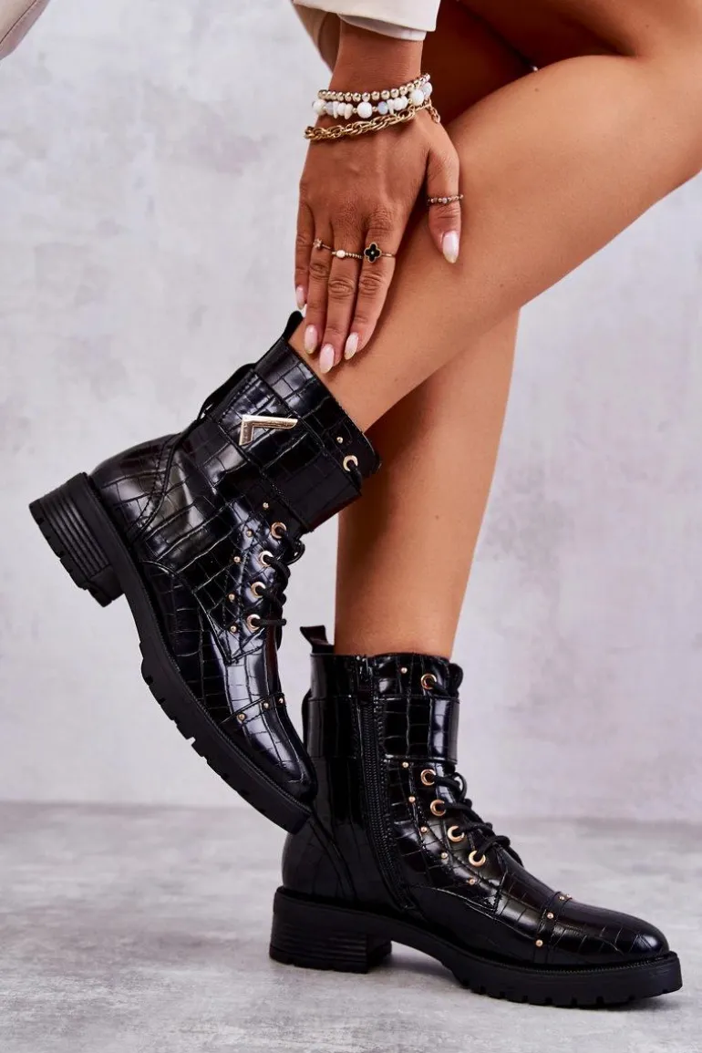 Wykonane ze skóry ekologicznej. Posiadają ocieplenie w postaci przyjemnego w dotyku koca obuwniczego. Klasyczny fason ze sznurowaniem oraz zapinaniem z boku cholewki. Botki posiadają także ozdobny pasek zapinany na rzep. Przy wiązaniu oraz na przodzie buta występują ozdobne elementy w postaci dżetów. Niski obcas sprawia, że botki są niezwykle stabilne. Przy wyborze rozmiaru prosimy sugerować się tabelą rozmiarów.