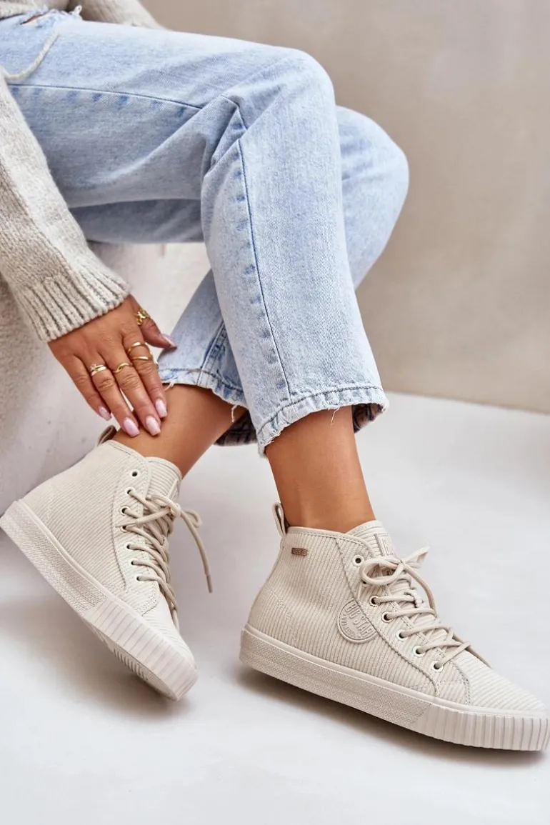 Trampki damskie z prążkowaną cholewką od marki Big Star. Wykonane z materiału tekstylnego. Osadzone na podeszwie z gumowego tworzywa. Noski zaokrąglone. Środek ocieplany futerkiem typu baranek. Dodatkowo model ten posiada wkładkę HI-POLY SYSTEM, która jest oddychająca, absorbuje wilgoć, amortyzuje wstrząsy oraz jest odporna na ścieranie i odkształcenia. Przy wyborze rozmiaru prosimy sugerować się poniższą tabelą rozmiarów.