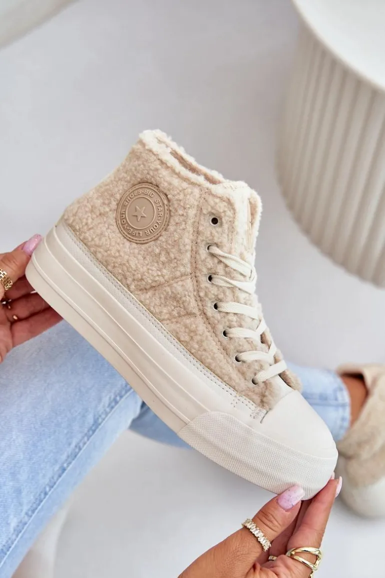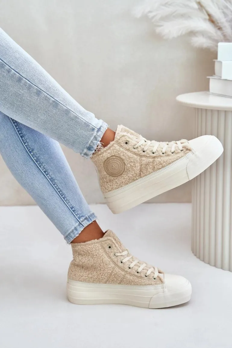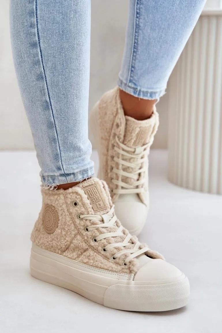 Damskie trampki marki BIG STAR Wykonane z modnym futerkiem typu baranek. Środek ocieplany kocem obuwniczym, co gwarantuje ciepło w chłodniejsze dni. Osadzone na platformie, która świetnie odizoluje od zimnego podłoża. Noski zaokrąglone. Ten stylowy fason powinnaś mieć w swojej jesienno-zimowej garderobie. Przy wyborze rozmiaru prosimy sugerować się tabelą rozmiarów.