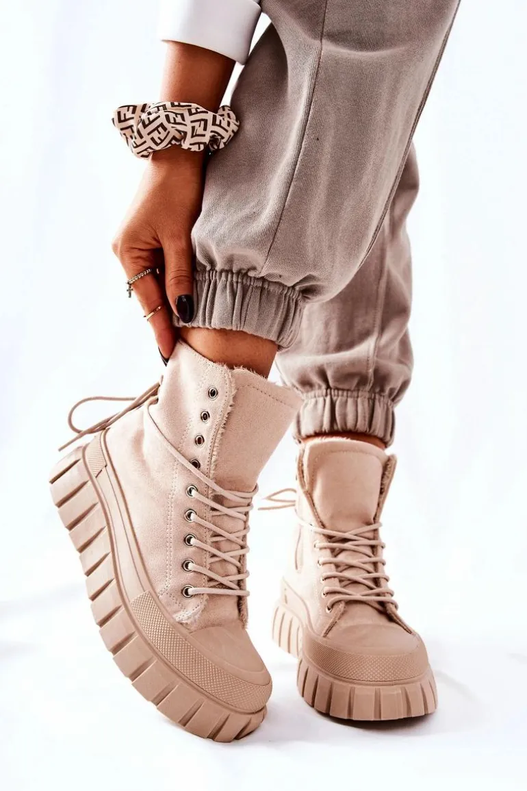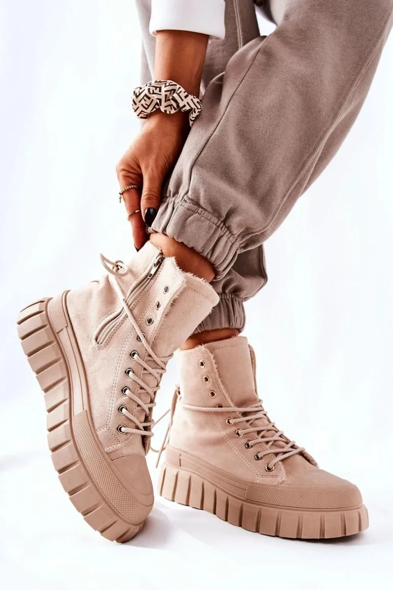Wysokie trampki zostały wykonane z eko zamszu. Posiadają masywną platformę. Posiadają wiązanie, które można dopasować do tęgości nogi. Długie sznurówki sprawiają, że można je modnie owinąć wokół cholewki i zawiązać. Z boku są zapinane na suwak. Trampki w środku posiadają ocieplenie w postaci delikatnego futerka. Przy wyborze rozmiaru prosimy sugerować się tabelą rozmiarów.
