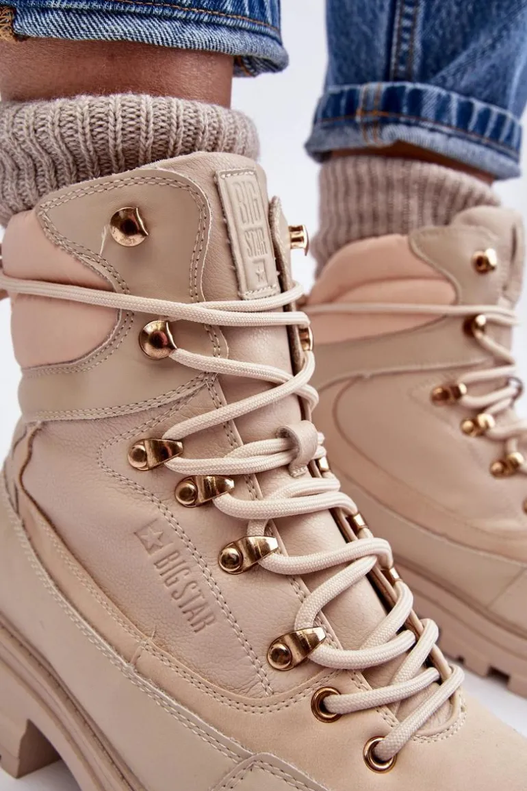 Damskie botki — trapery marki Big Star zostały wykonane z eko skóry. Osadzone na płaskim obcasie oraz platformie z gumowego tworzywa. Model klasycznie sznurowany. Środek ocieplony kocem obuwniczym. Zapiętek jest usztywniony. Noski zaokrąglone. Przy wyborze rozmiaru prosimy sugerować się tabelą rozmiarów.